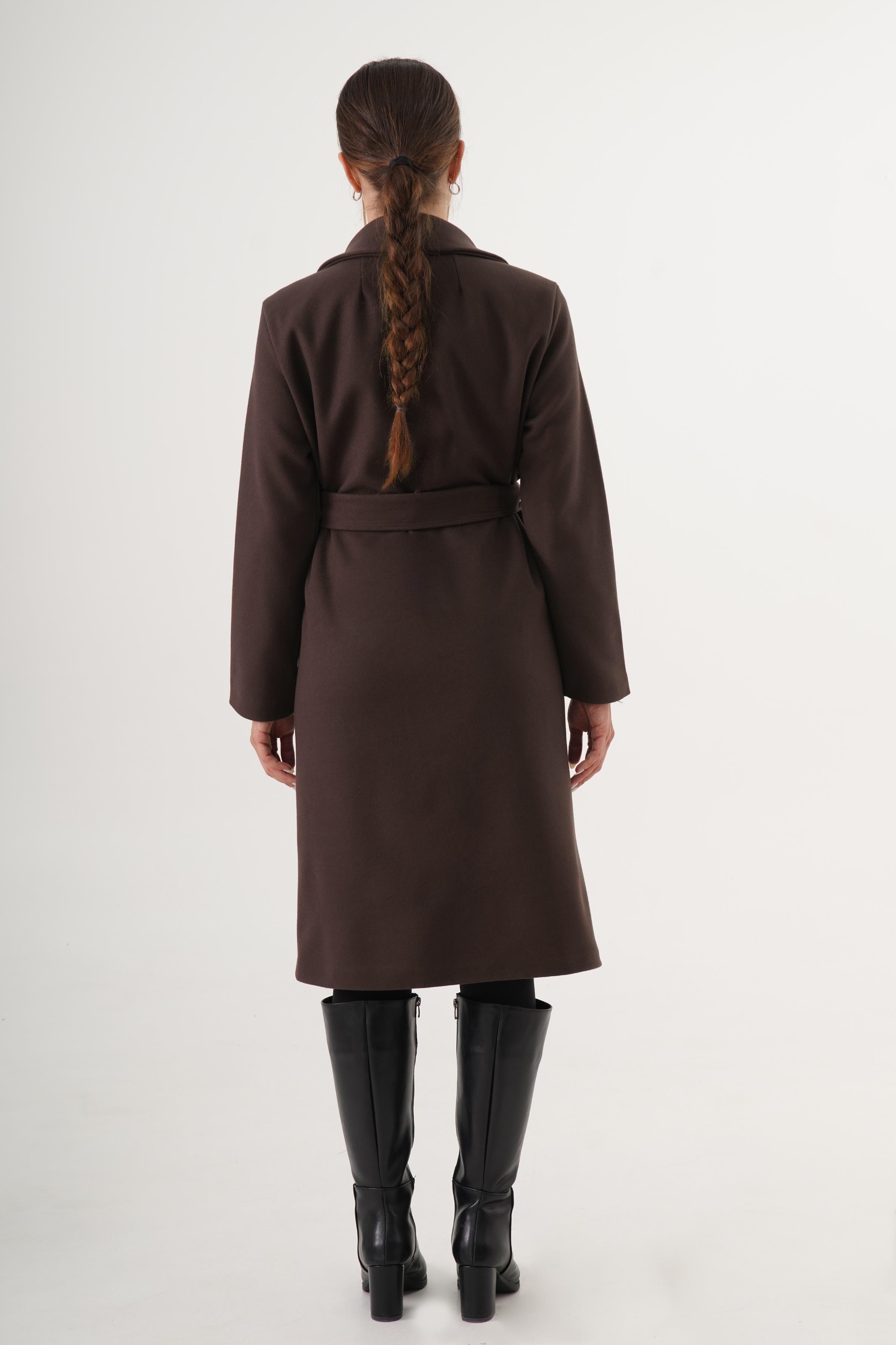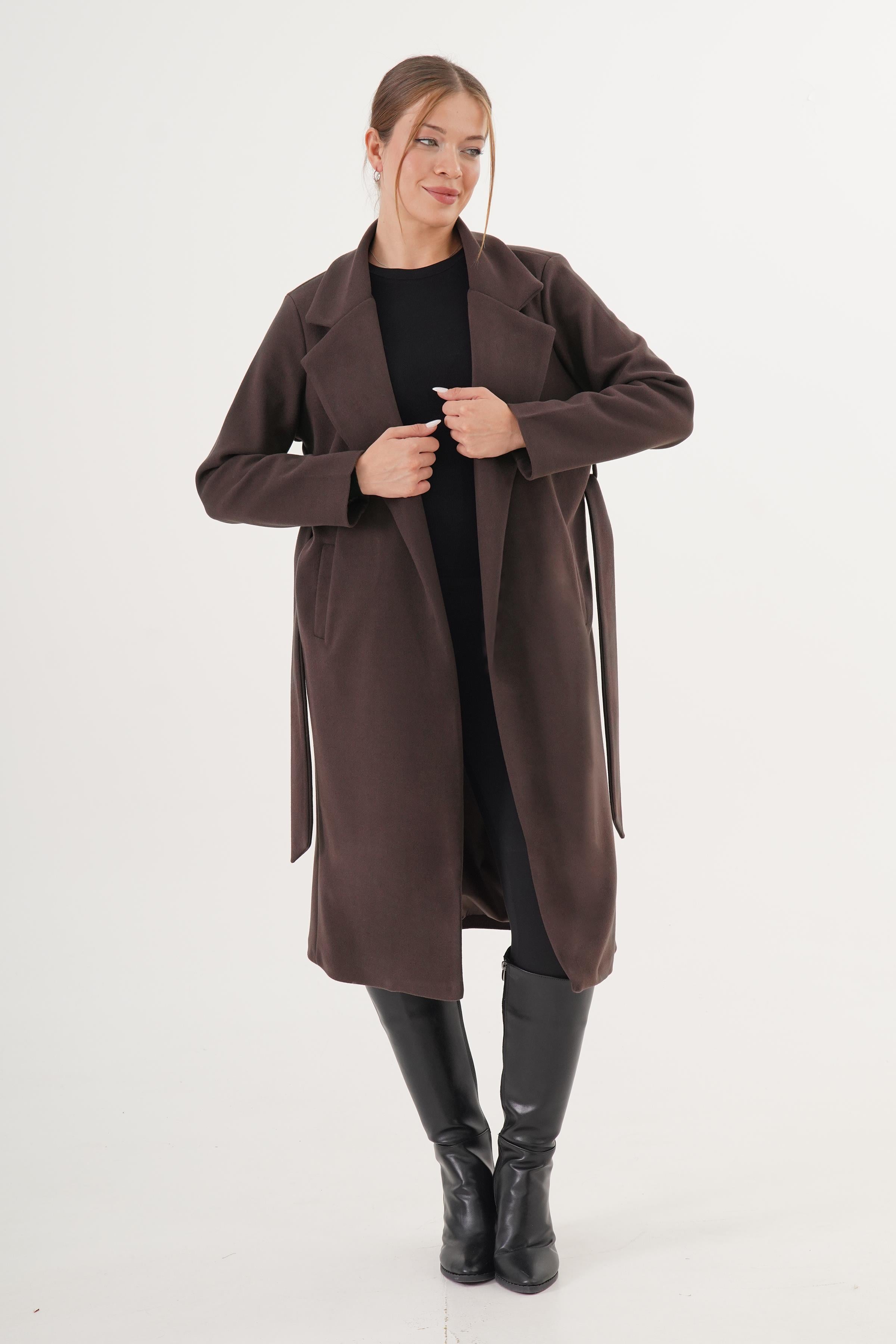 Beli Kuşaklı Astarlı Toptan Kahve Kaşe Kaban