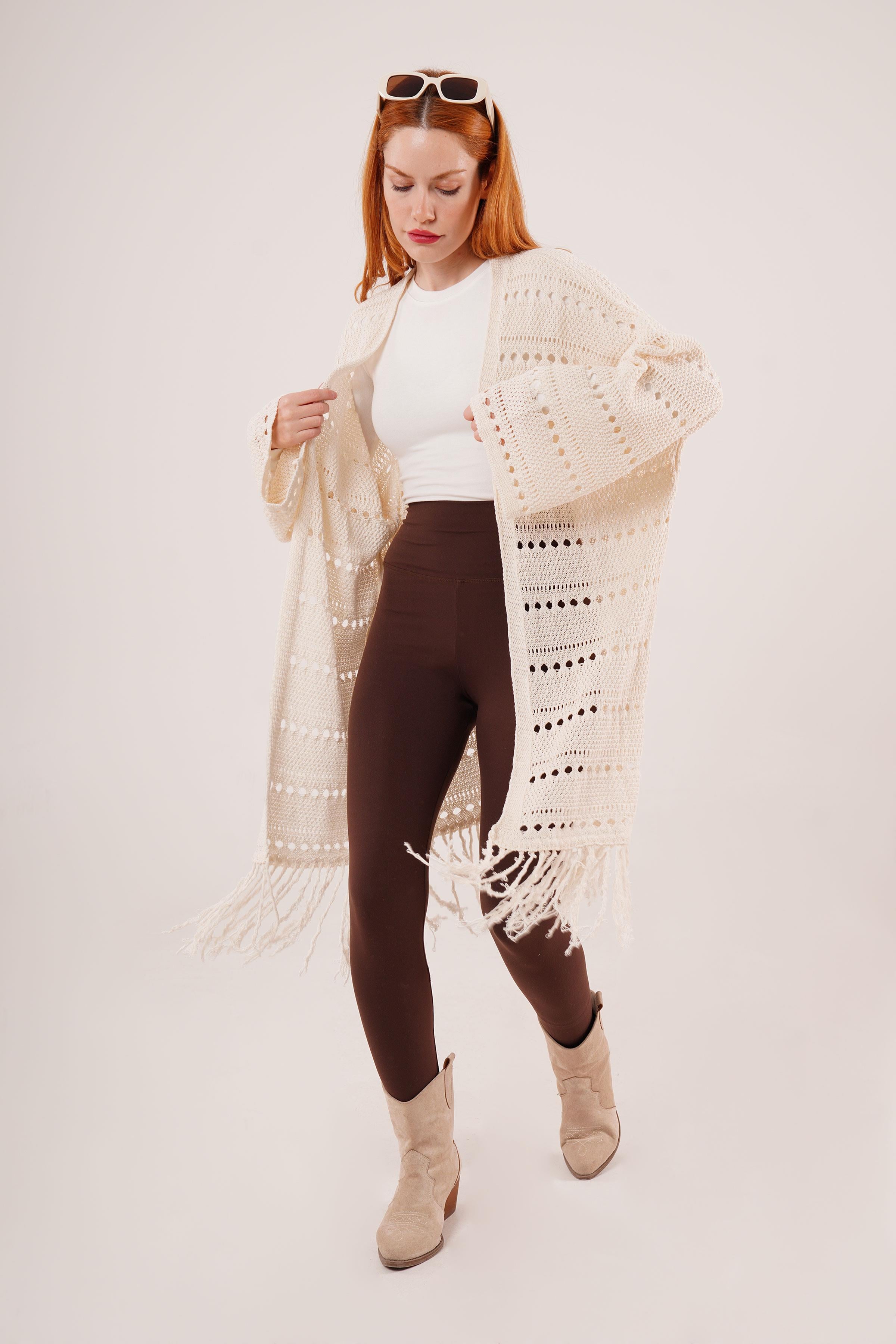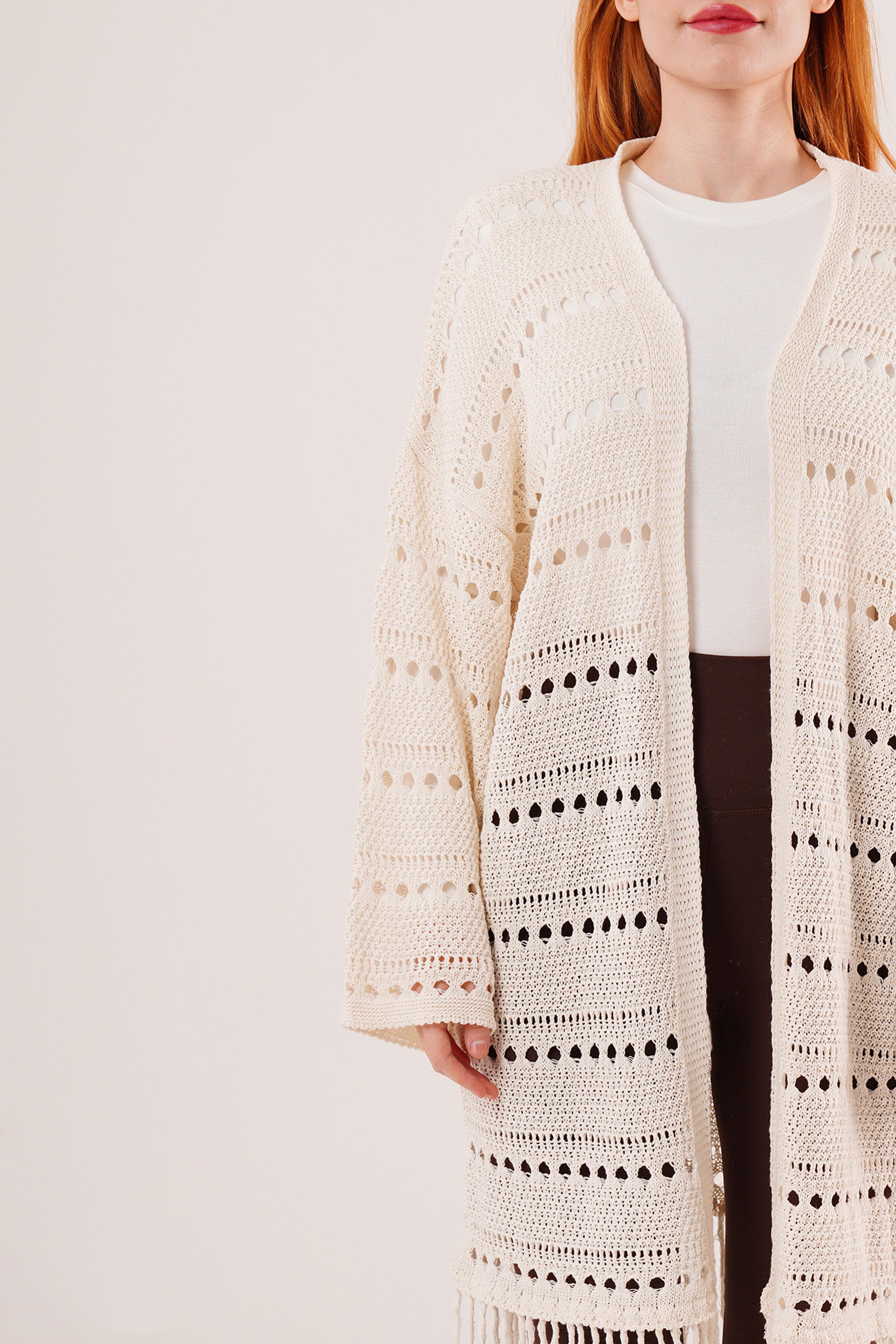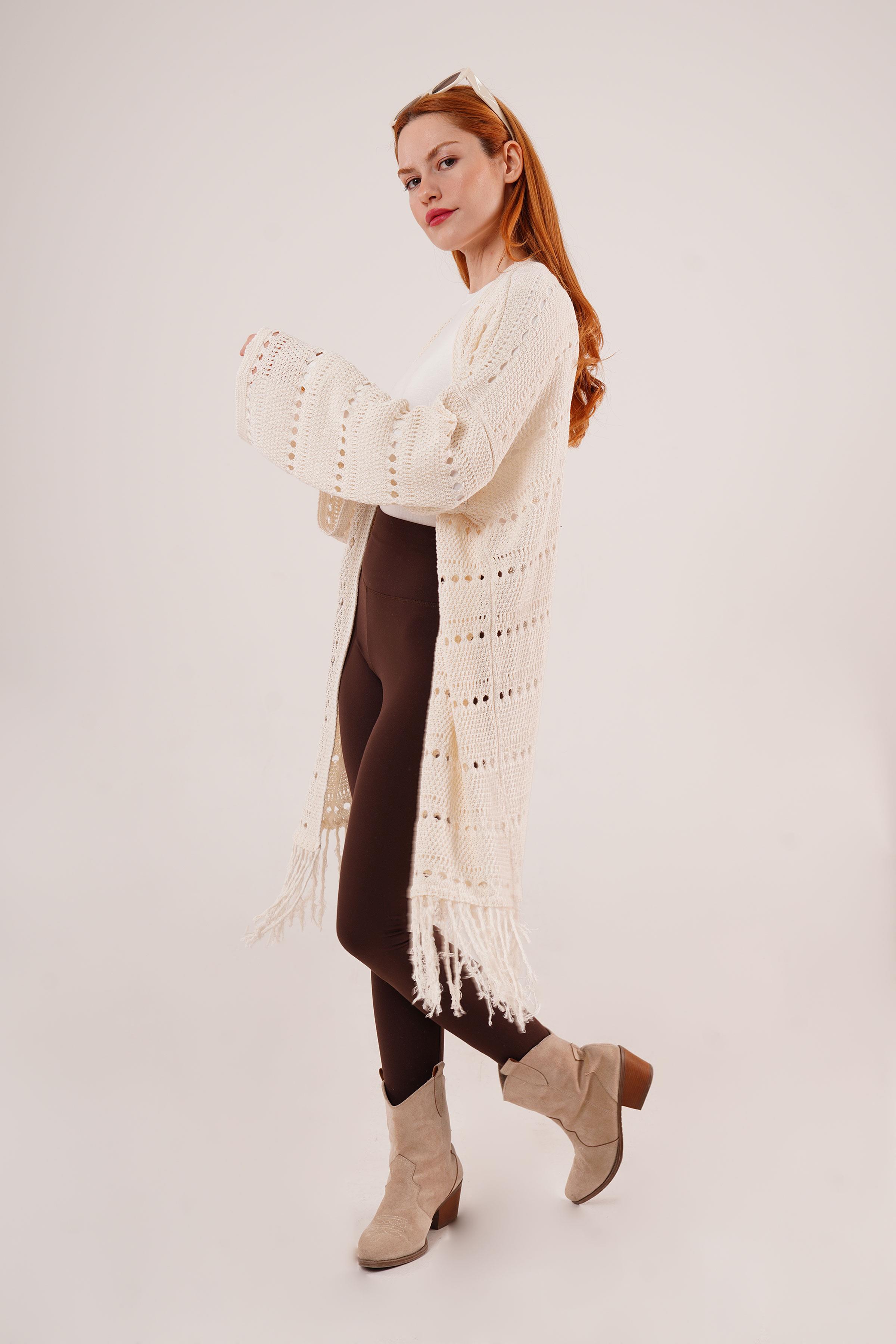 Delikli Geçişli Püskül Detay Uzun Triko Toptan Krem Hırka