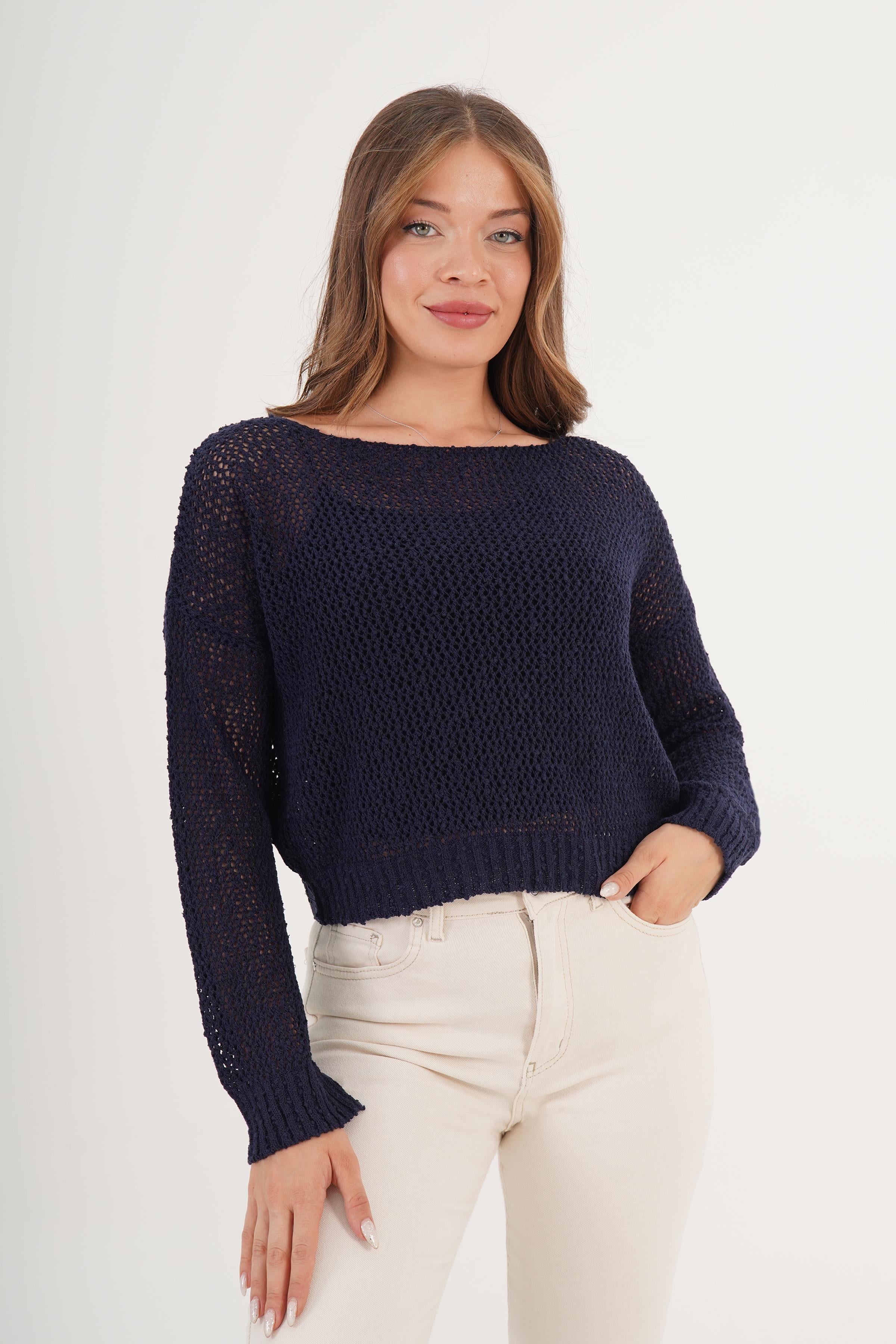 File Geniş Yaka Toptan Lacivert Örme Bluz