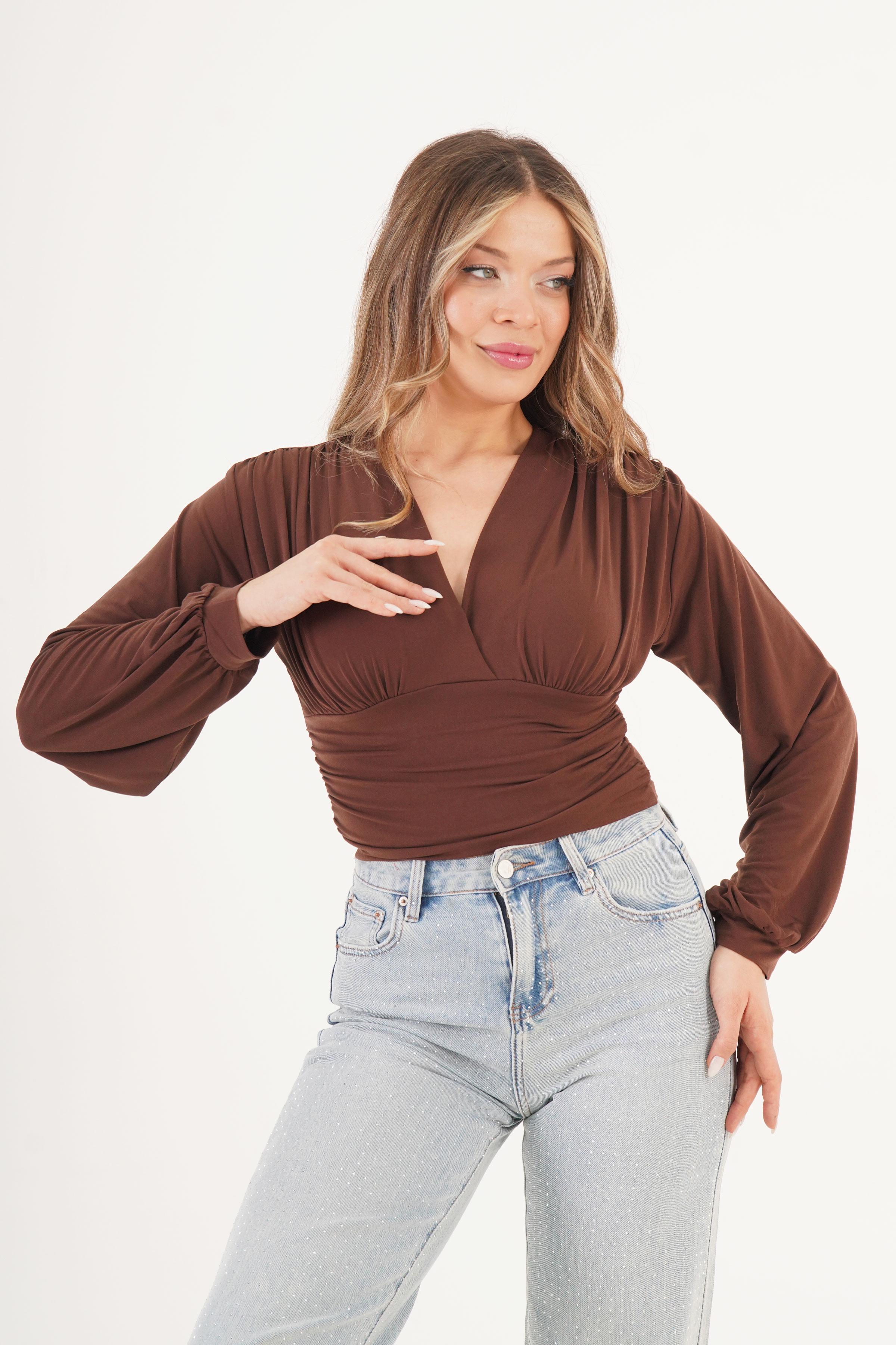Göğüs Drapeli V Yaka Kahve Toptan Bluz