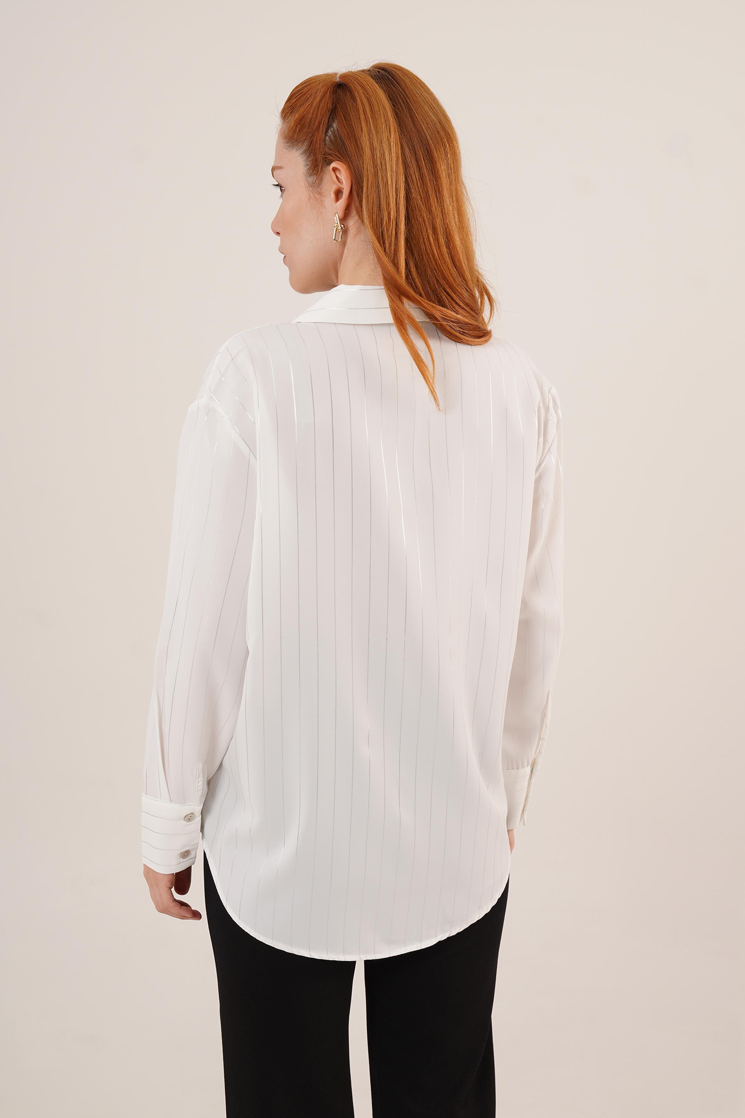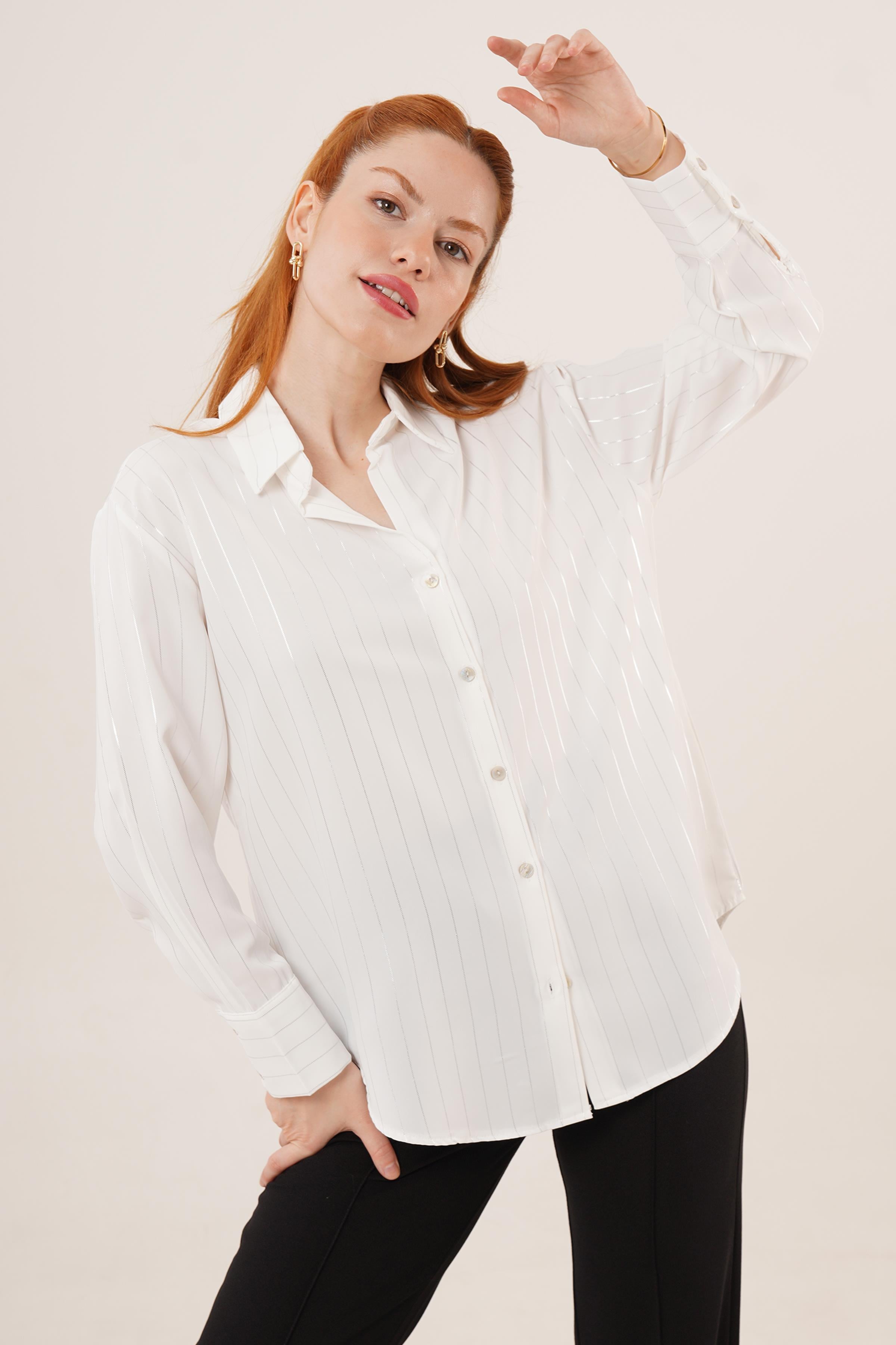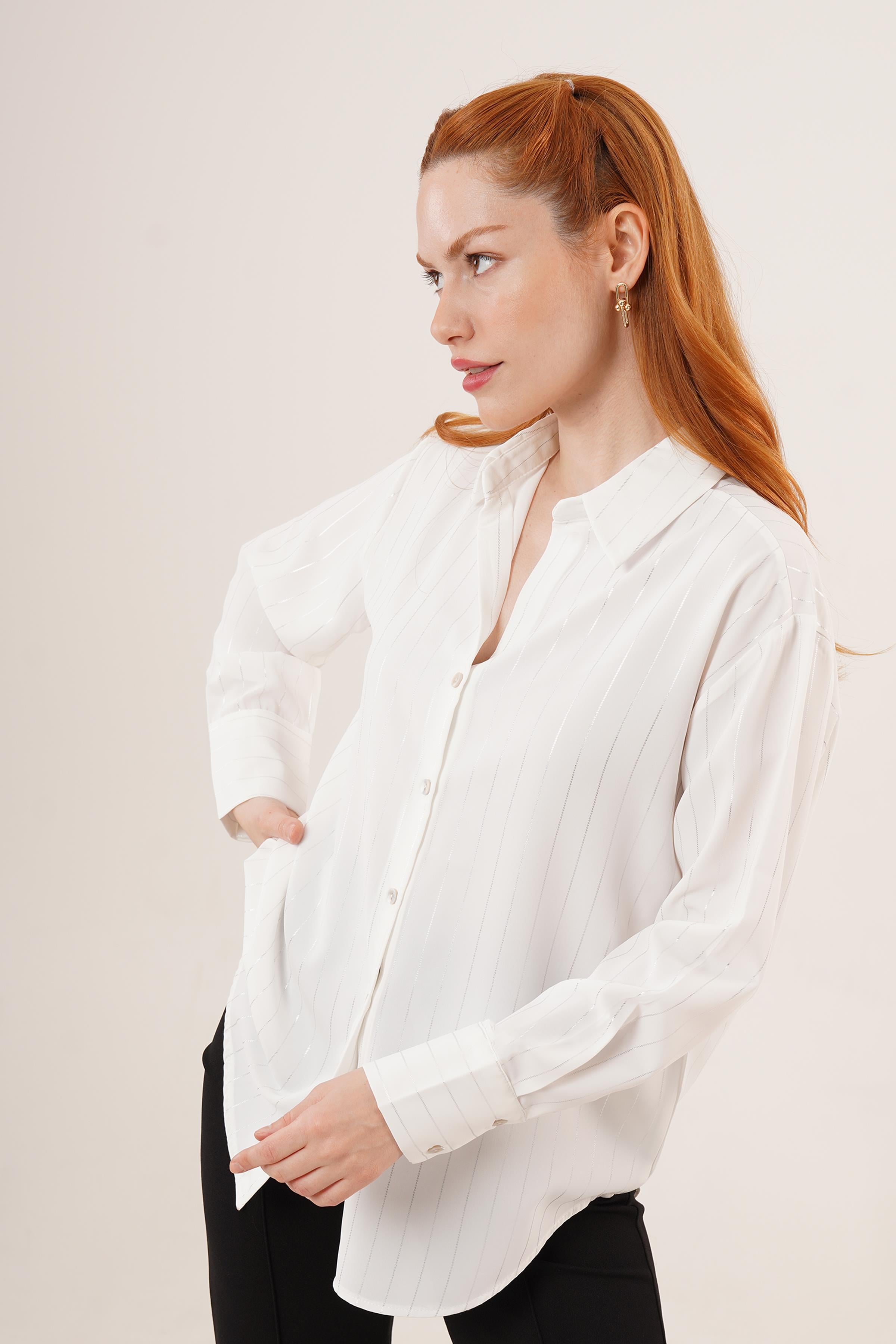 Gümüş Çizgili Düğmeli Beyaz Toptan Gömlek
