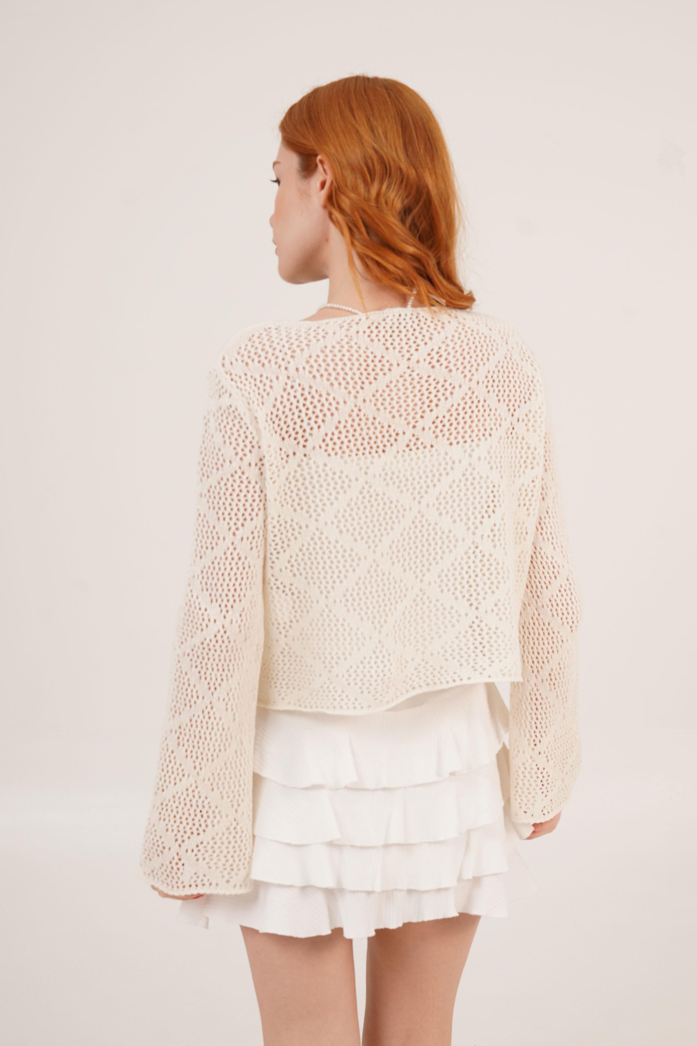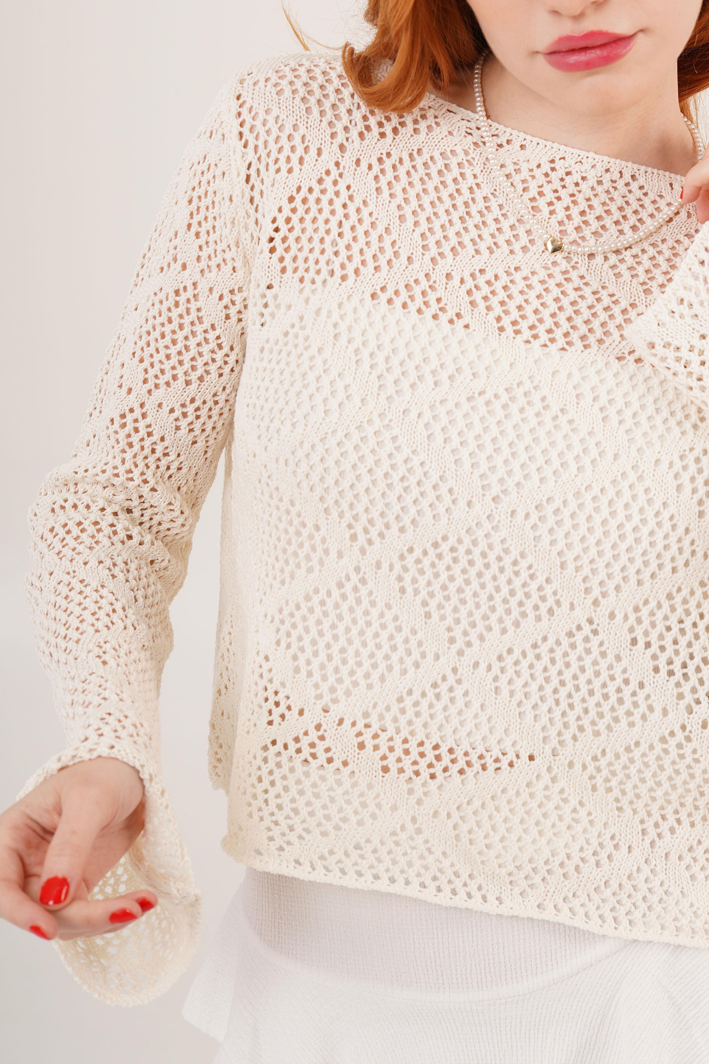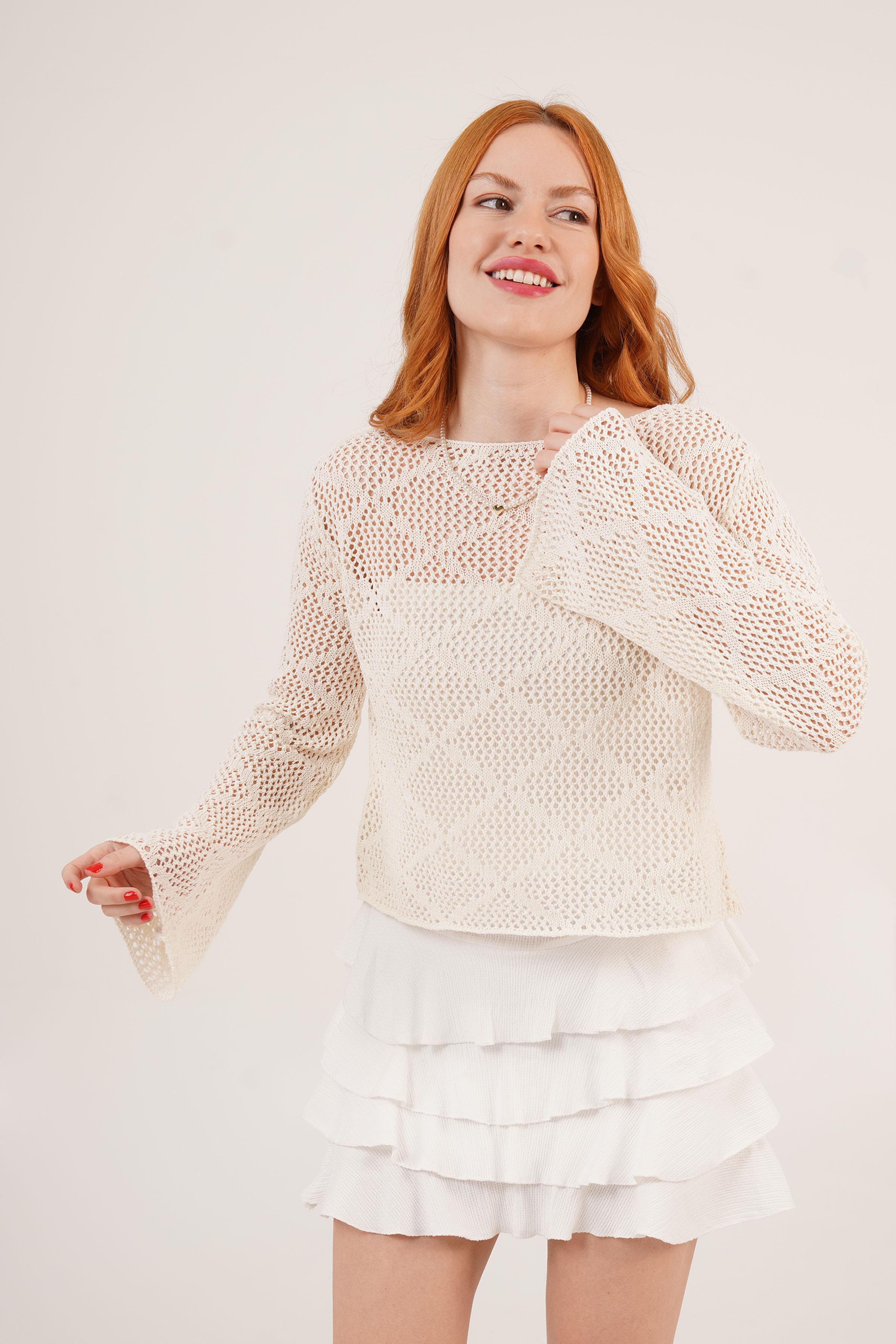 Kayık Yaka Volan Kol Detaylı Ajurlu Toptan Ekru Bluz