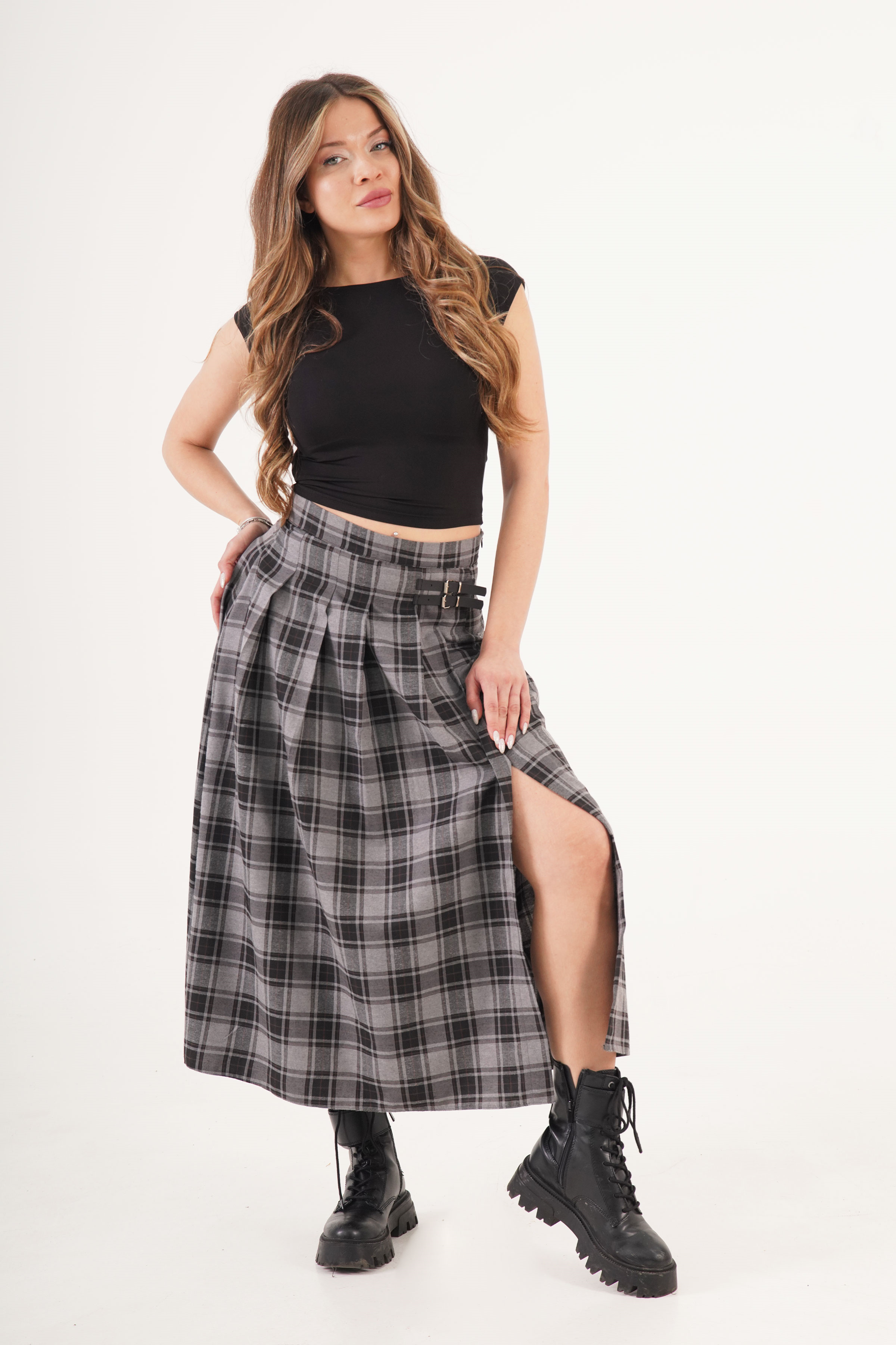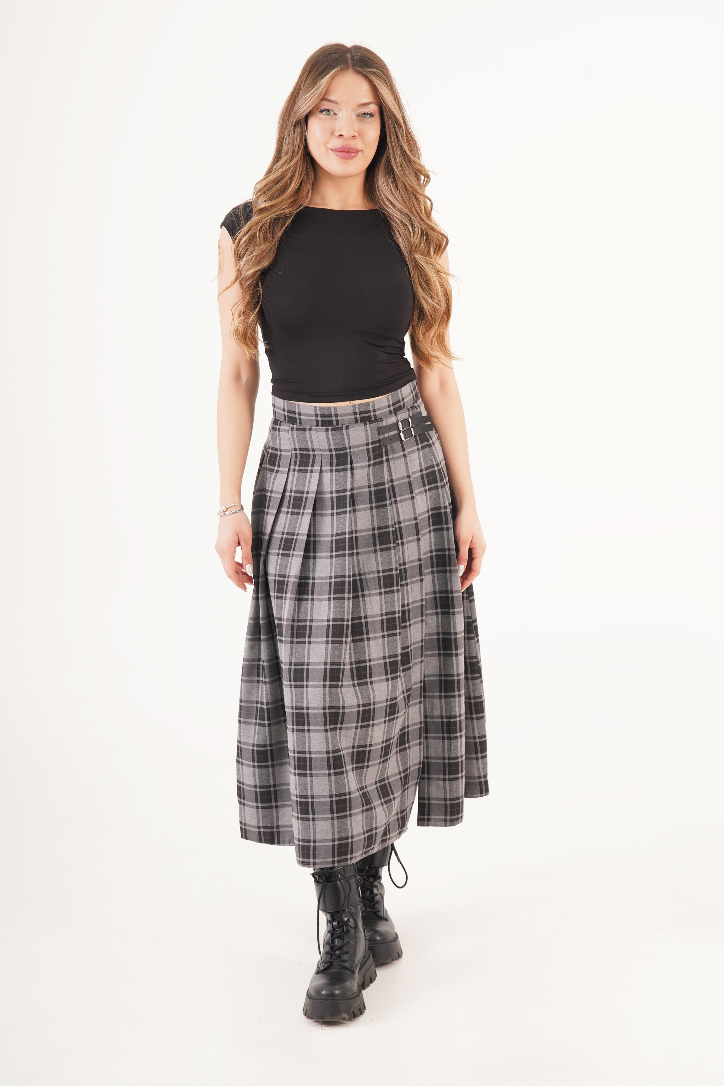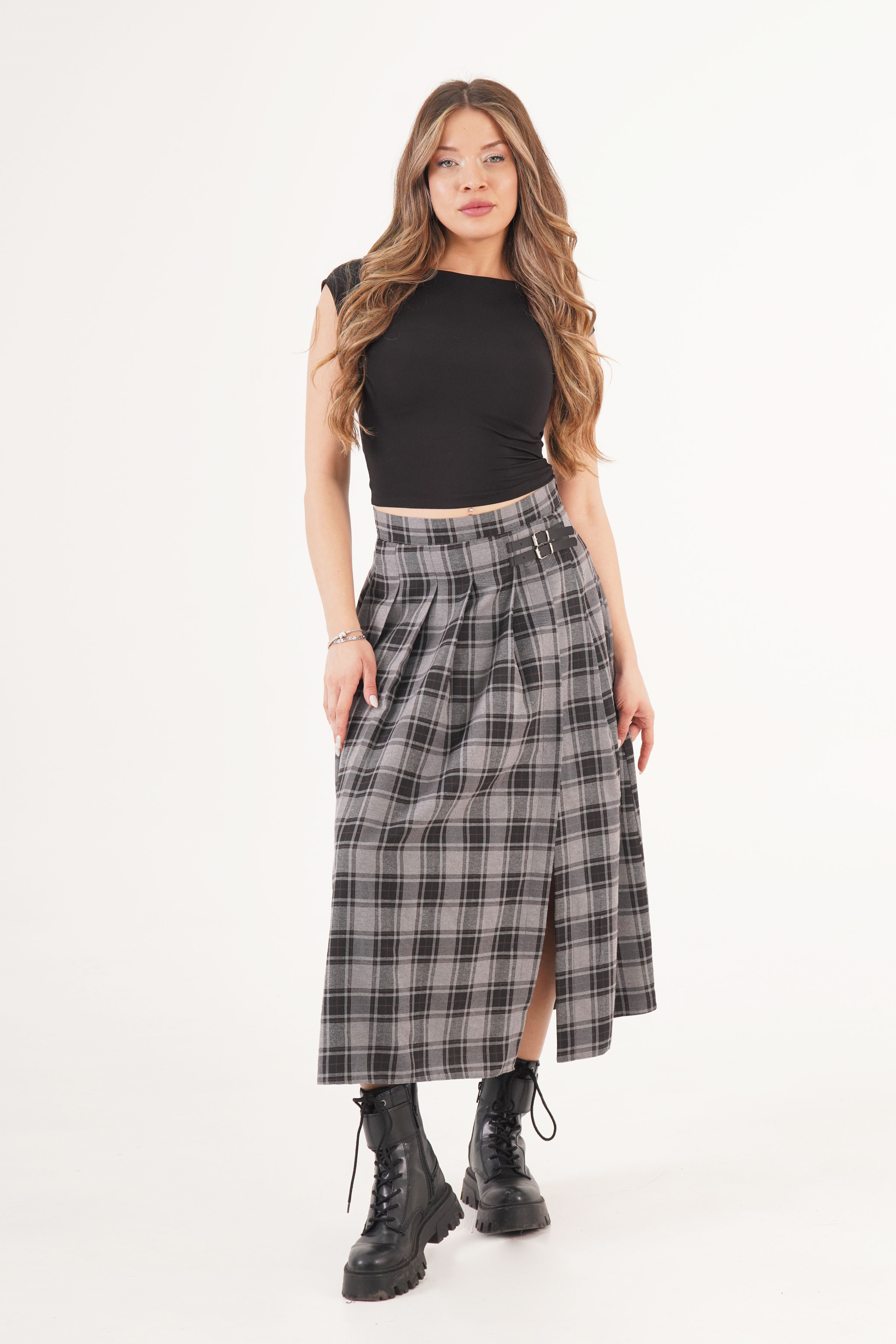 Kemer Detaylı Yan Yırtmaçlı Gri Ekose Toptan Uzun Etek