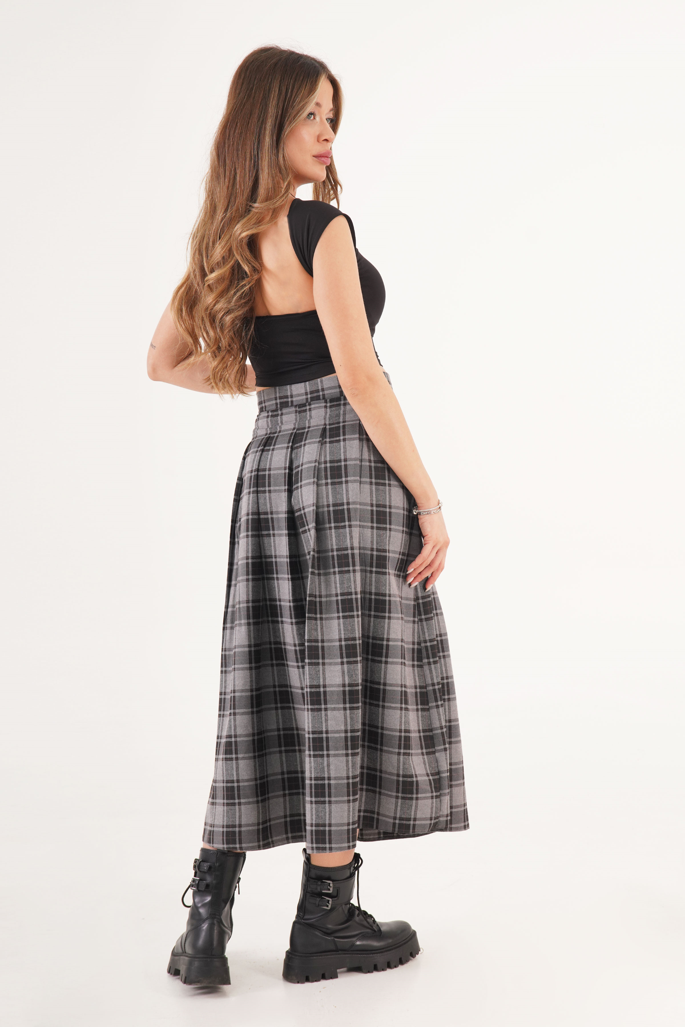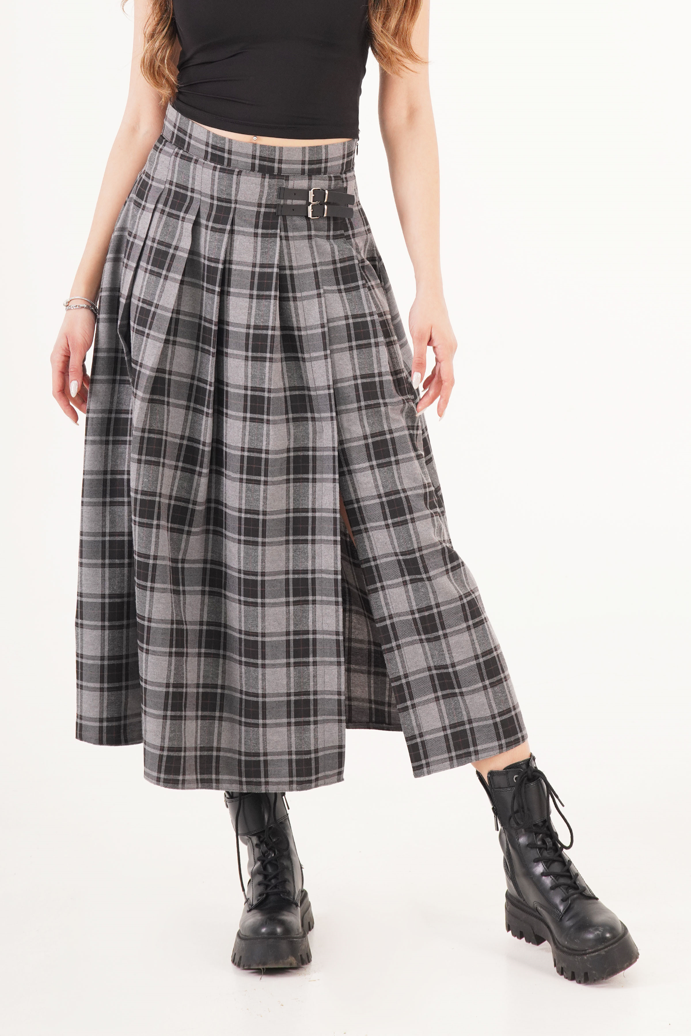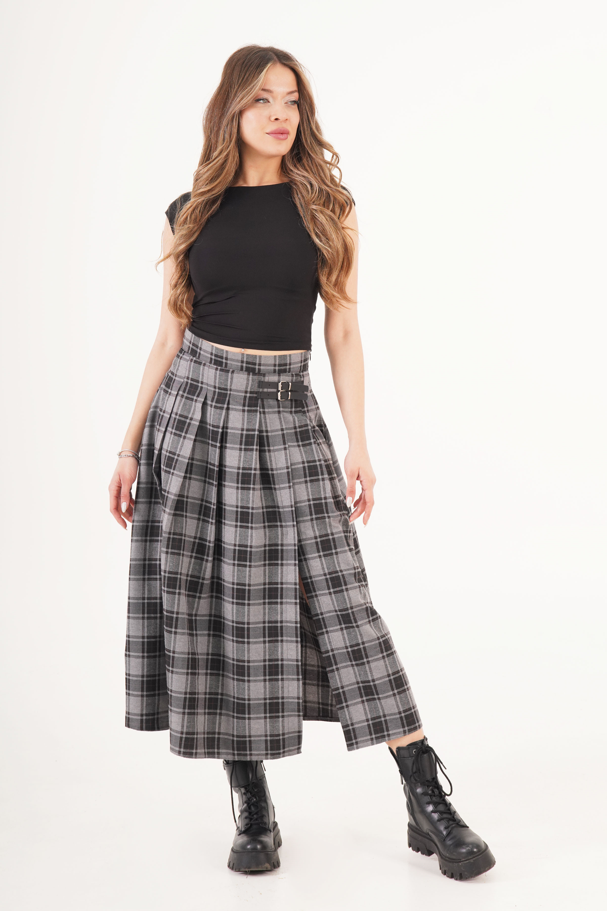 Kemer Detaylı Yan Yırtmaçlı Gri Ekose Toptan Uzun Etek