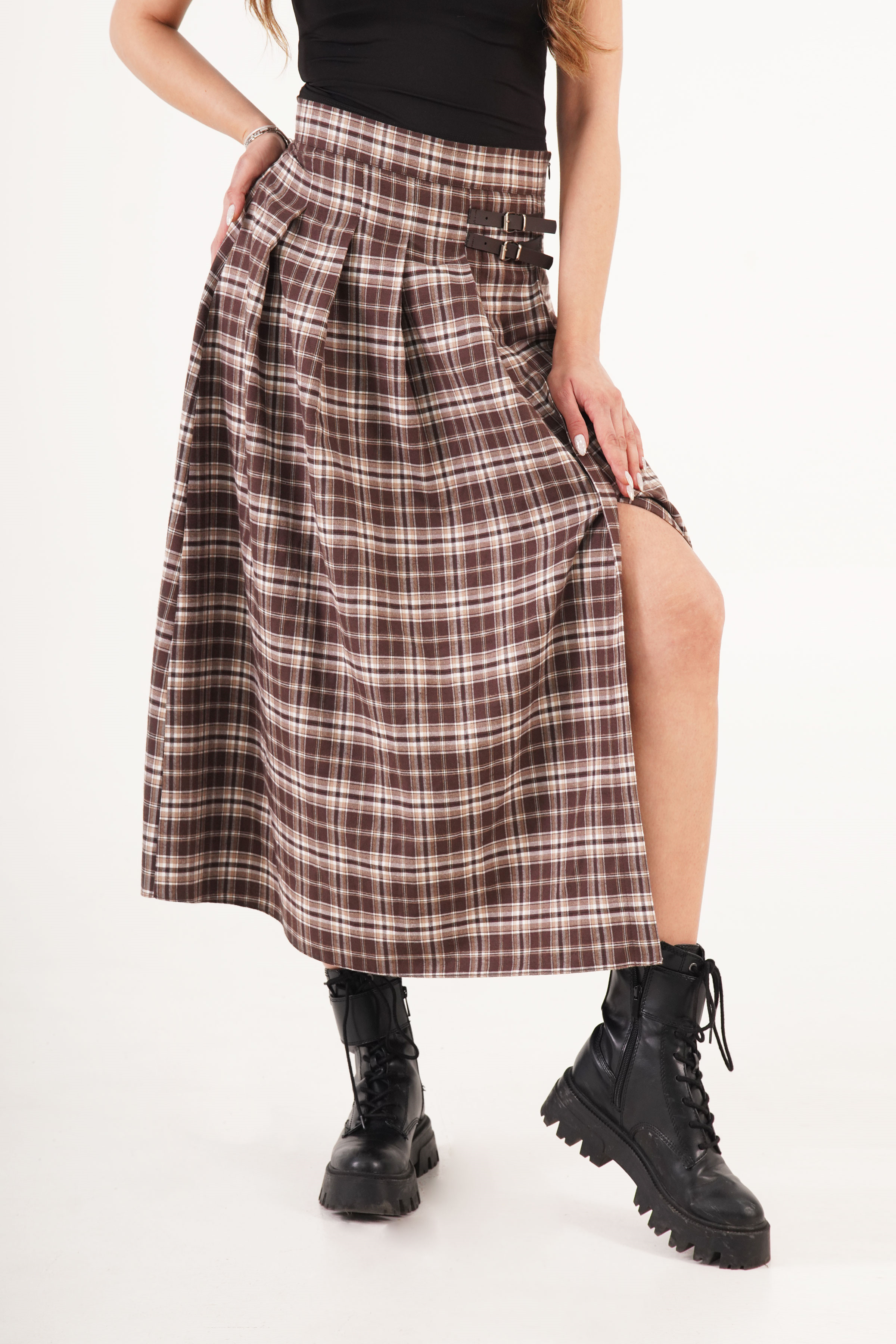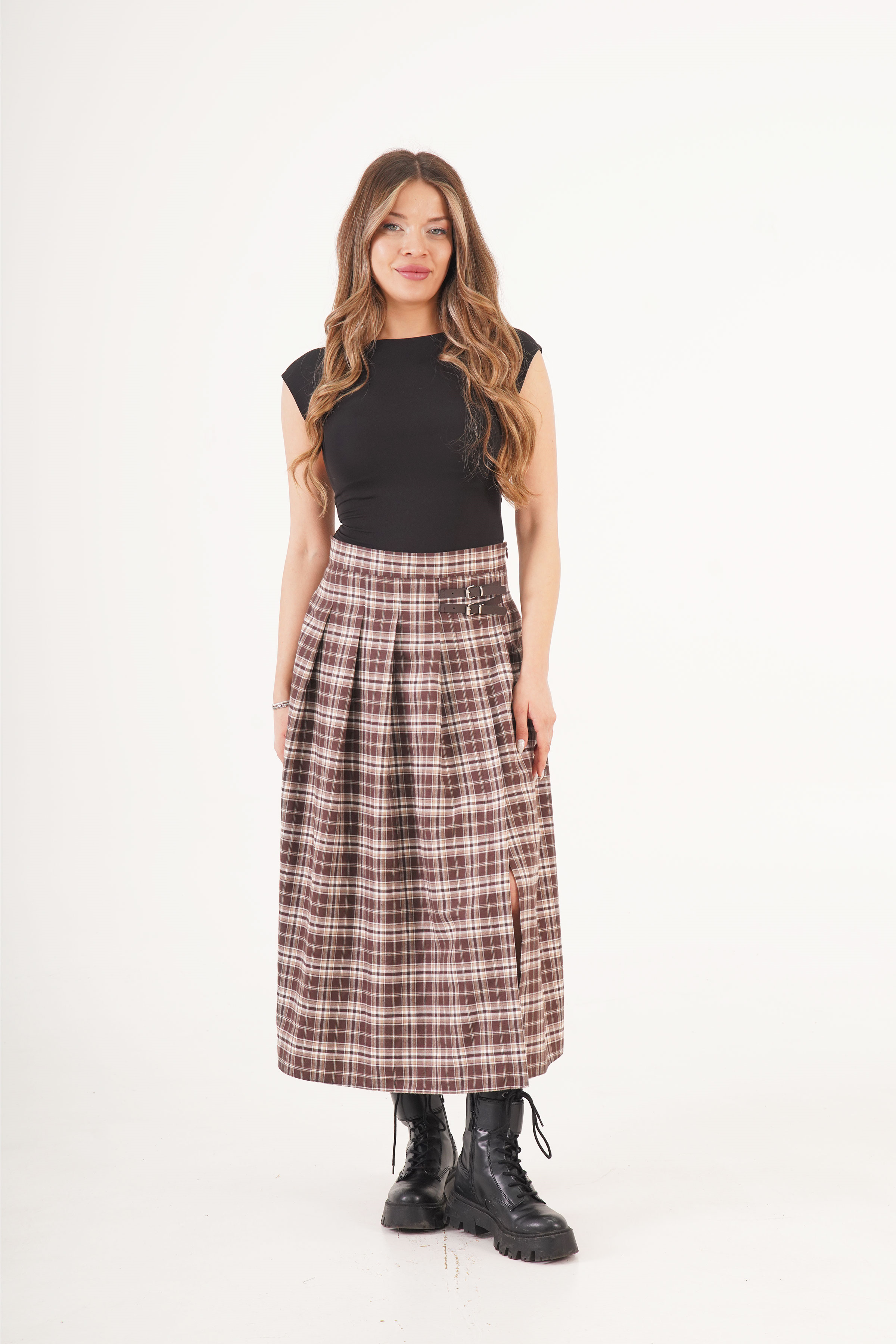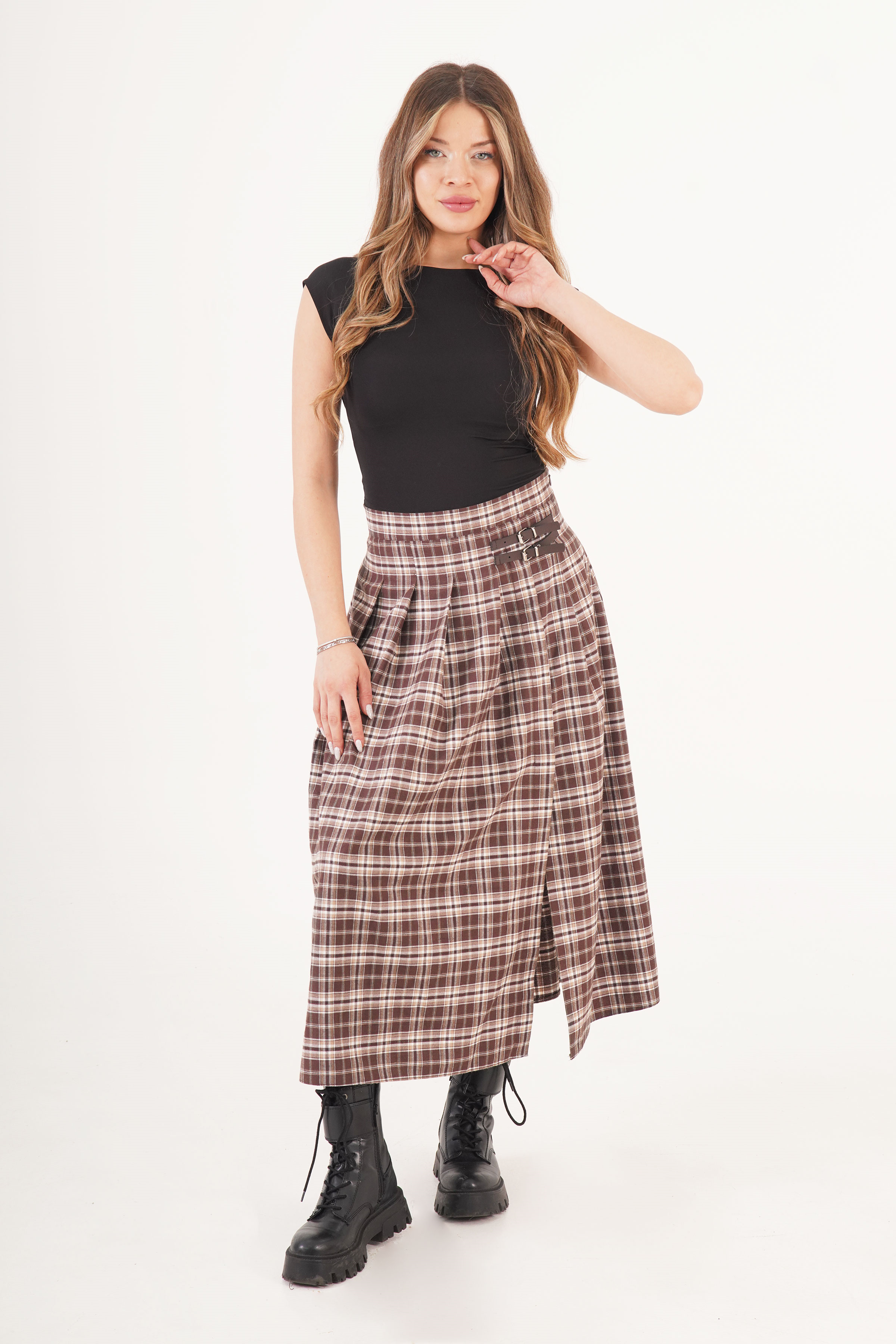 Kemer Detaylı Yan Yırtmaçlı Kahve Ekose Toptan Uzun Etek