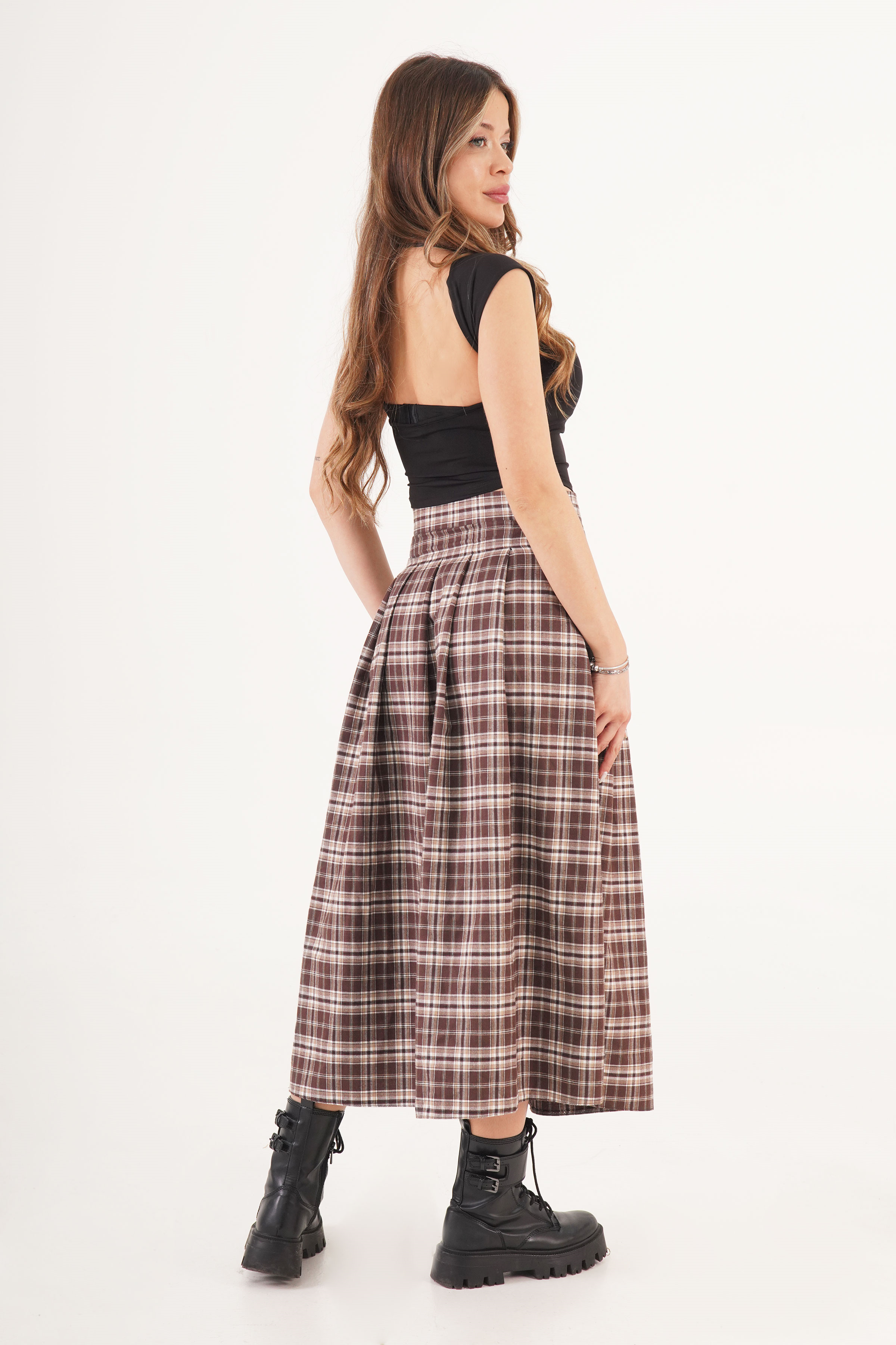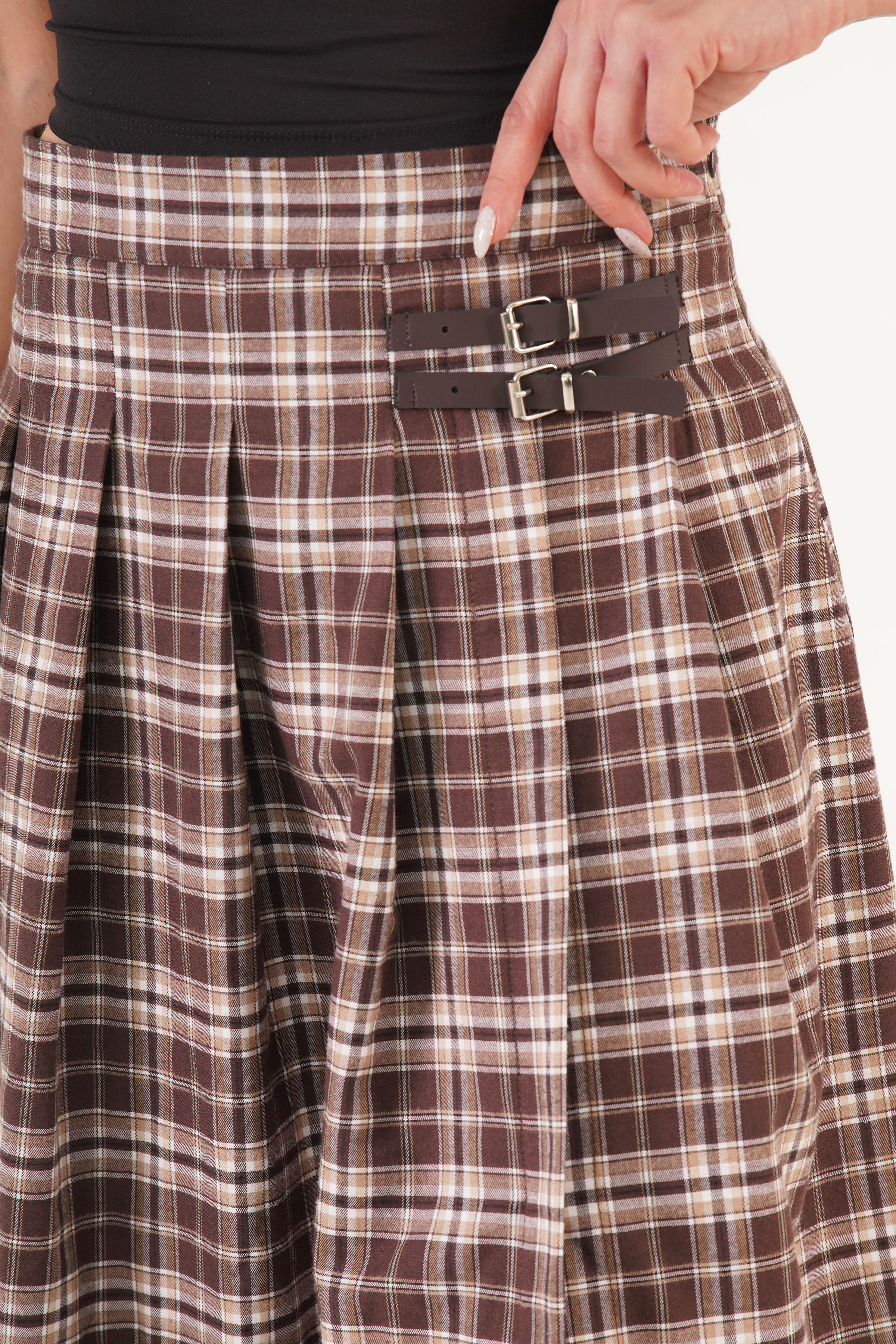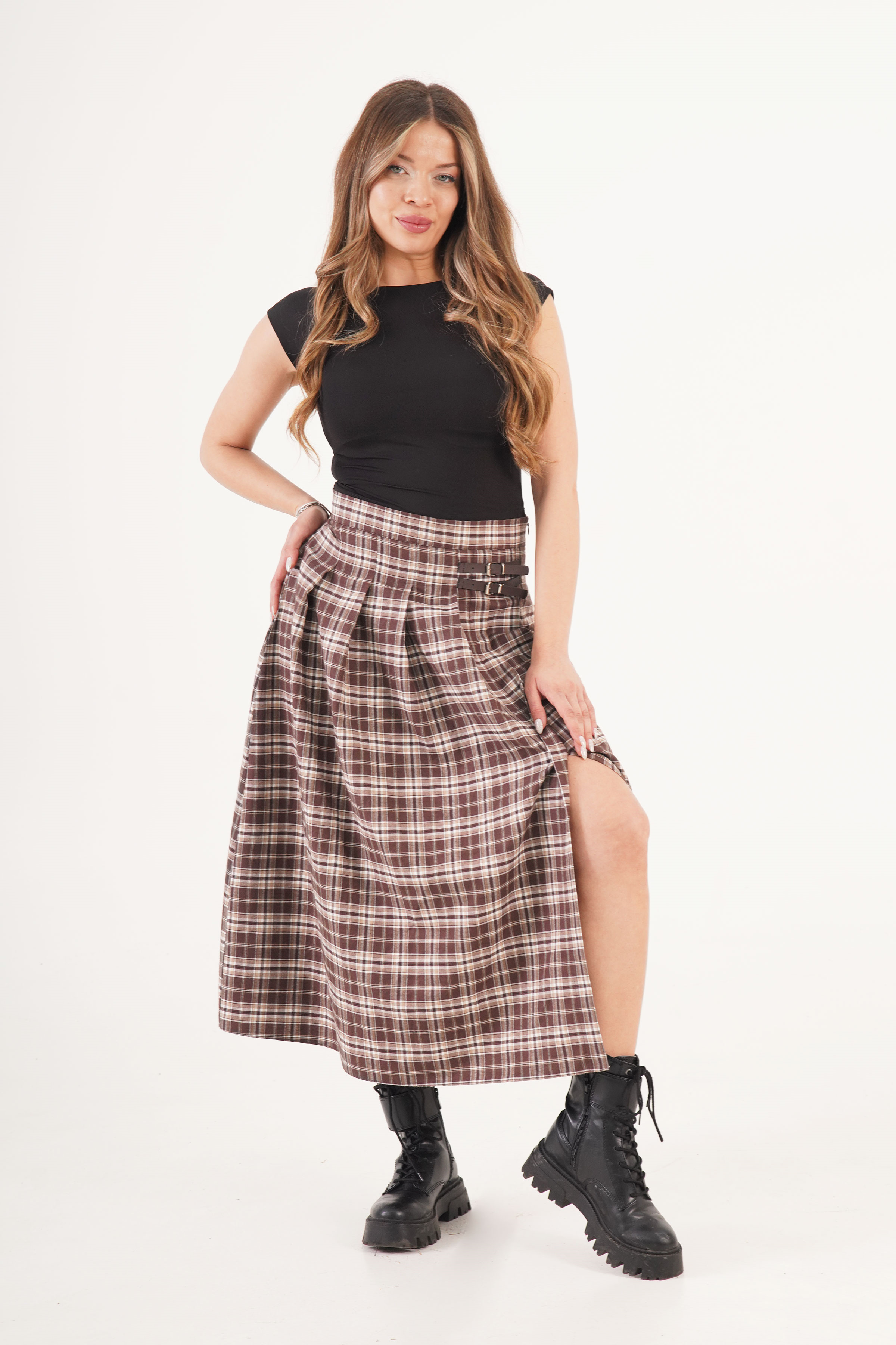 Kemer Detaylı Yan Yırtmaçlı Kahve Ekose Toptan Uzun Etek