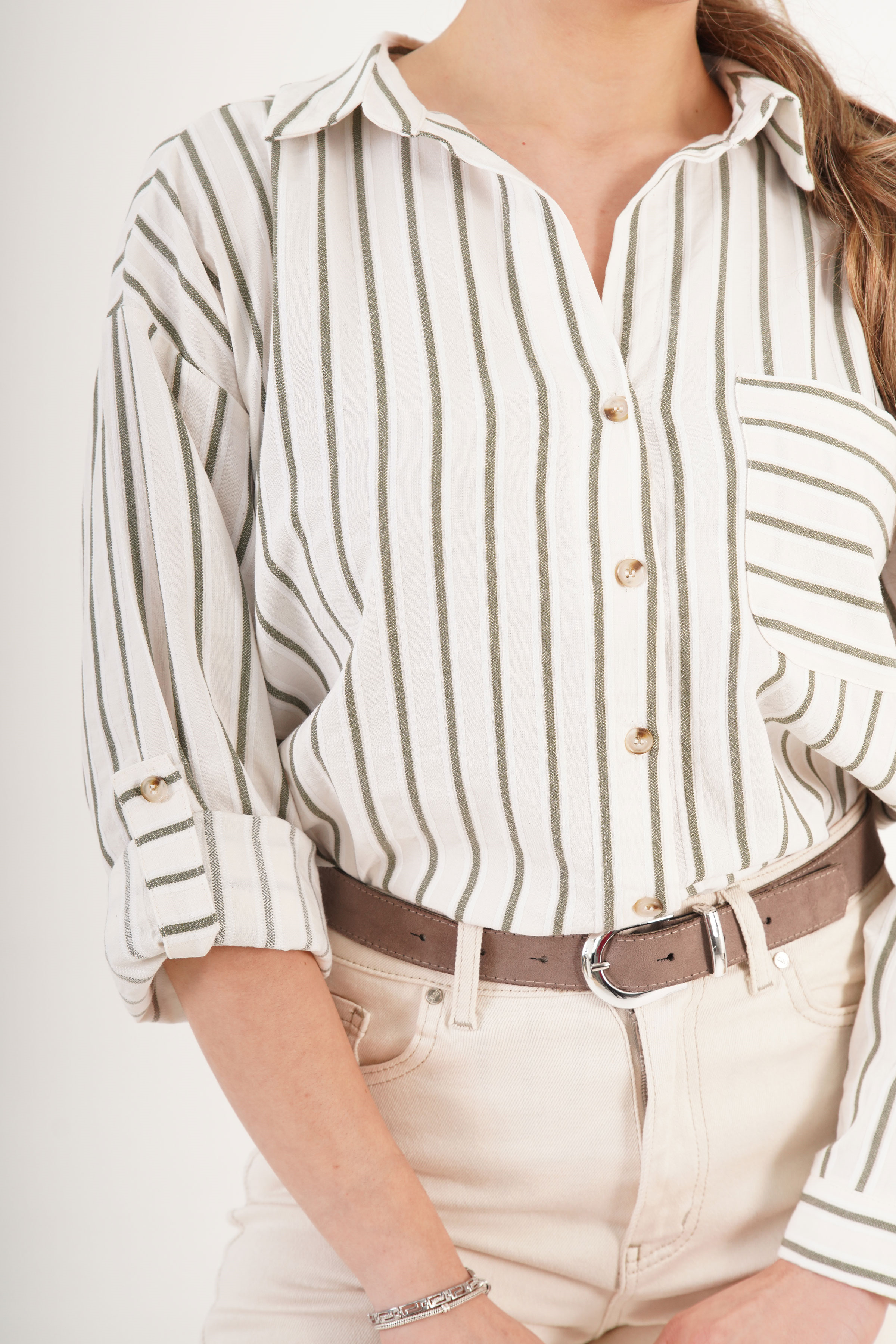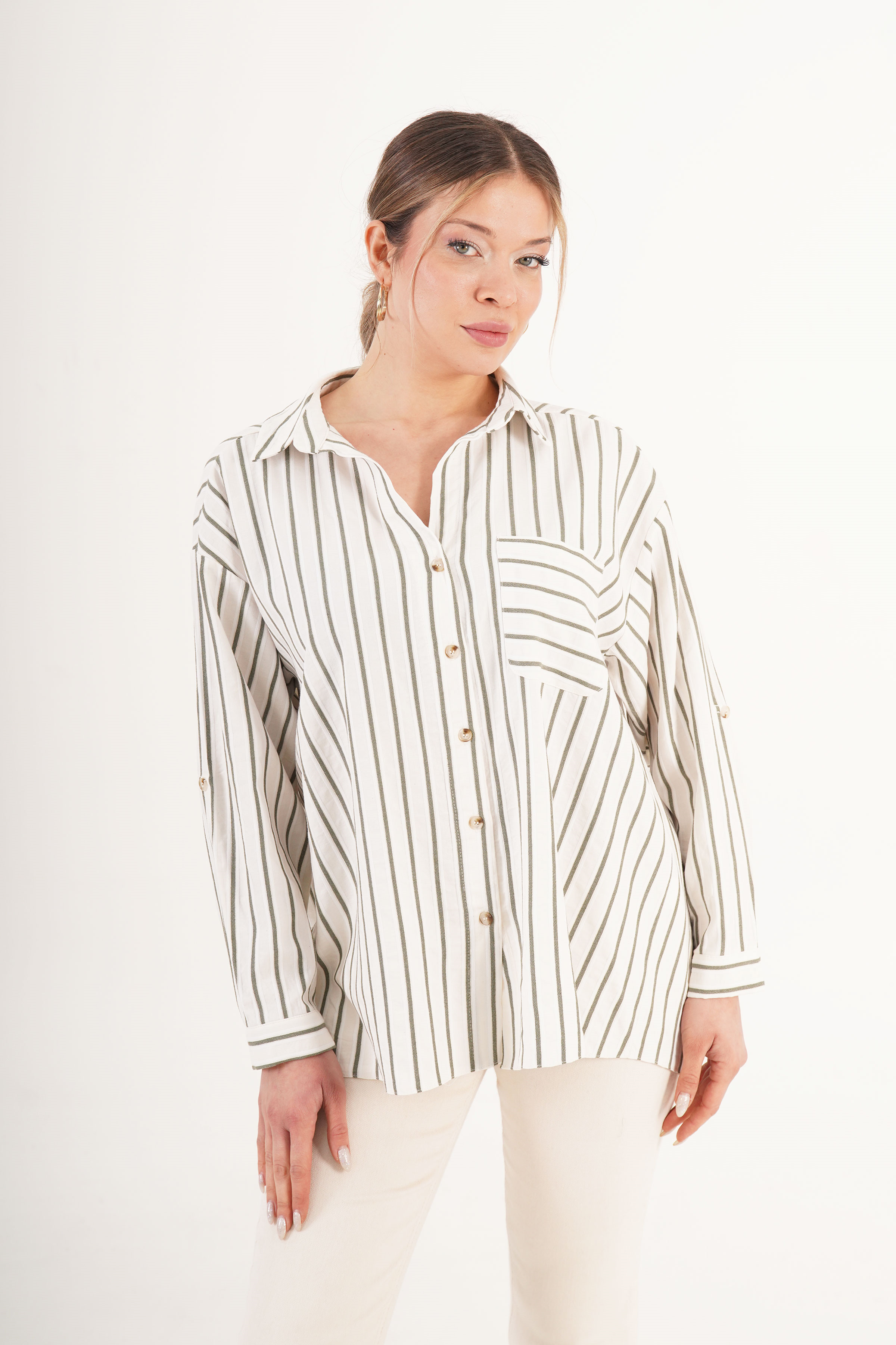 Keten Haki Çizgili Cepli Dökümlü Toptan Gömlek
