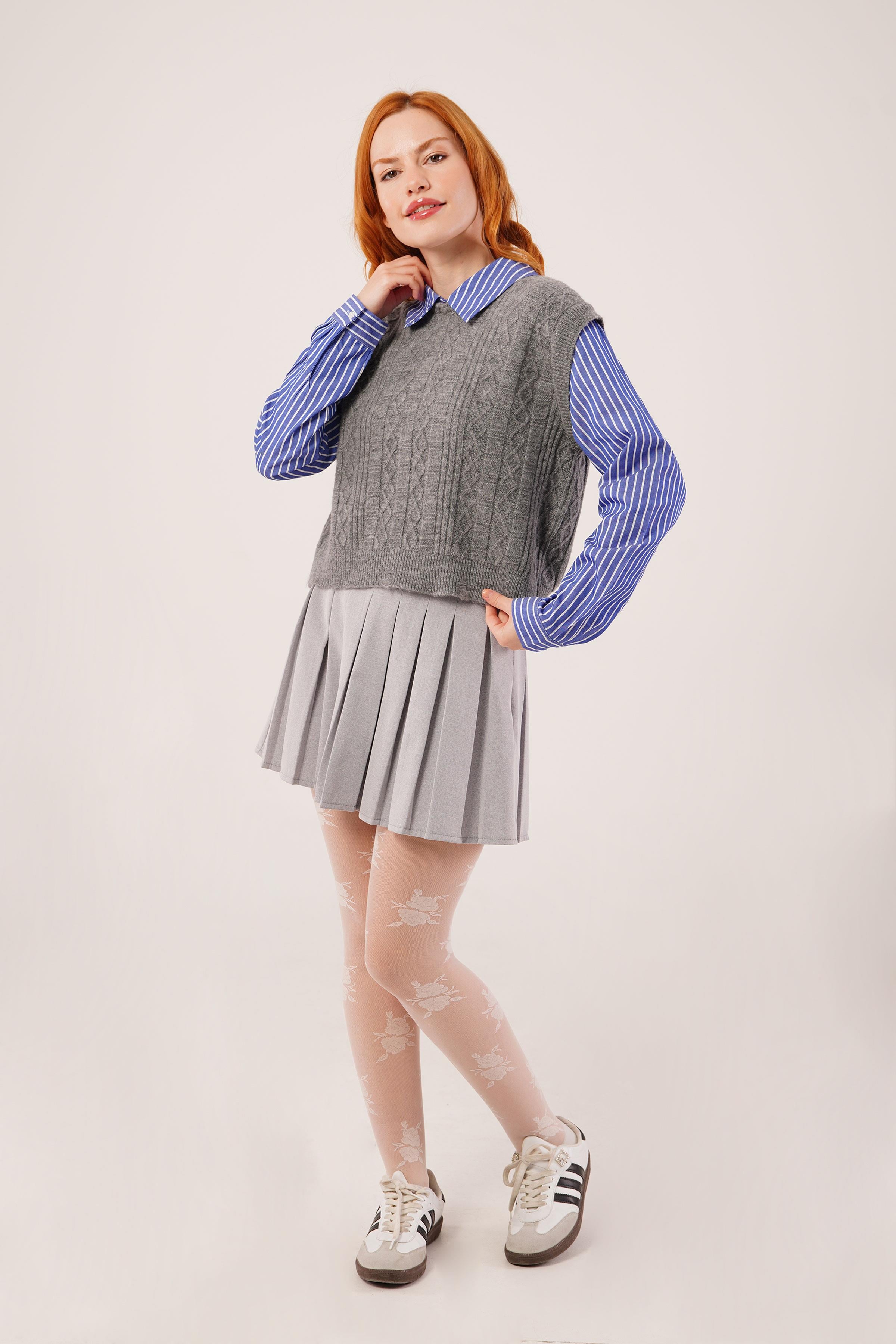 Kol Ve Yaka Gömlek Detaylı Gri Toptan Triko Kazak