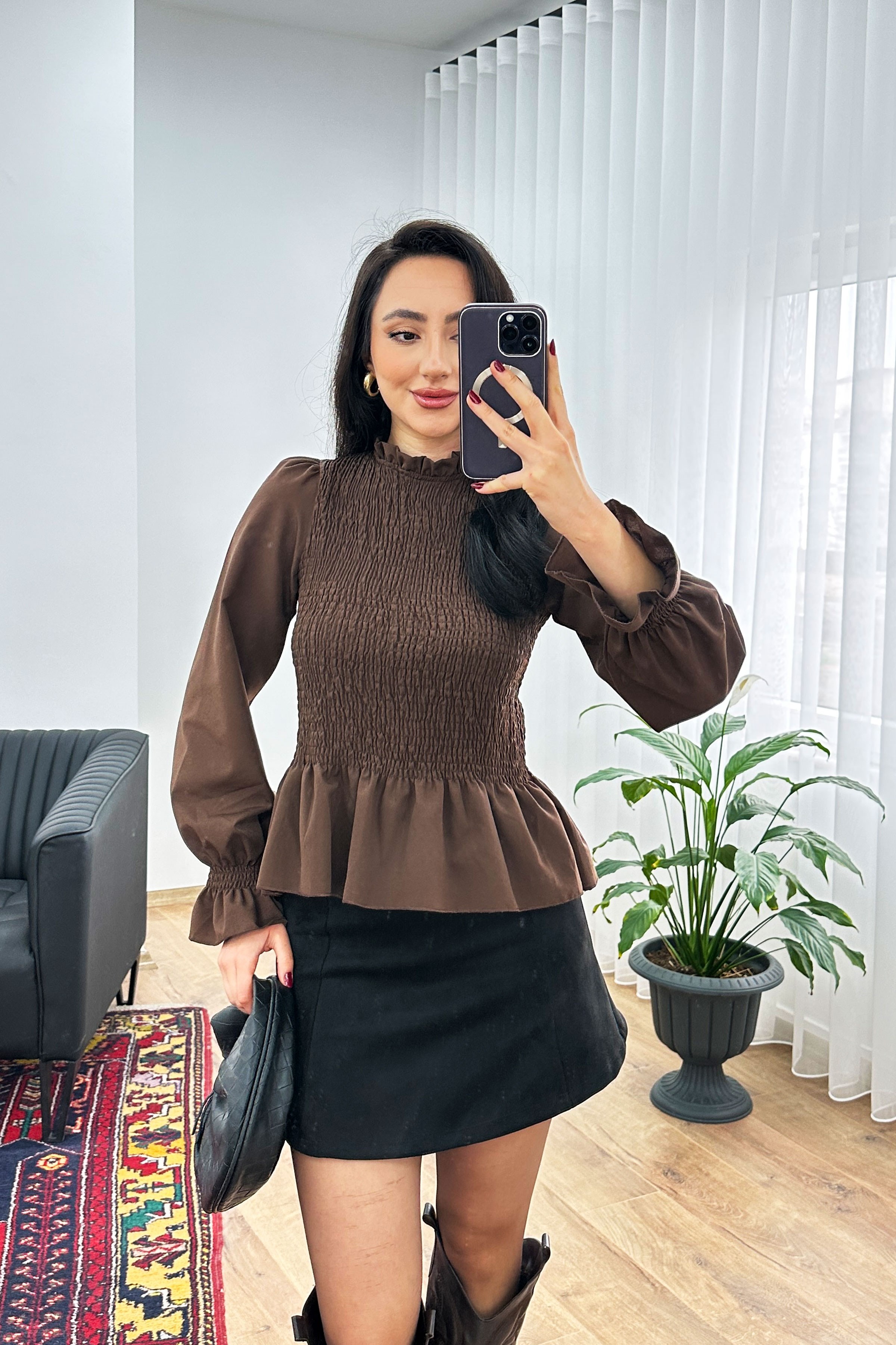 Komple Gipeli Dik Yaka Kahve Toptan Bluz