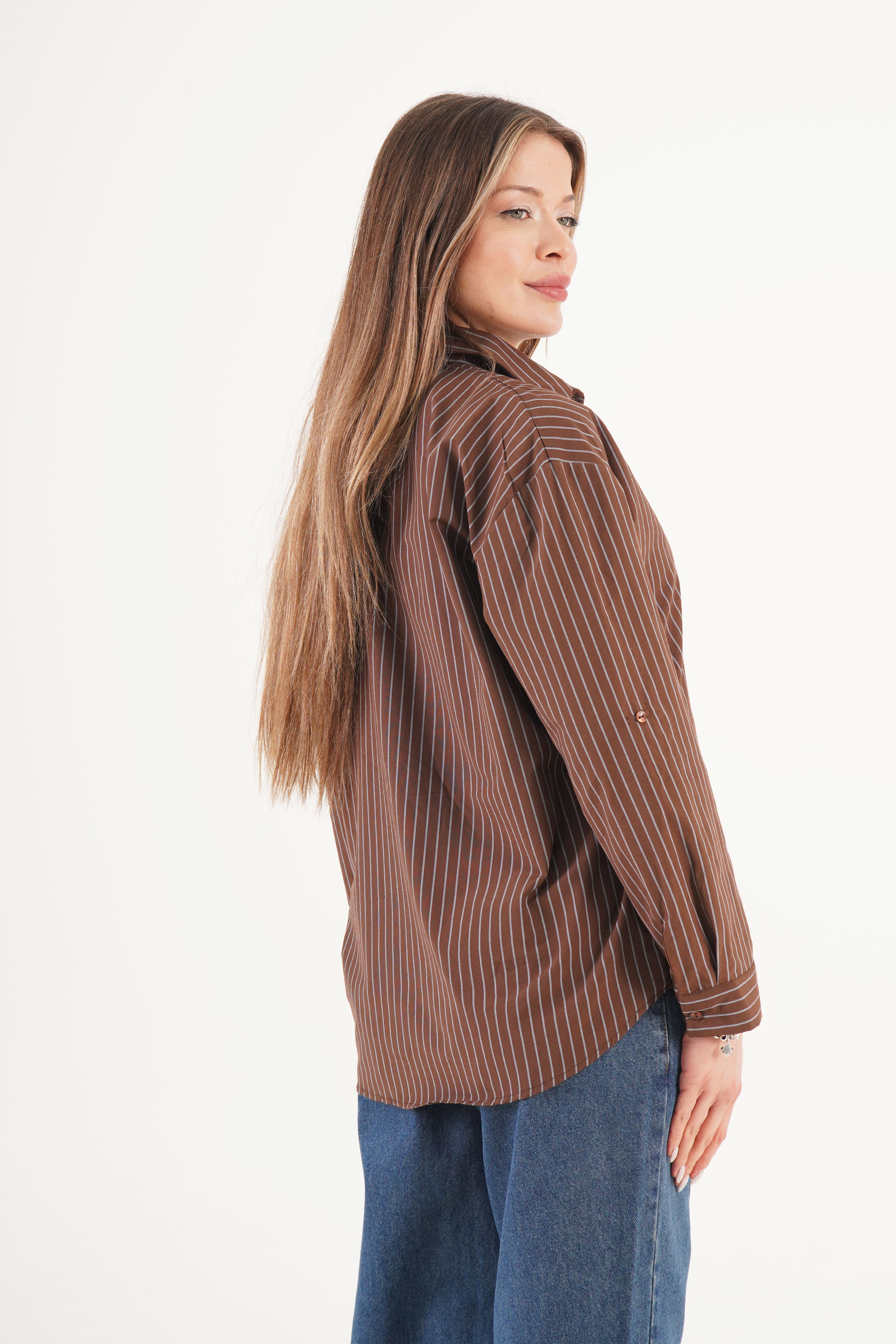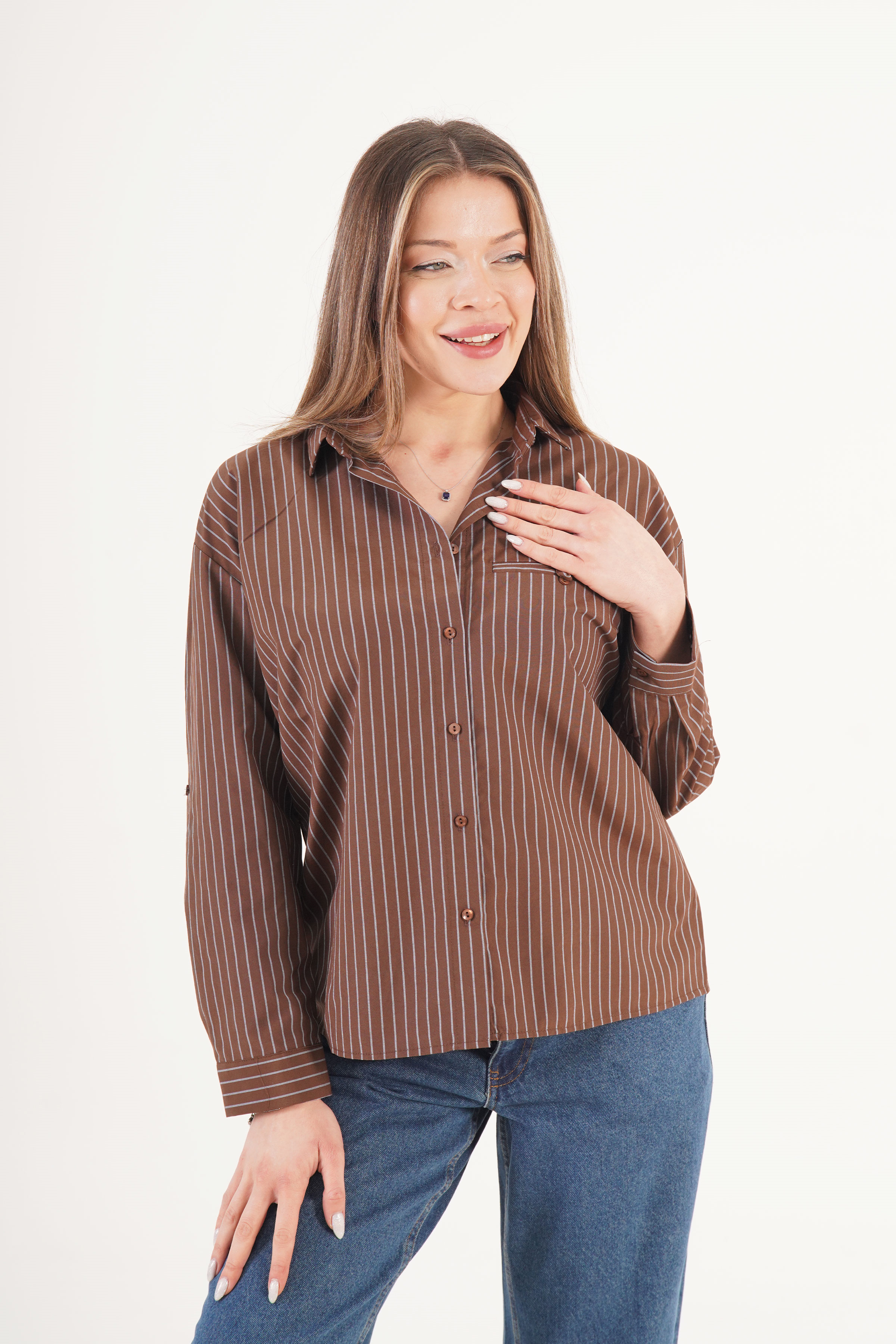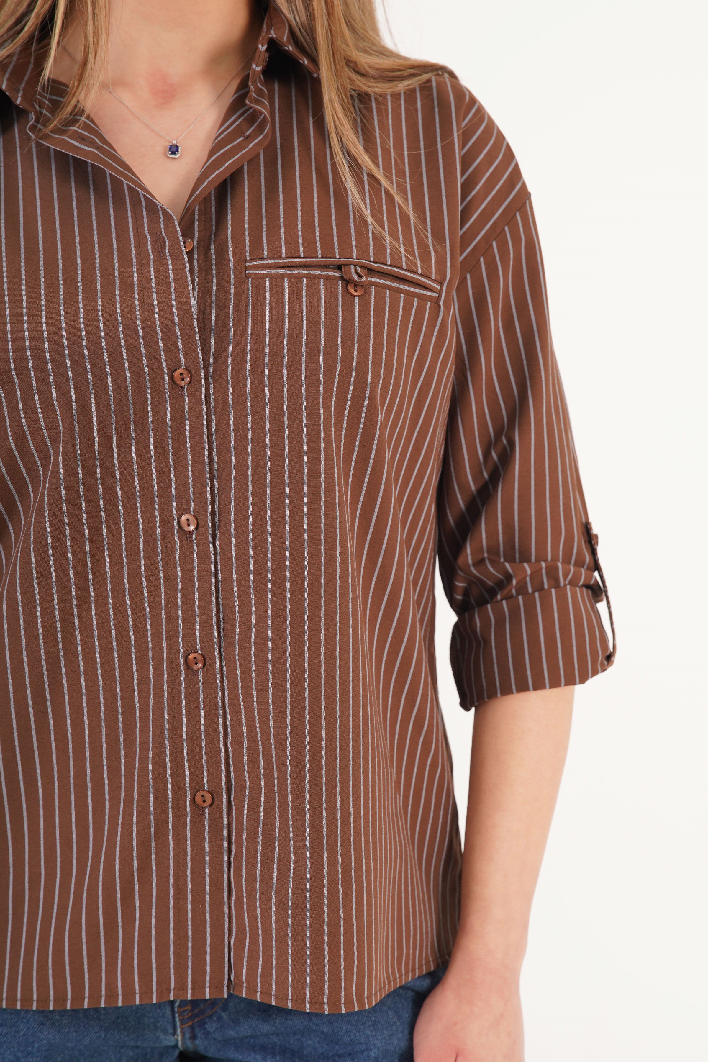 Kontrast Mavi Çizgili Kol Manşetli Kahve Toptan Gömlek