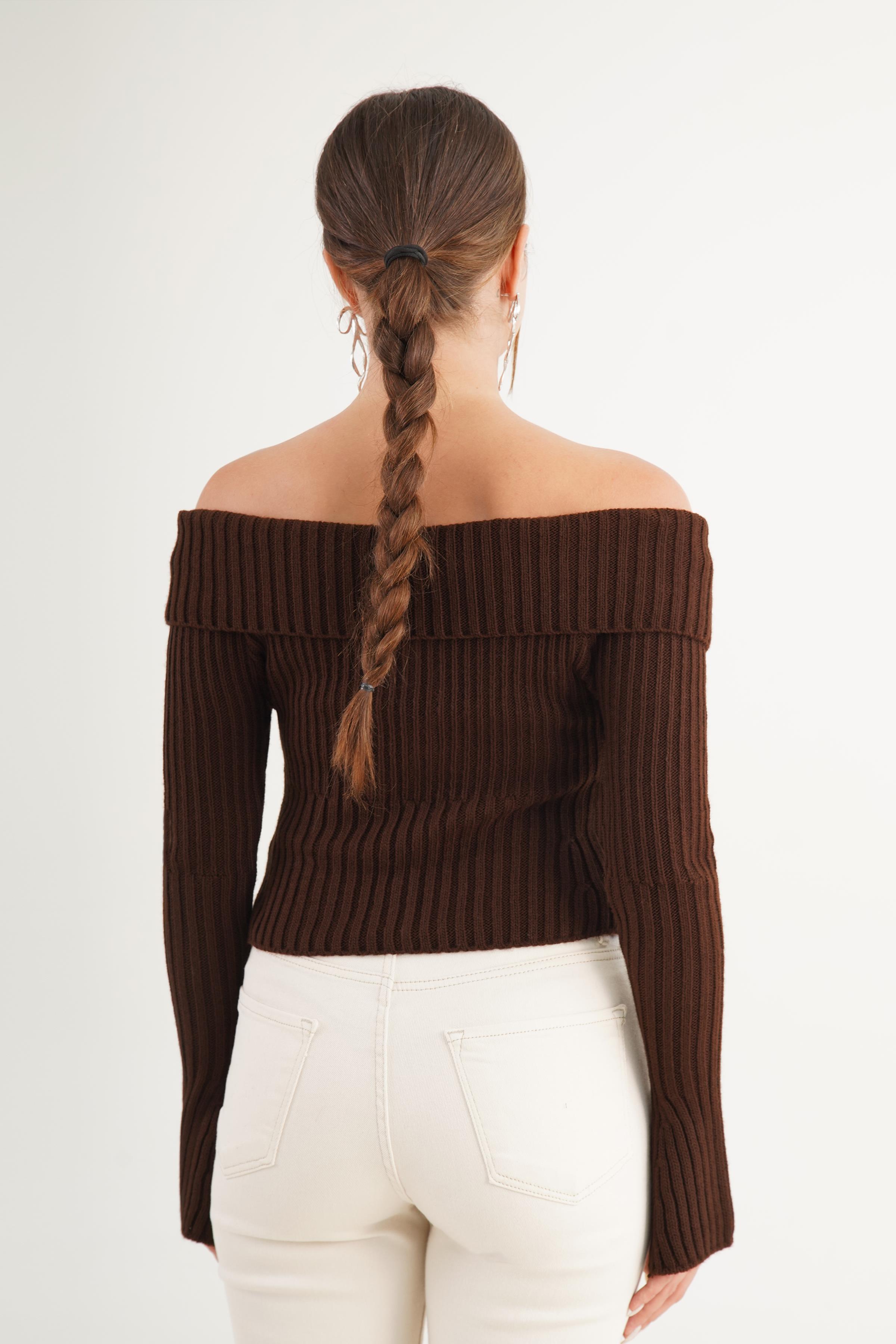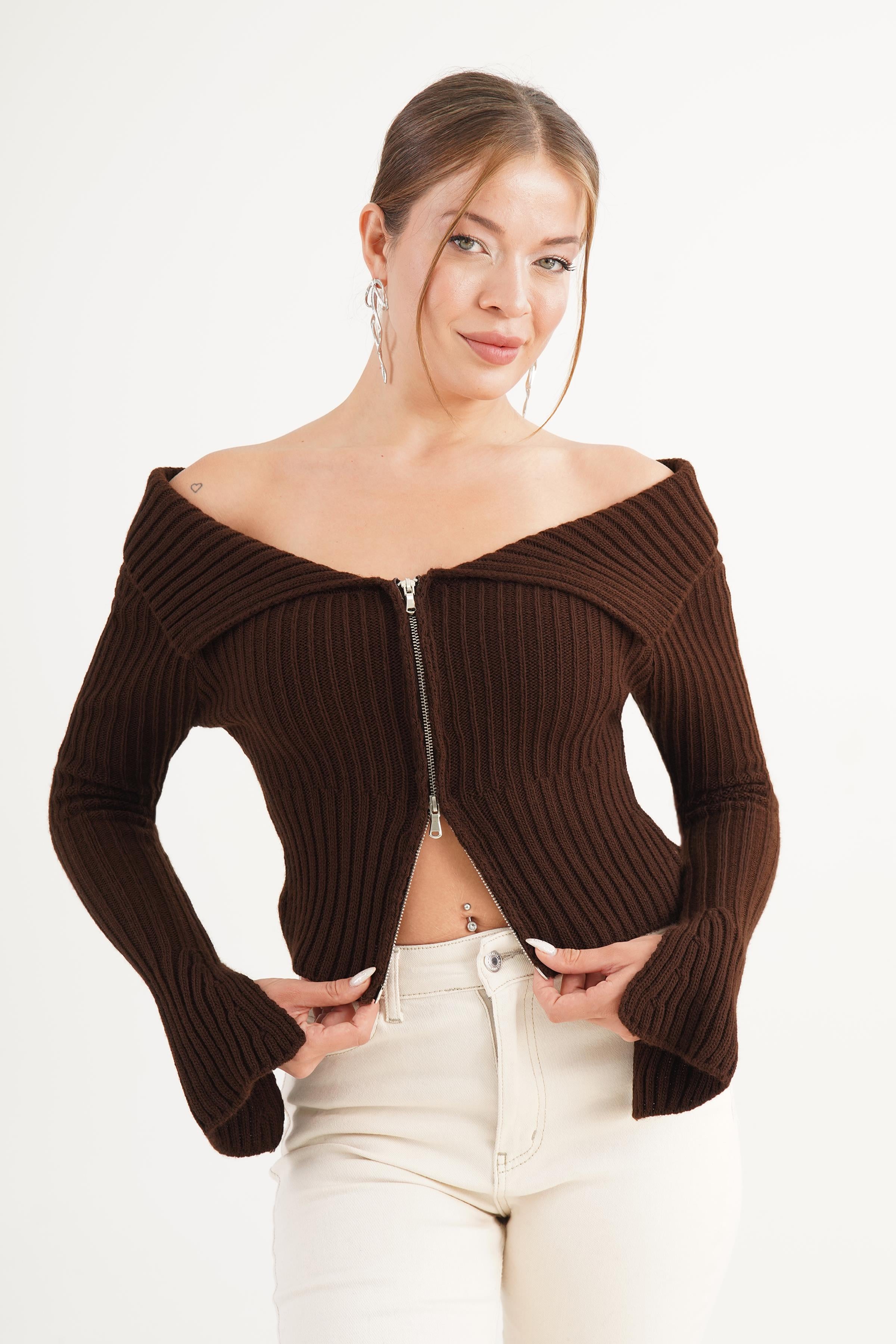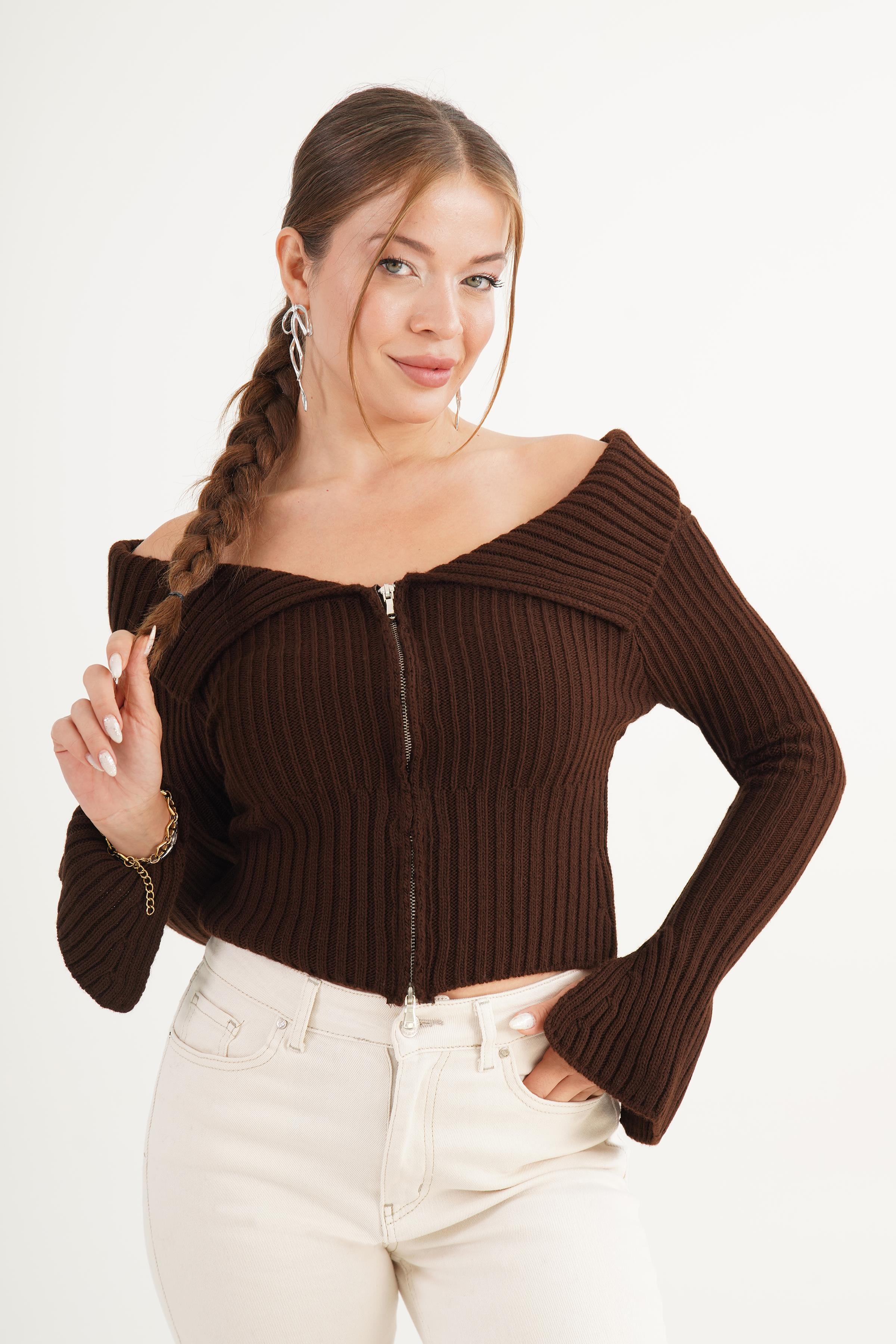 Madonna Yaka Full Fermuarlı Toptan Kahve Triko Bluz
