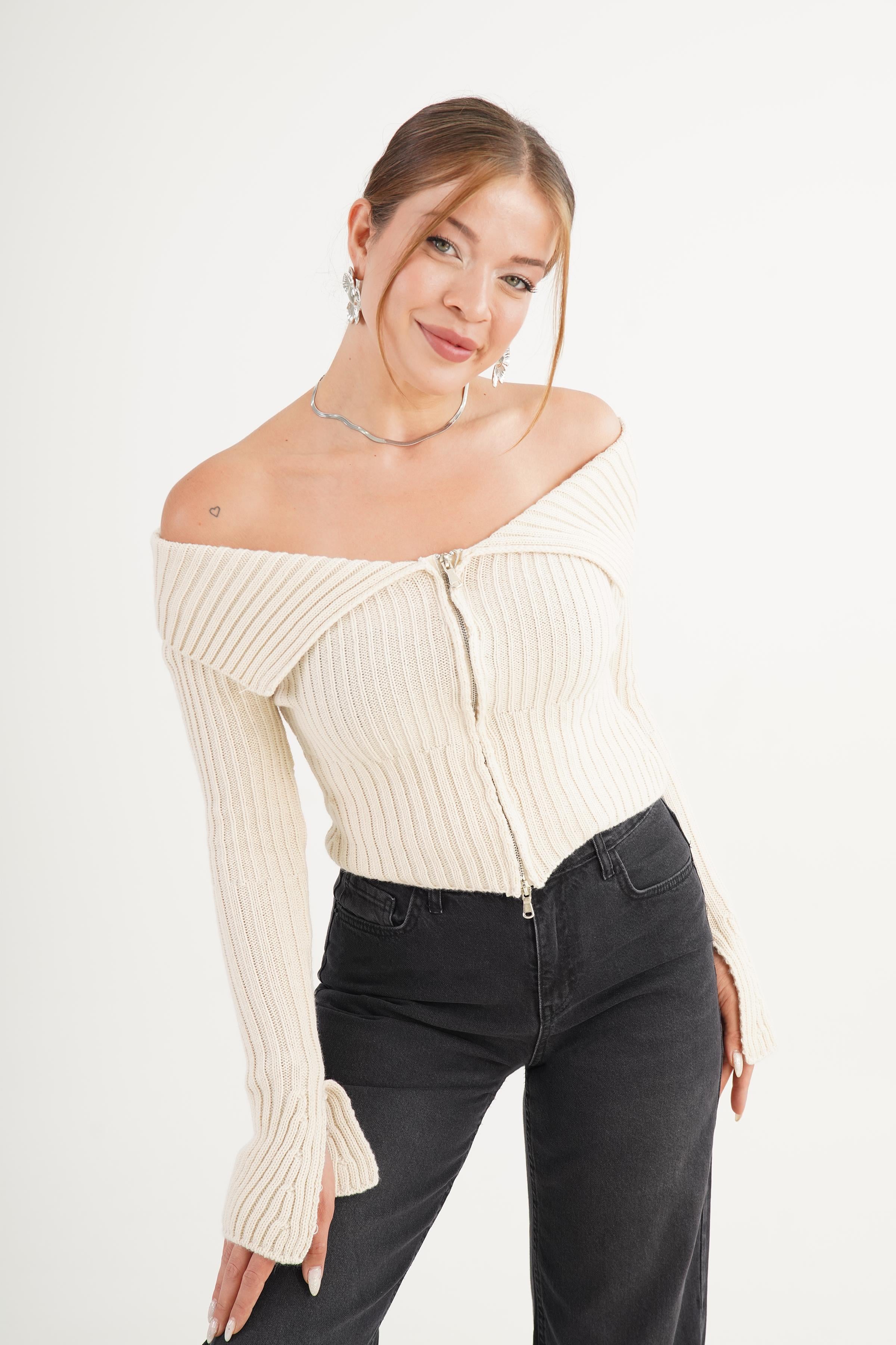 Madonna Yaka Full Fermuarlı Toptan Taş Triko Bluz