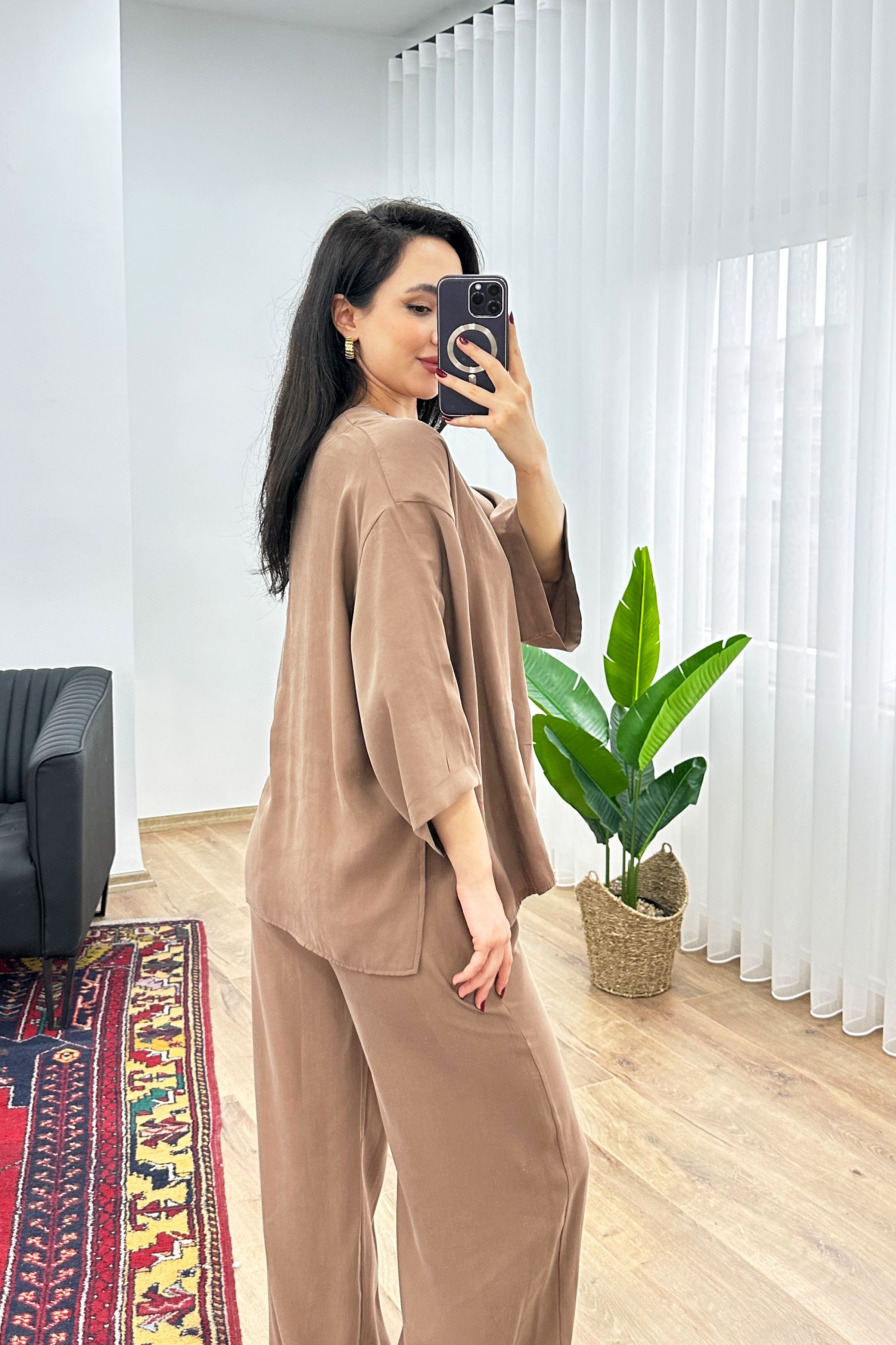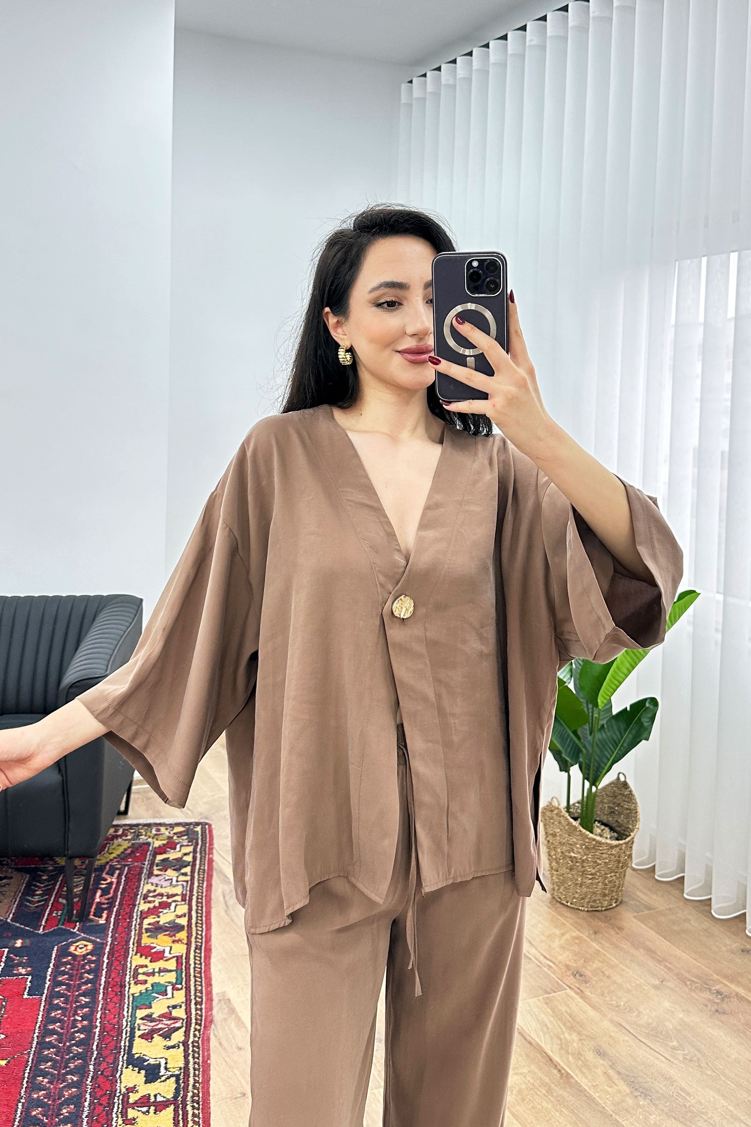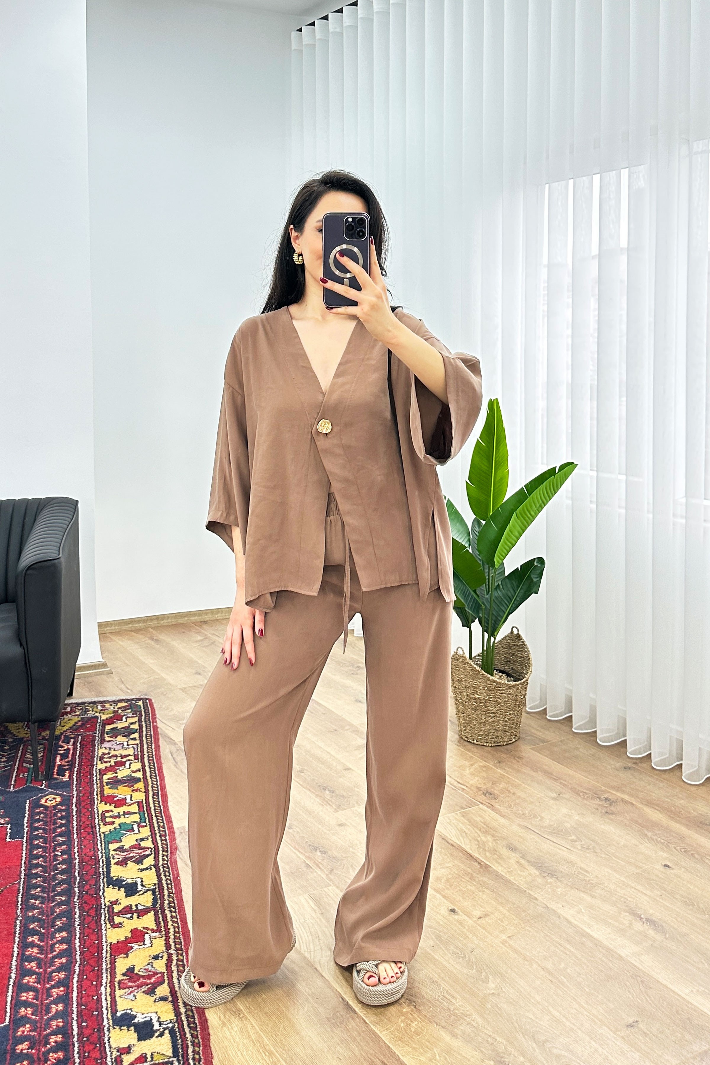 Modal Beli İp Bağlamalı Kruvaz Kahve Toptan Bluz Pantolon Takım