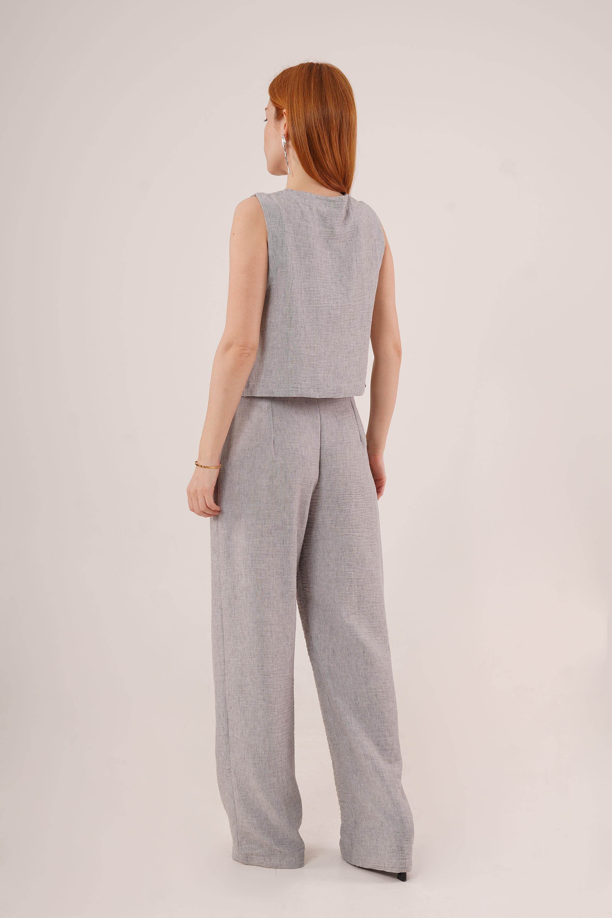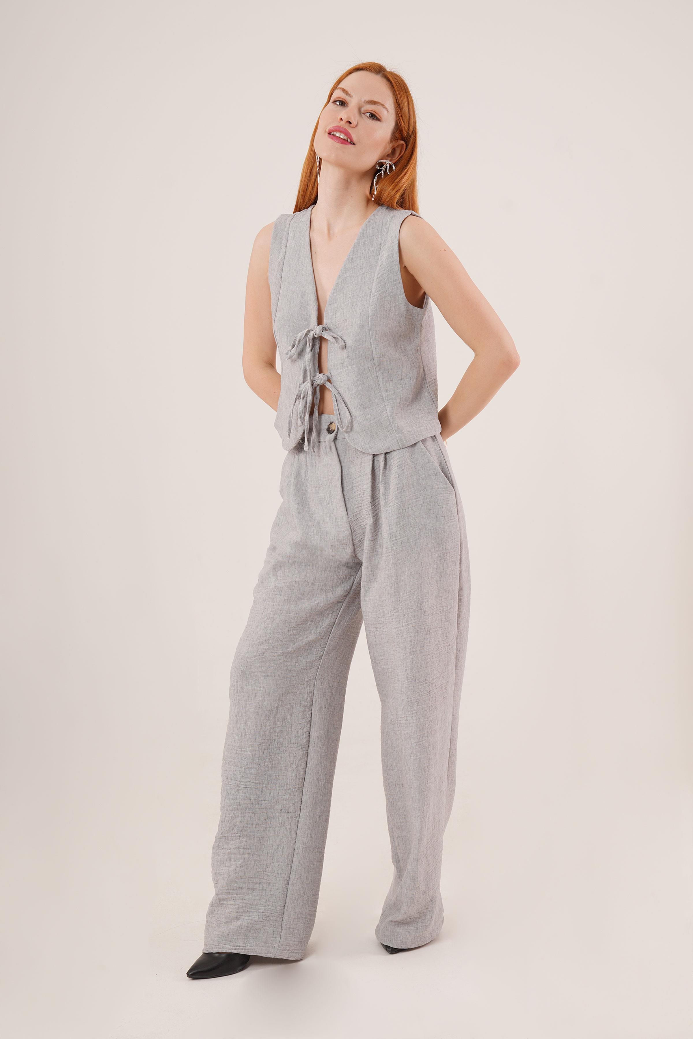 Ön Bağlama Detaylı Yelek Ve Pantolon Gri Toptan İkili Takım