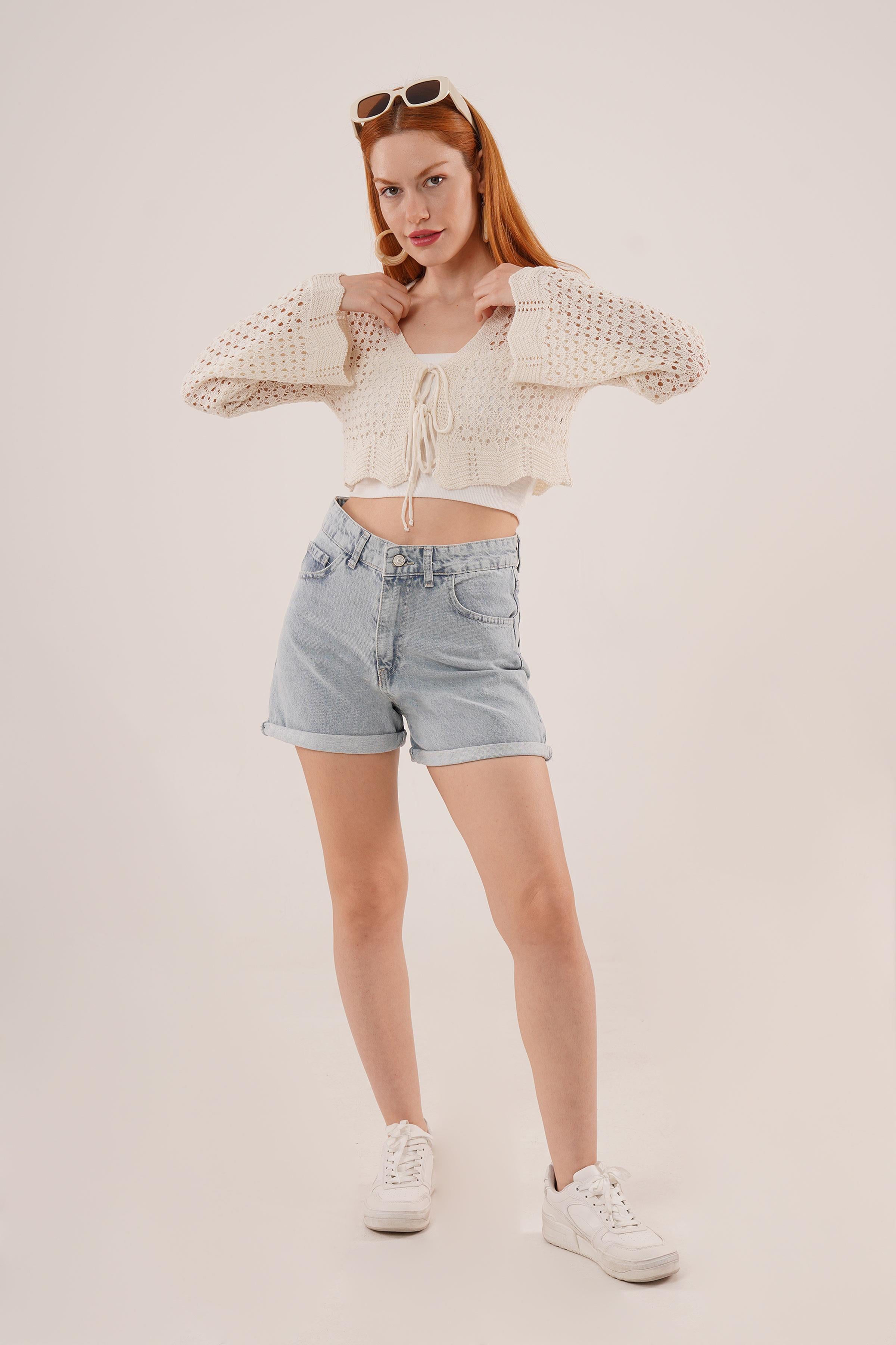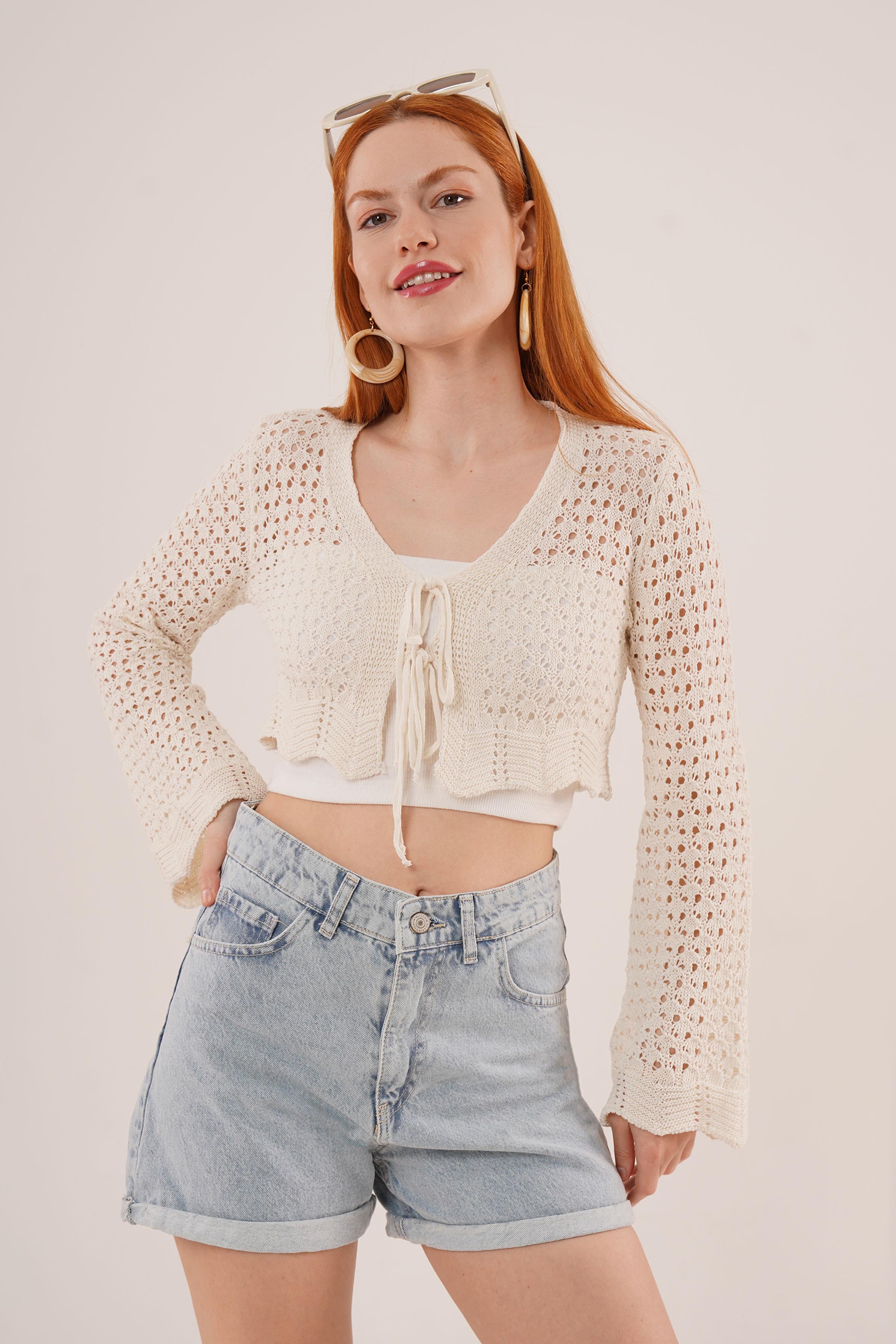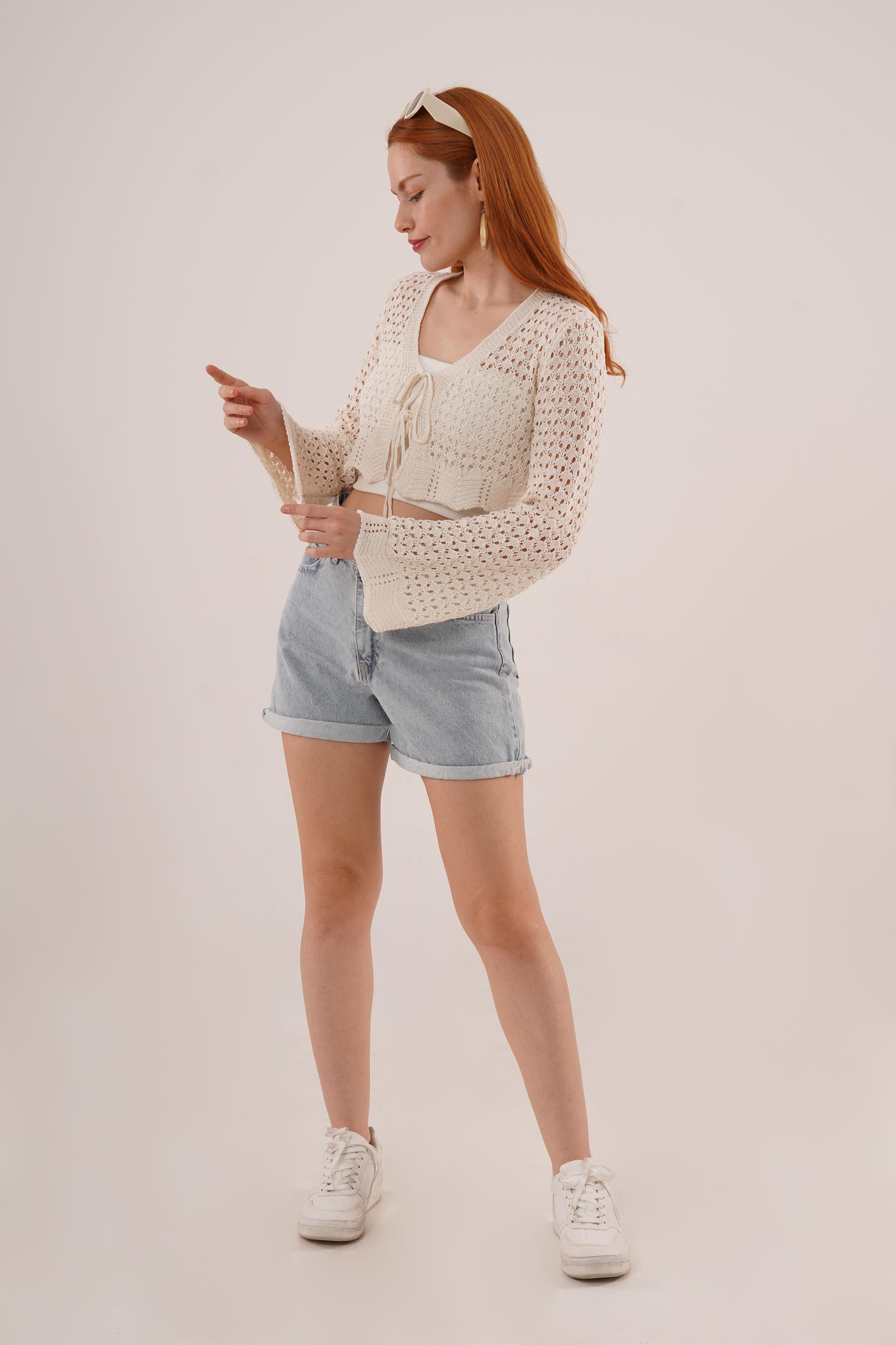Ön Bağlamalı Ajurlu Crop Toptan Krem Hırka