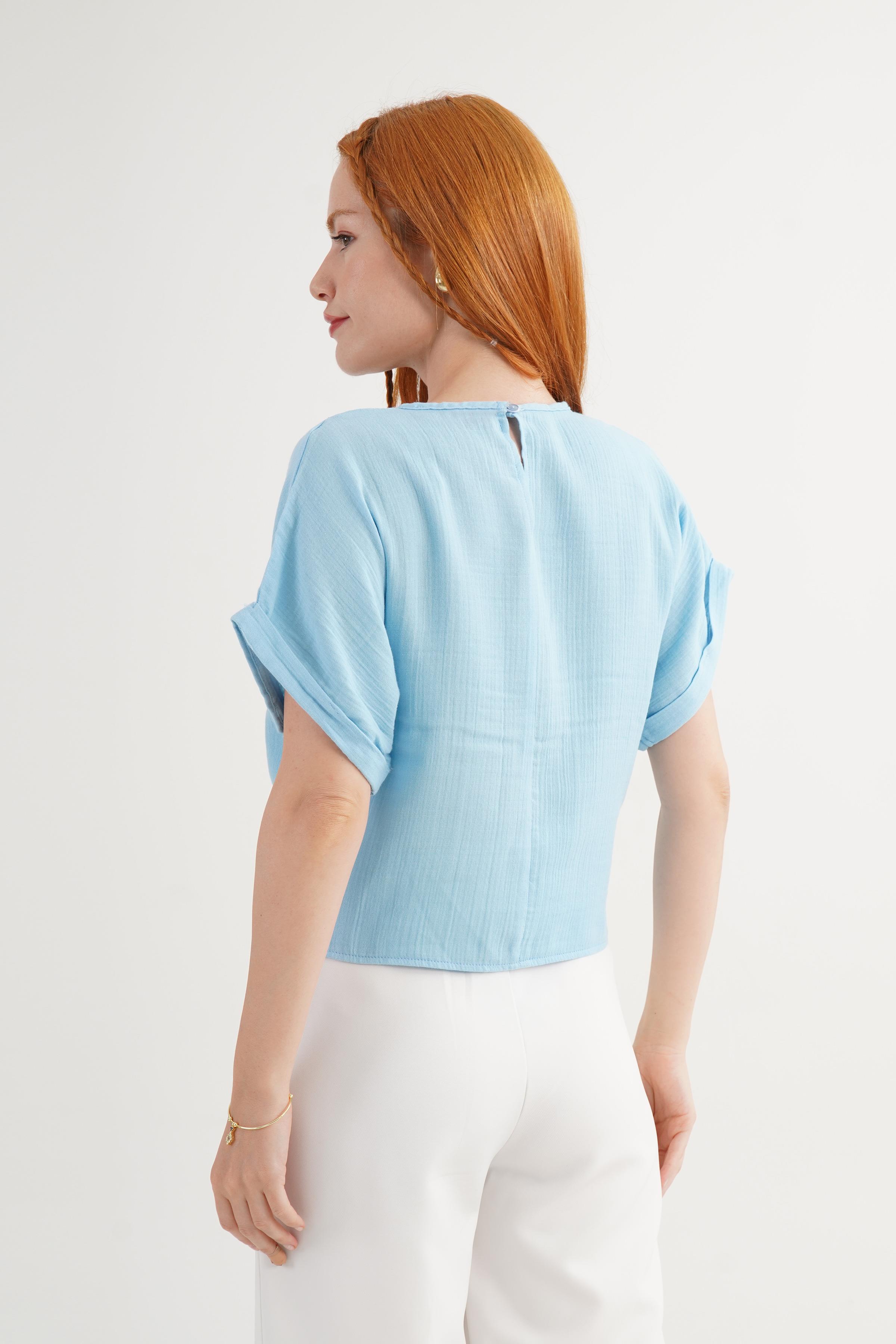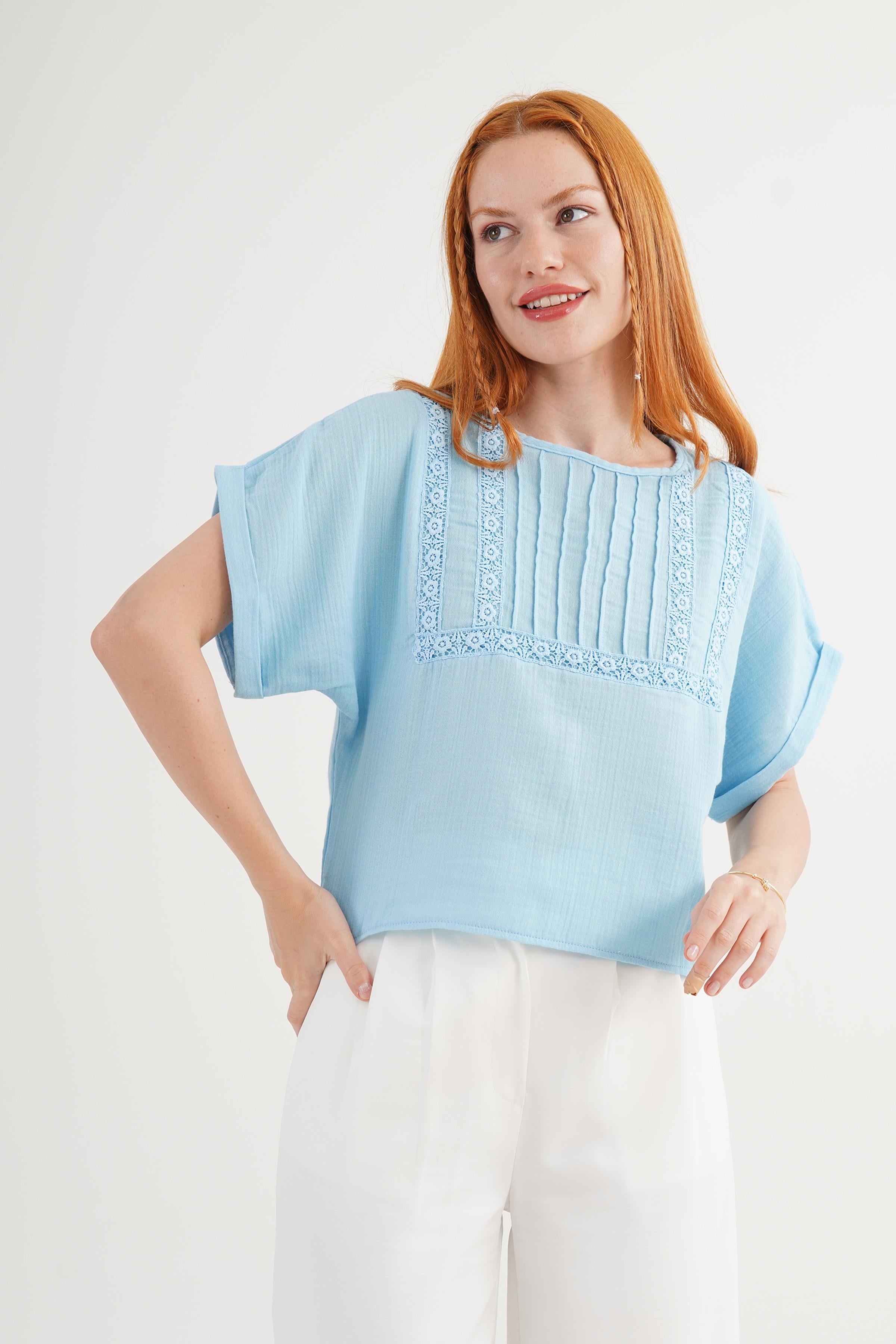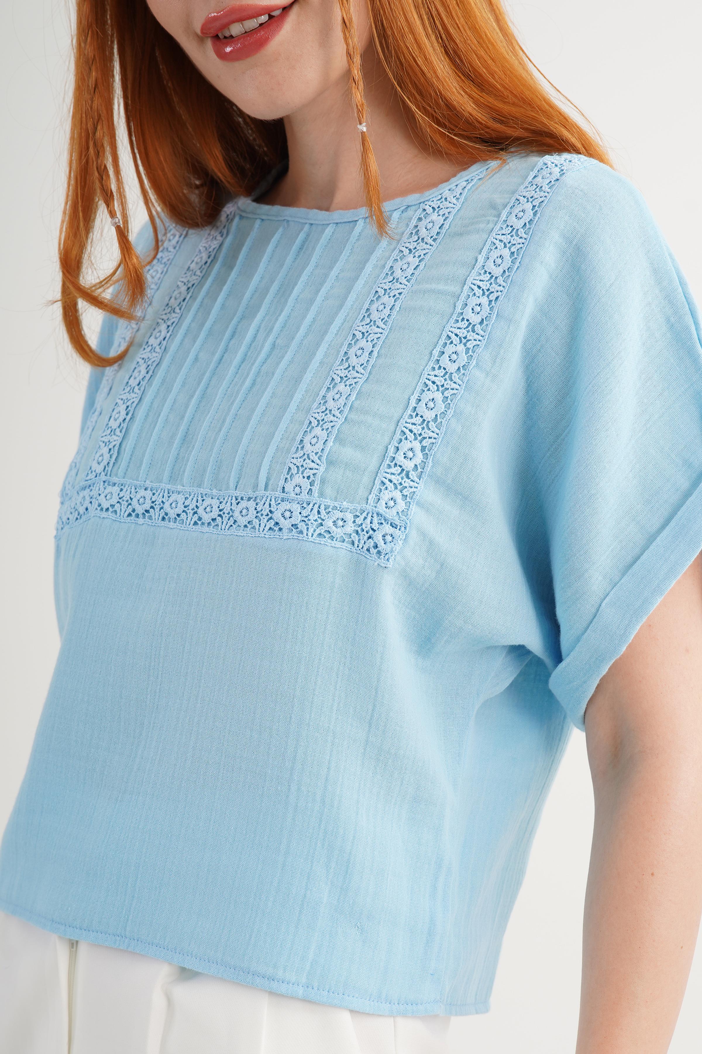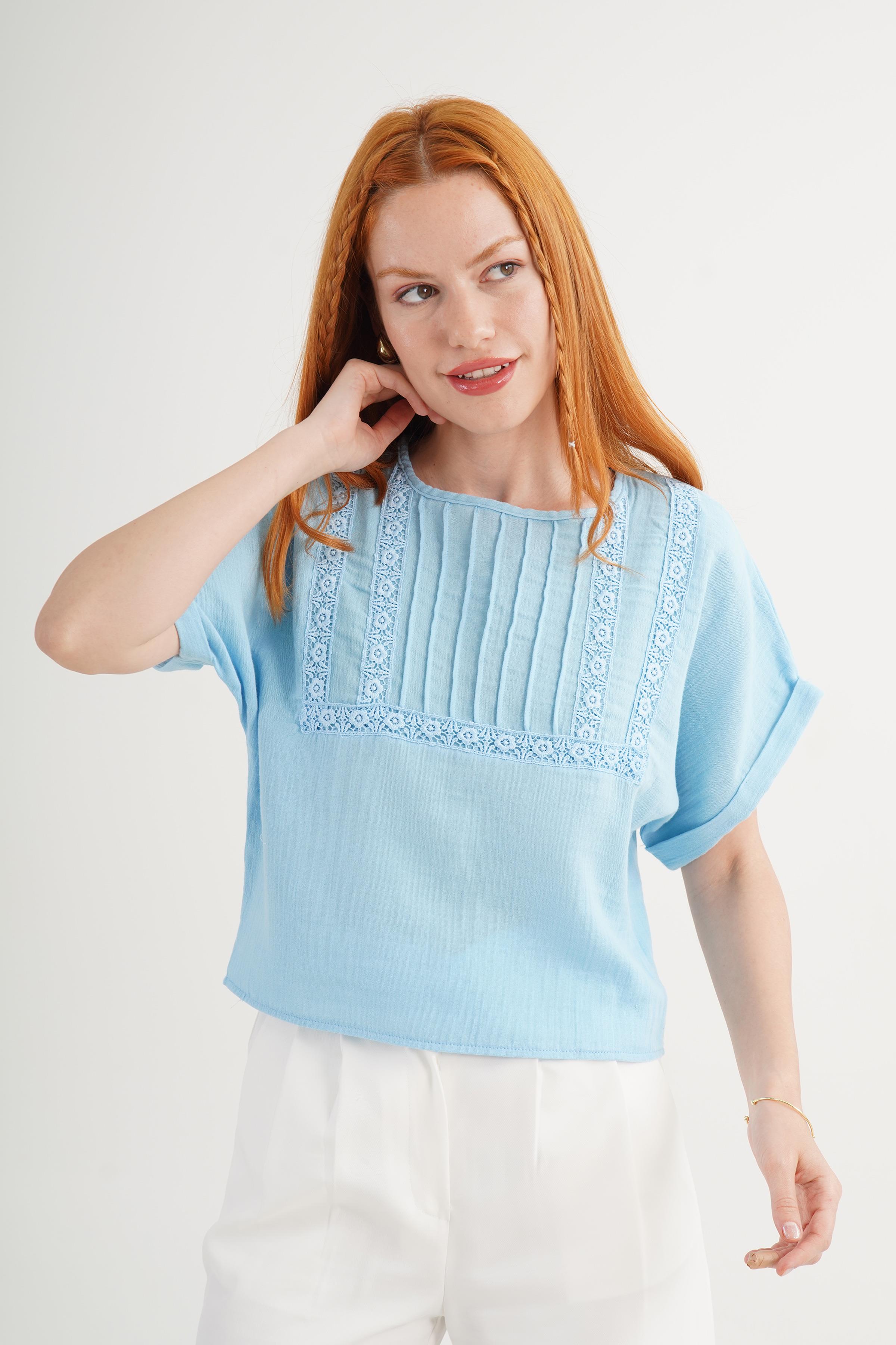 Ön Dantel Detaylı Toptan Mavi Bluz