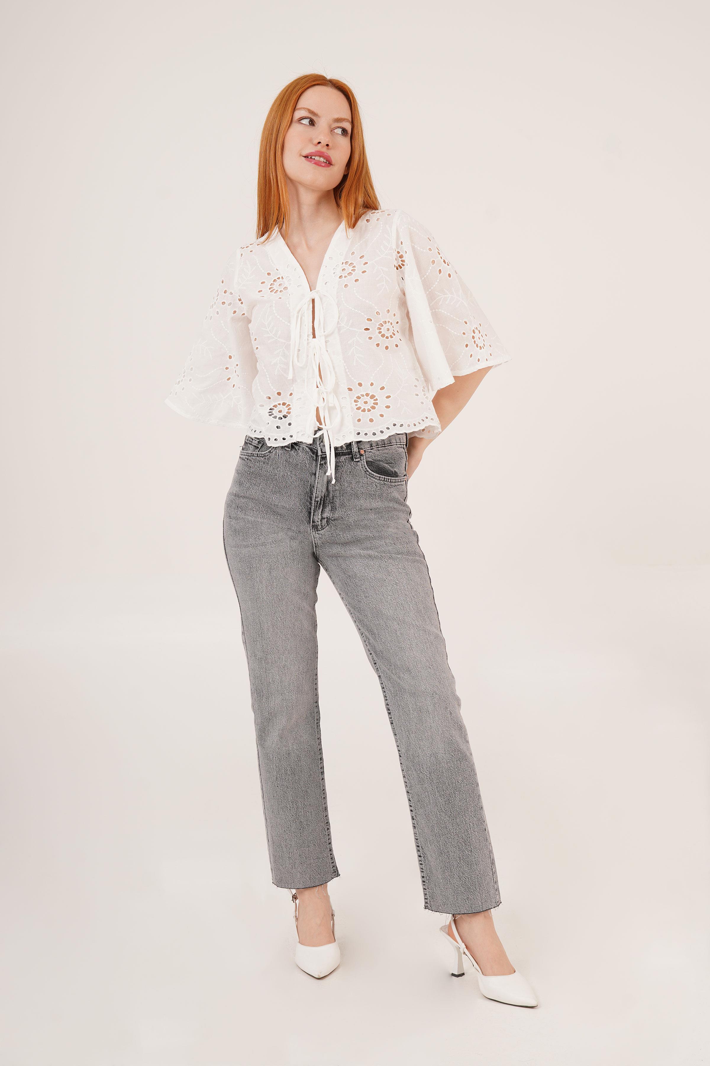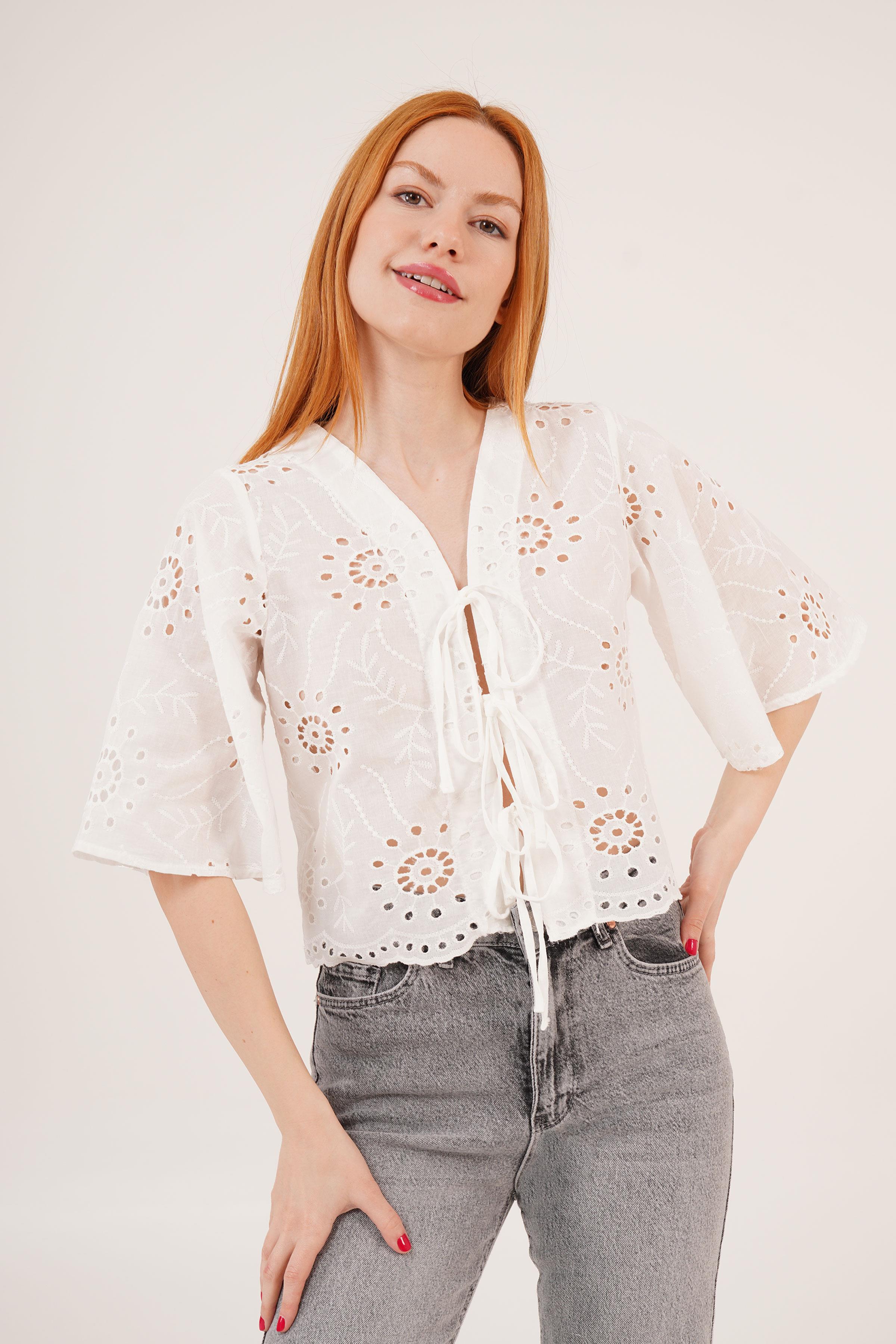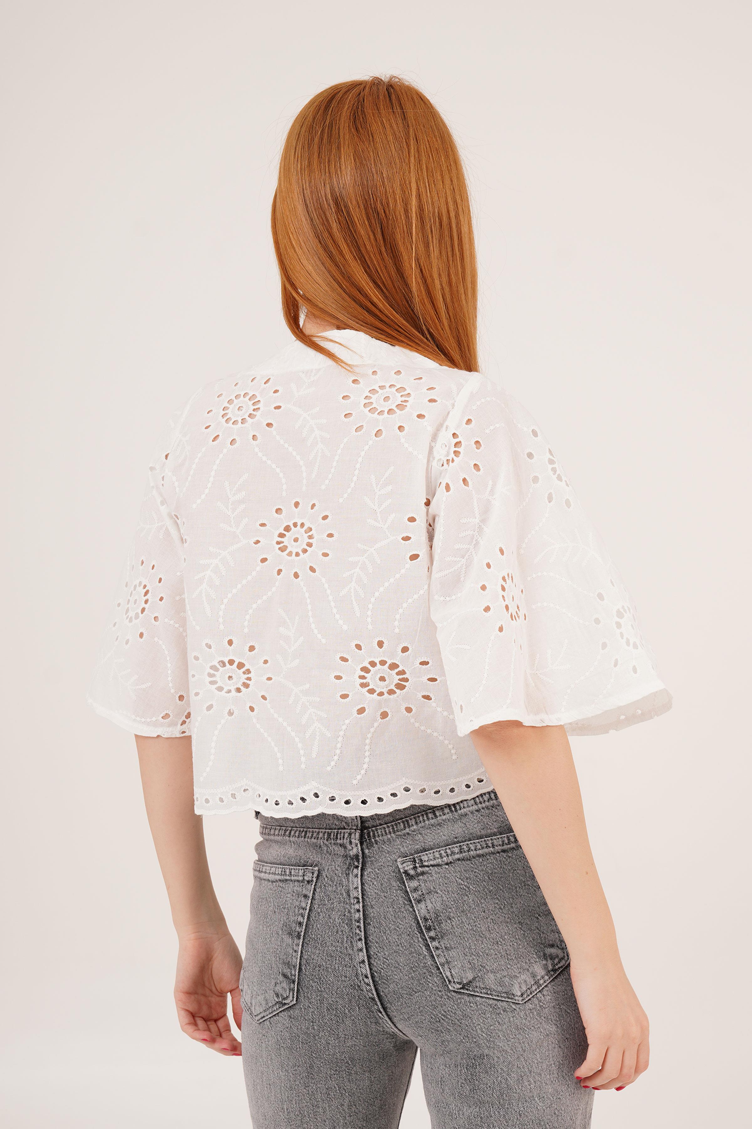 Önden Bağlamalı Delik Geçiş Detaylı Beyaz Crop Toptan Gömlek
