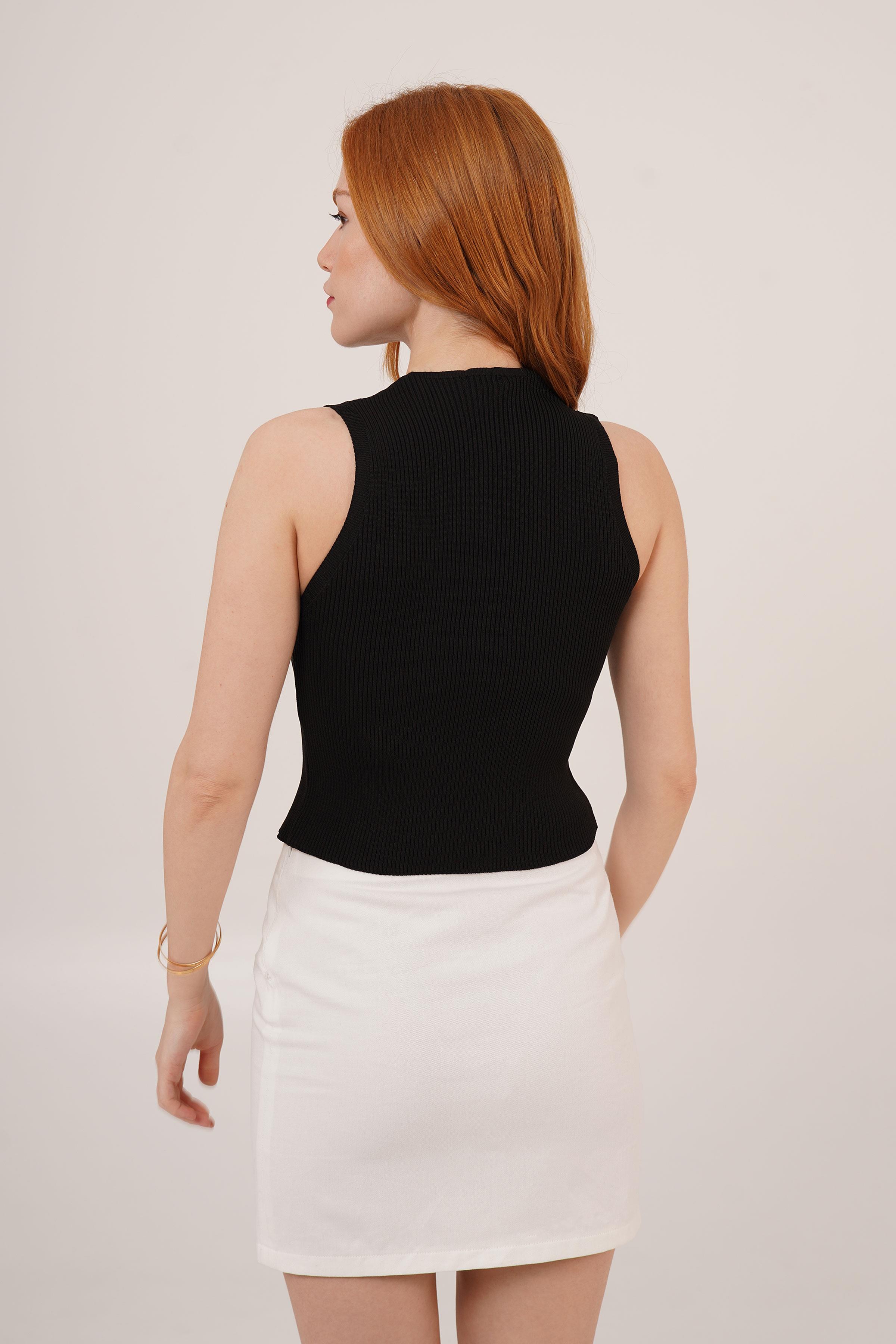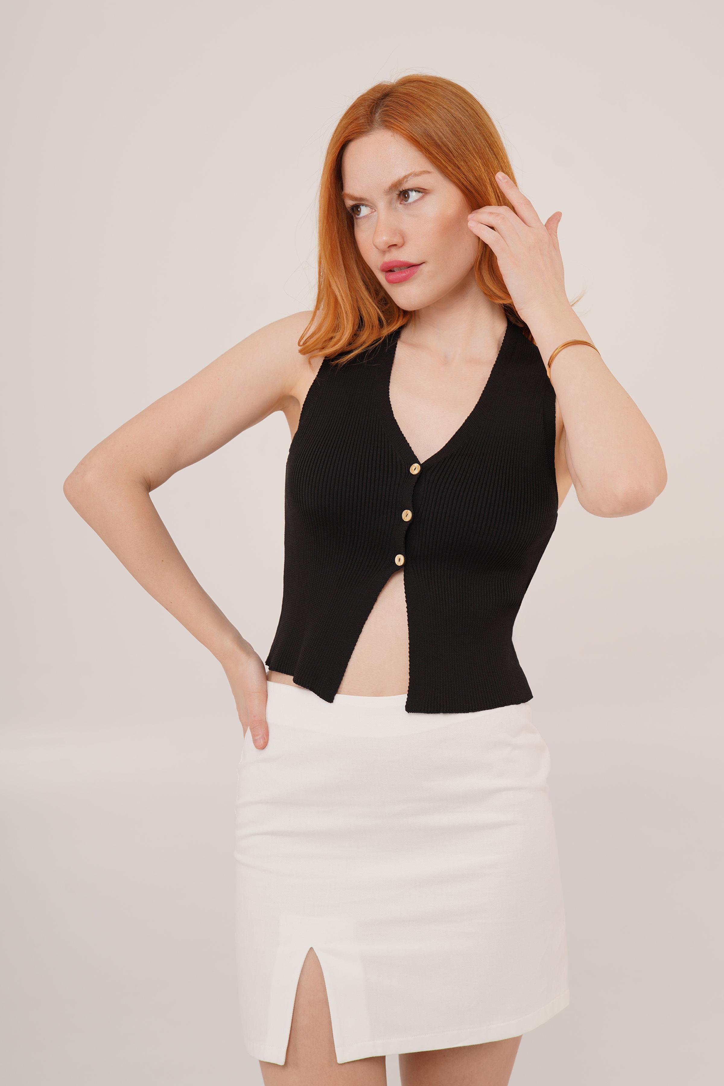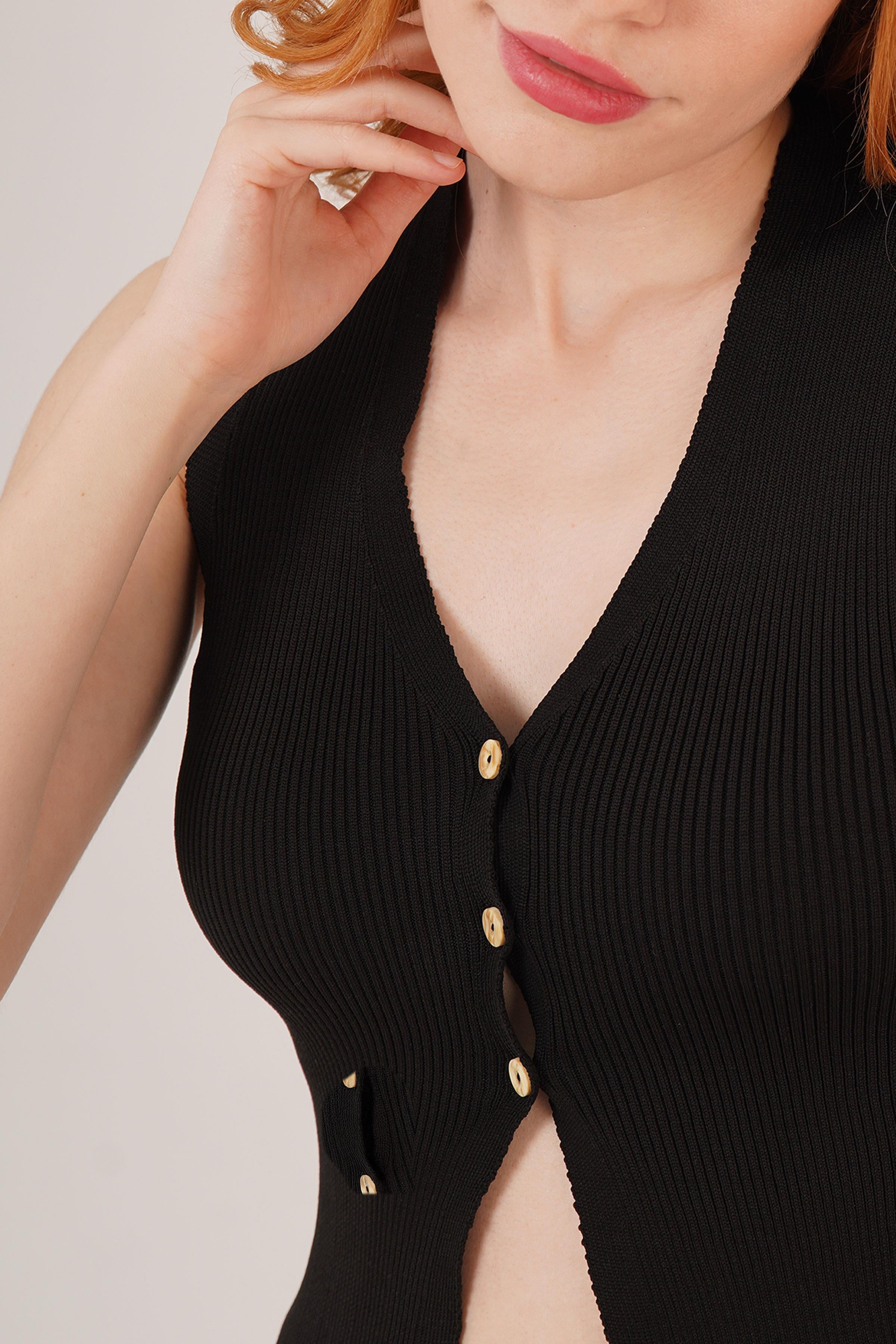 Sıfır Kol Düğme Detaylı Fitilli Siyah Toptan Bluz