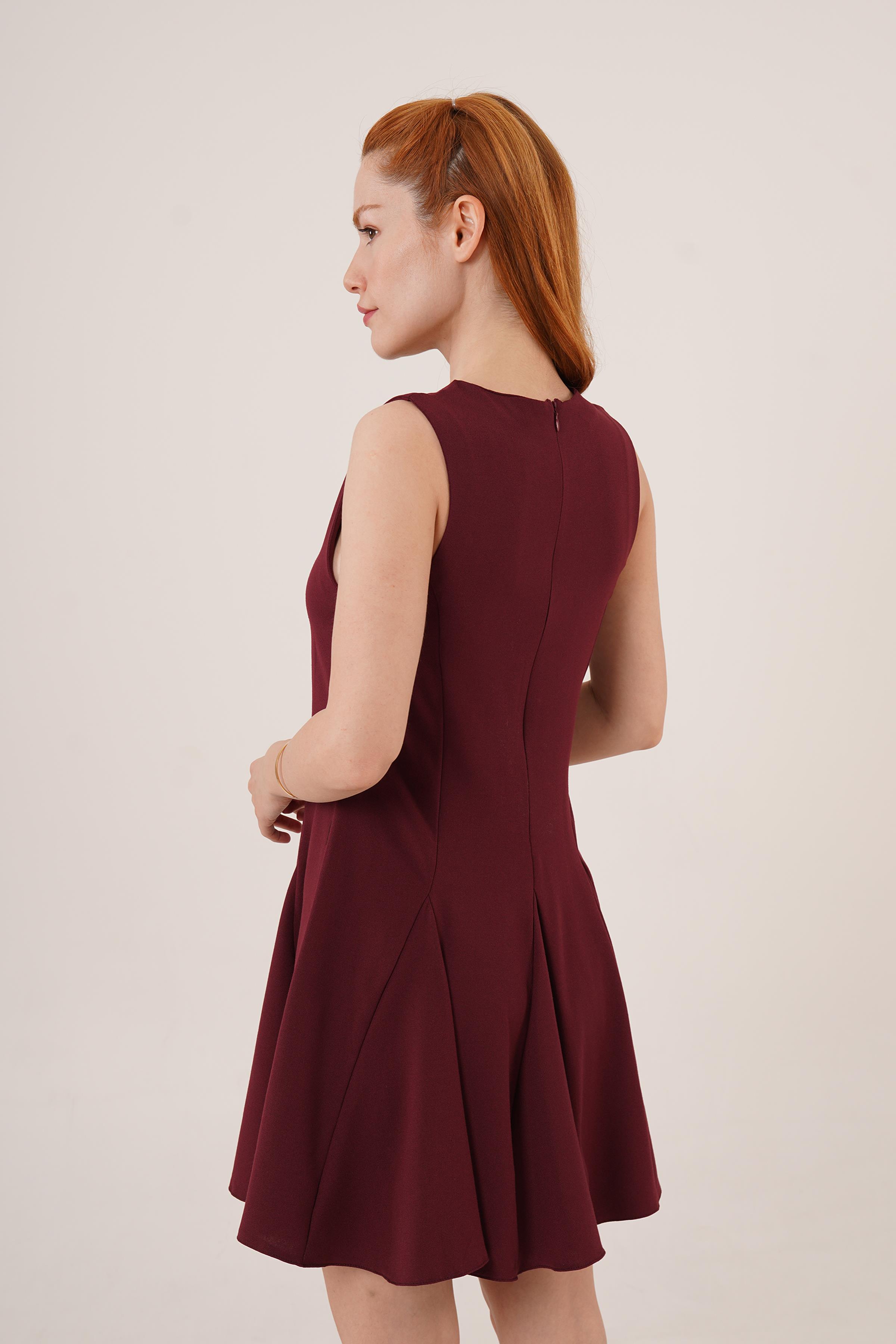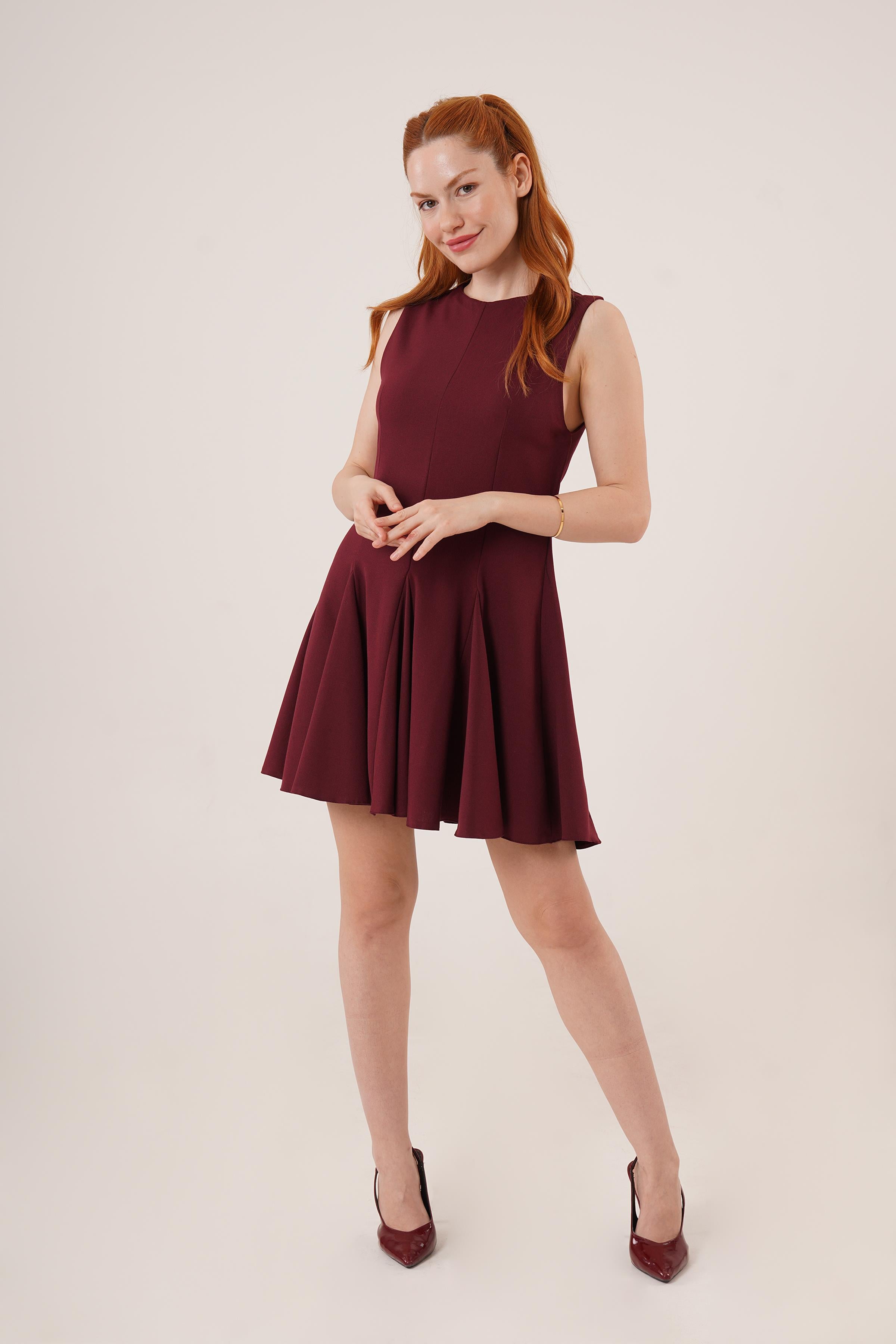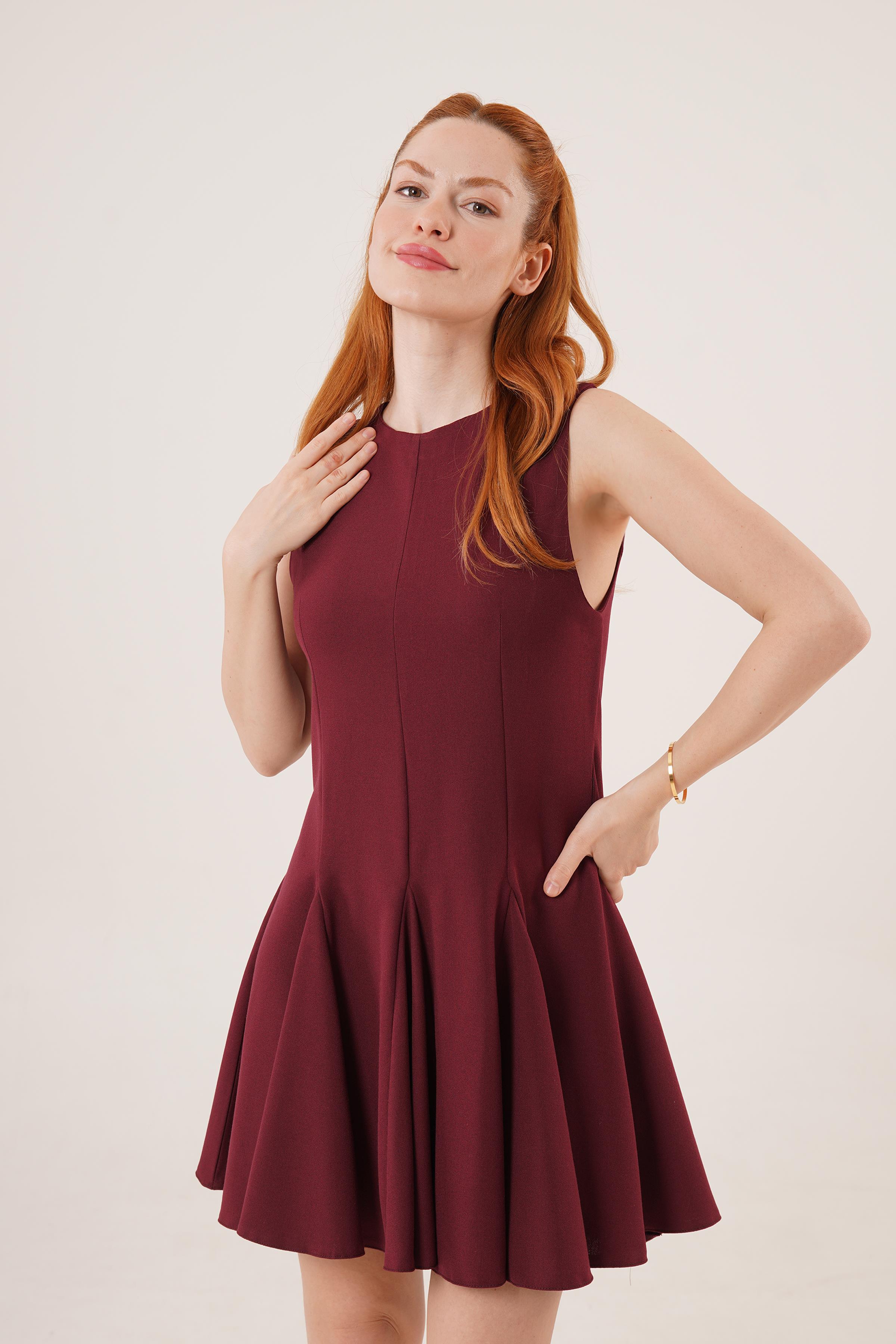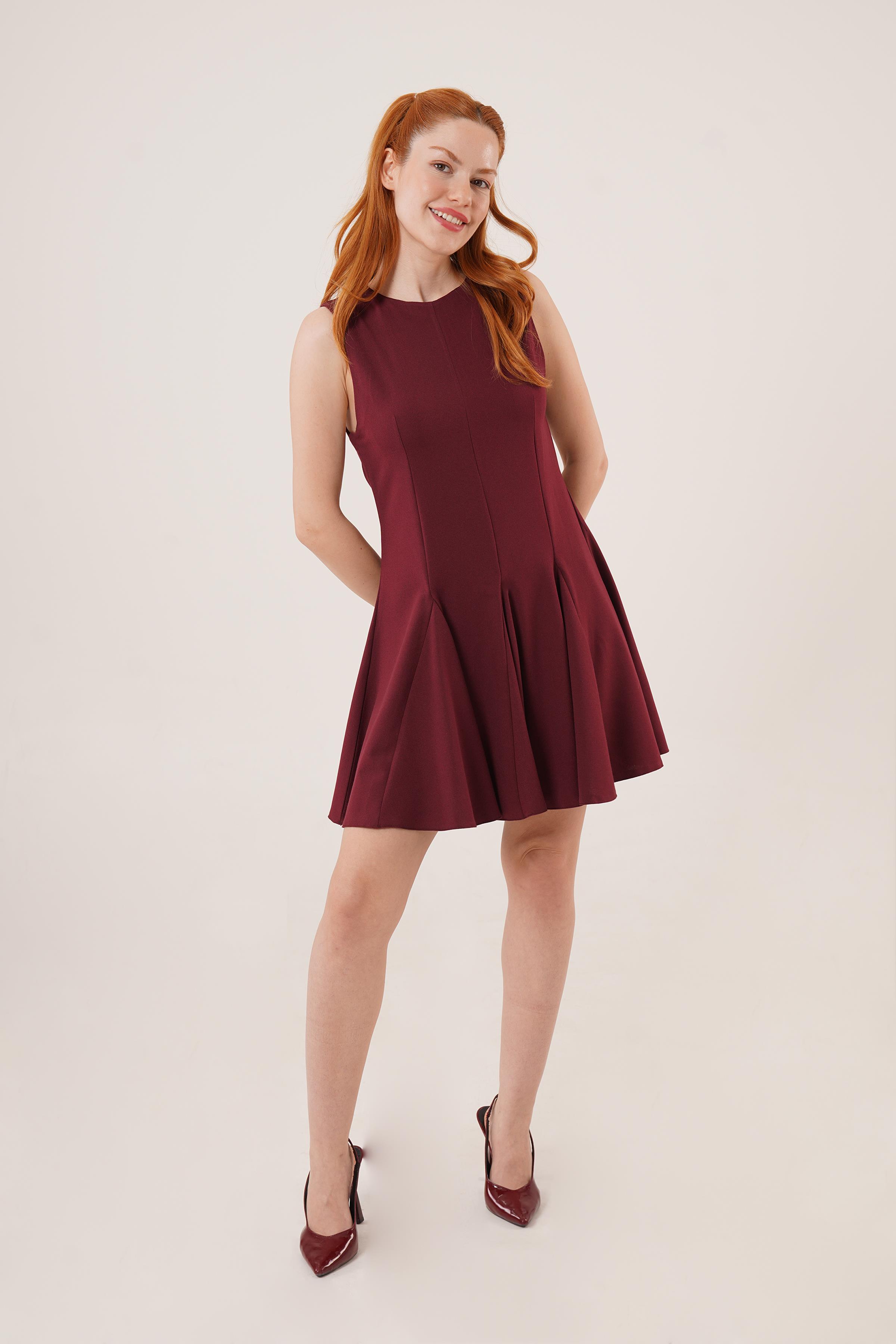 Sıfır Kol Pileli Toptan Bordo Mini Elbise