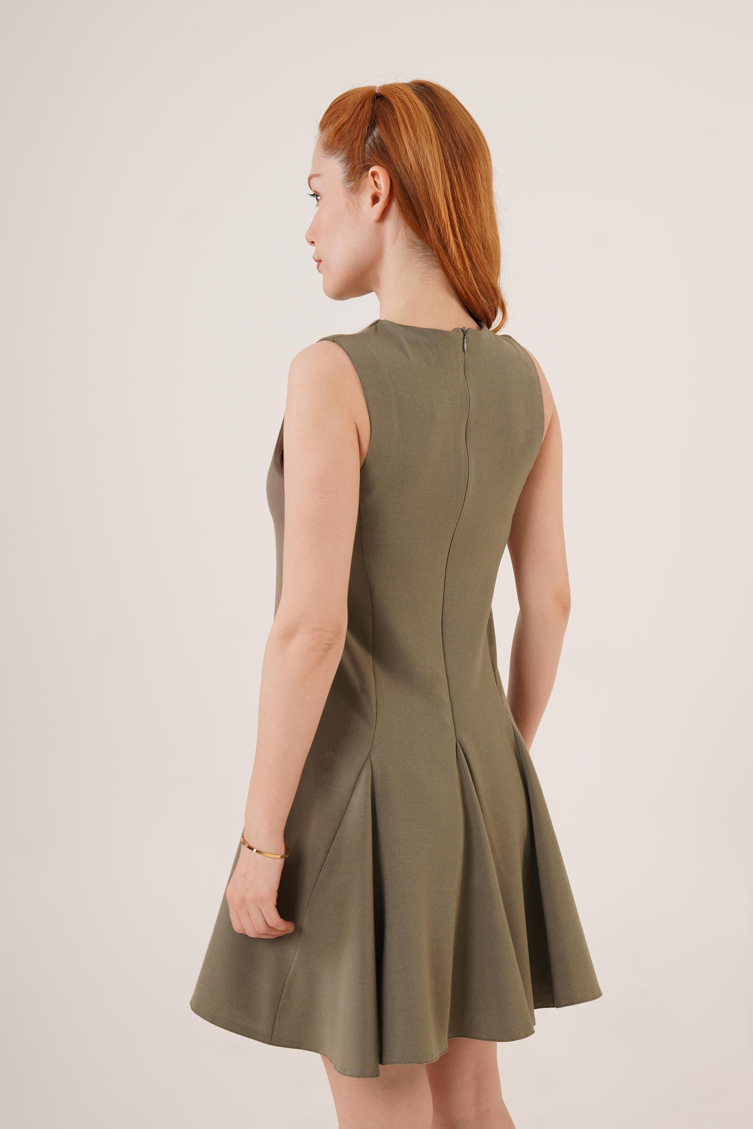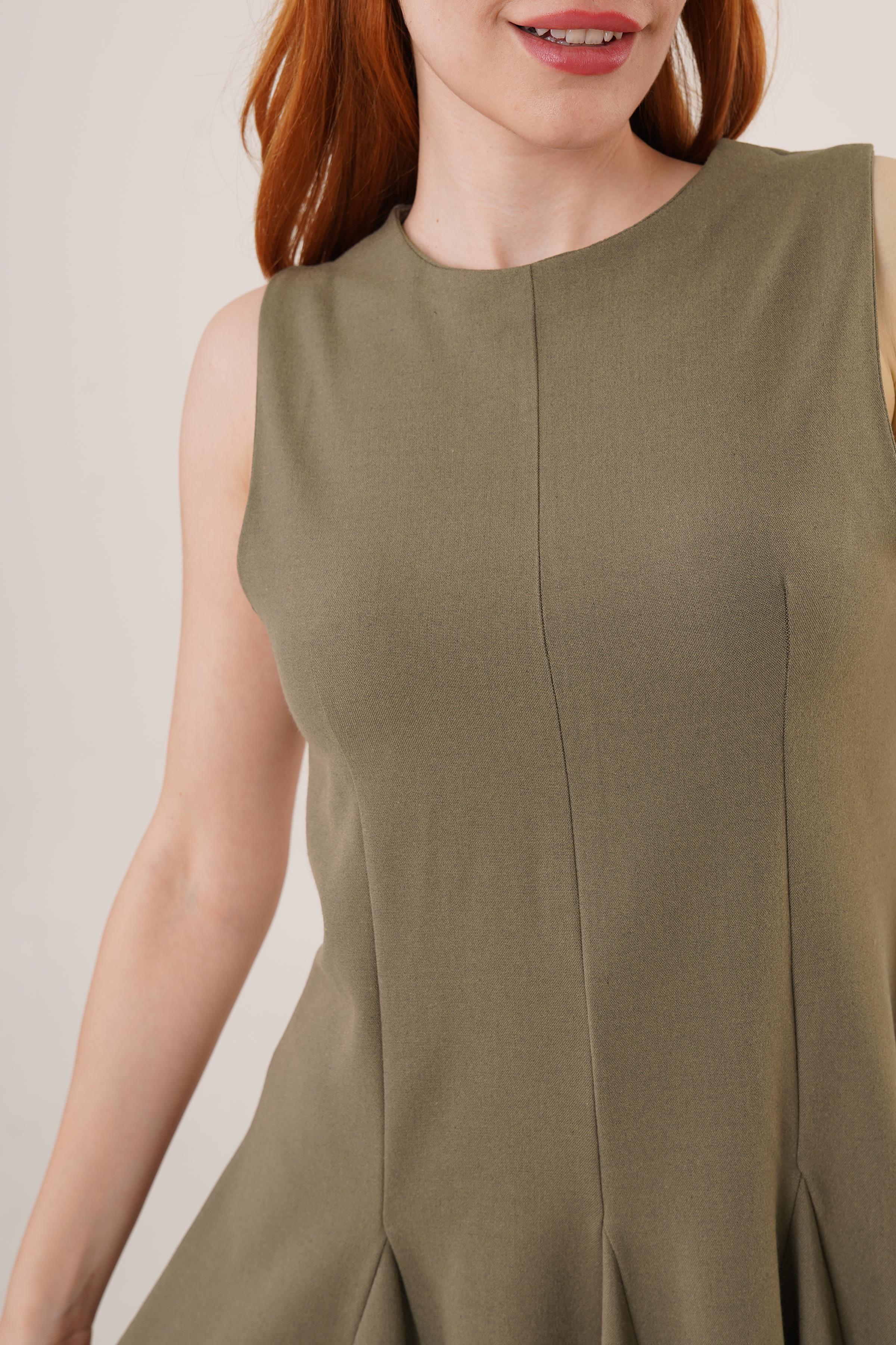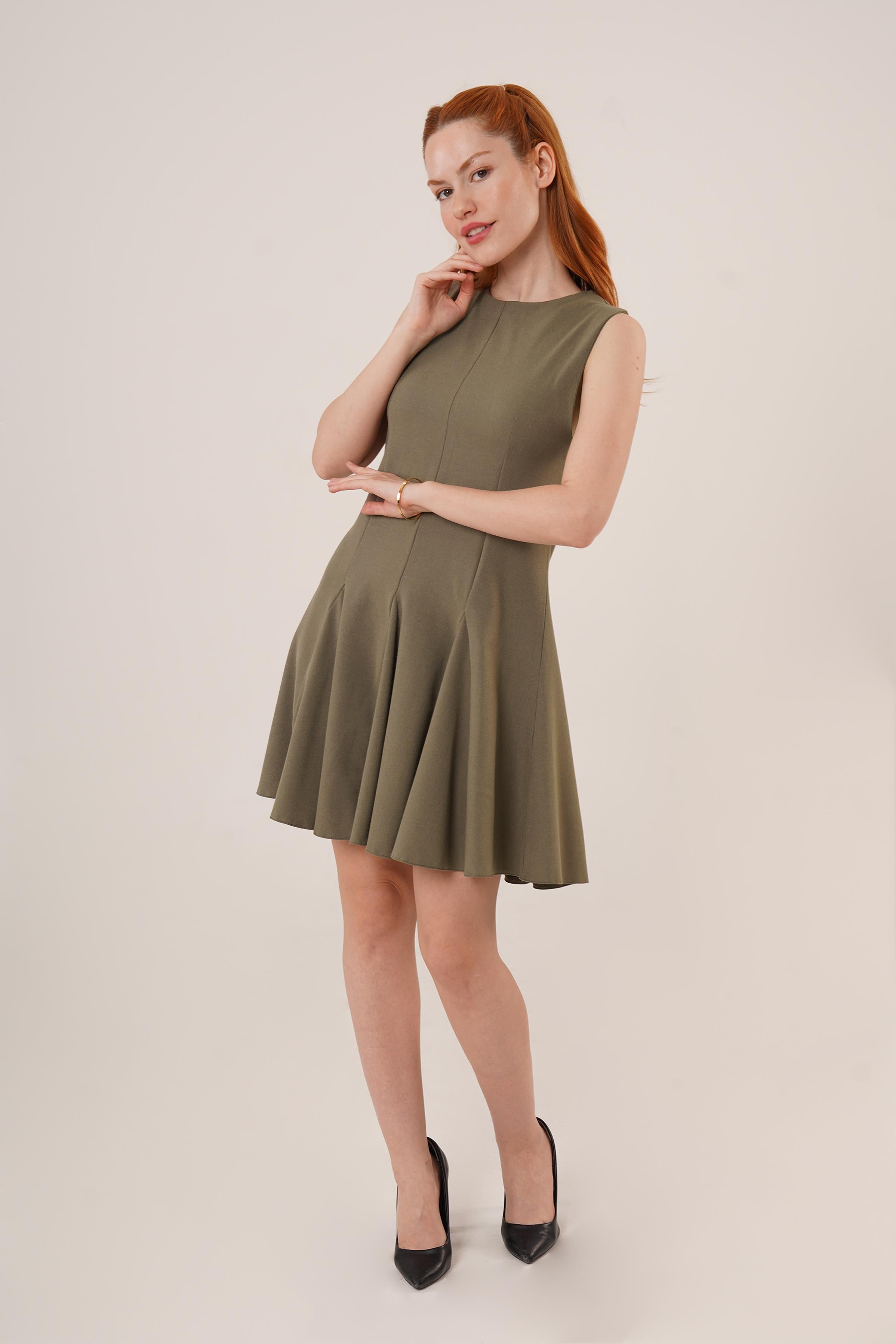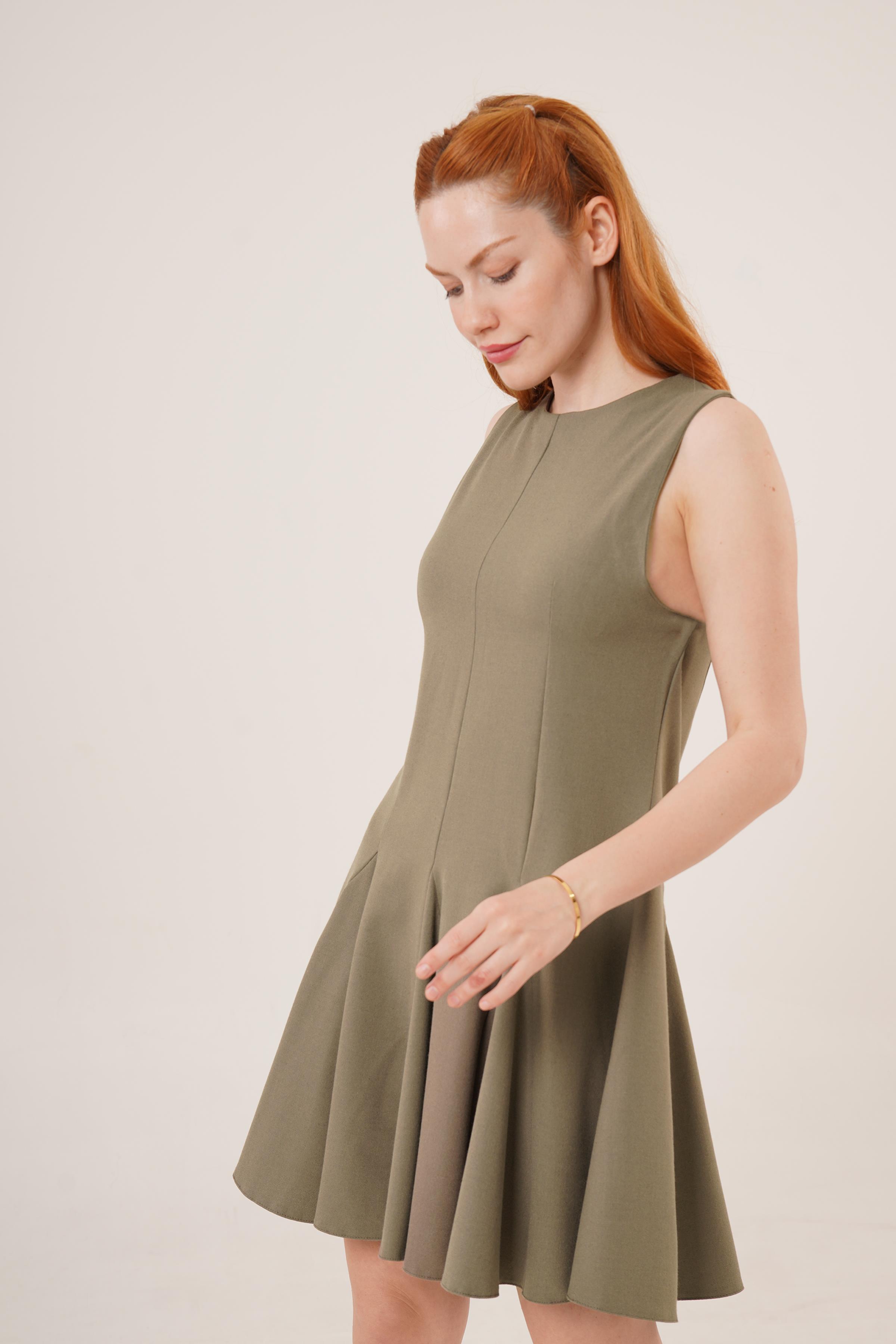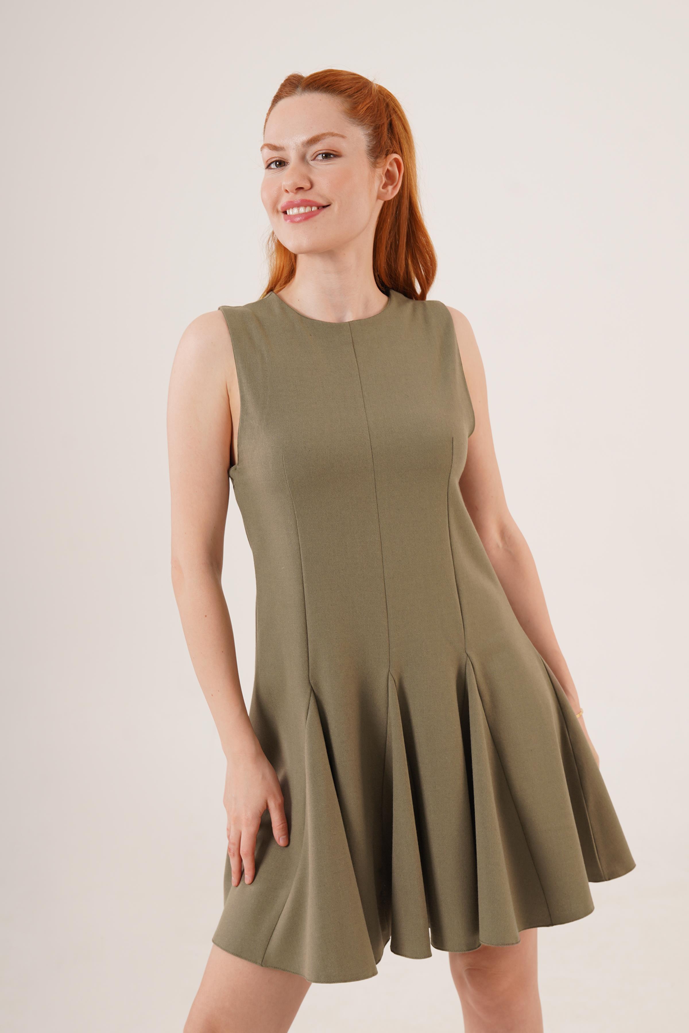 Sıfır Kol Pileli Toptan Haki Mini Elbise