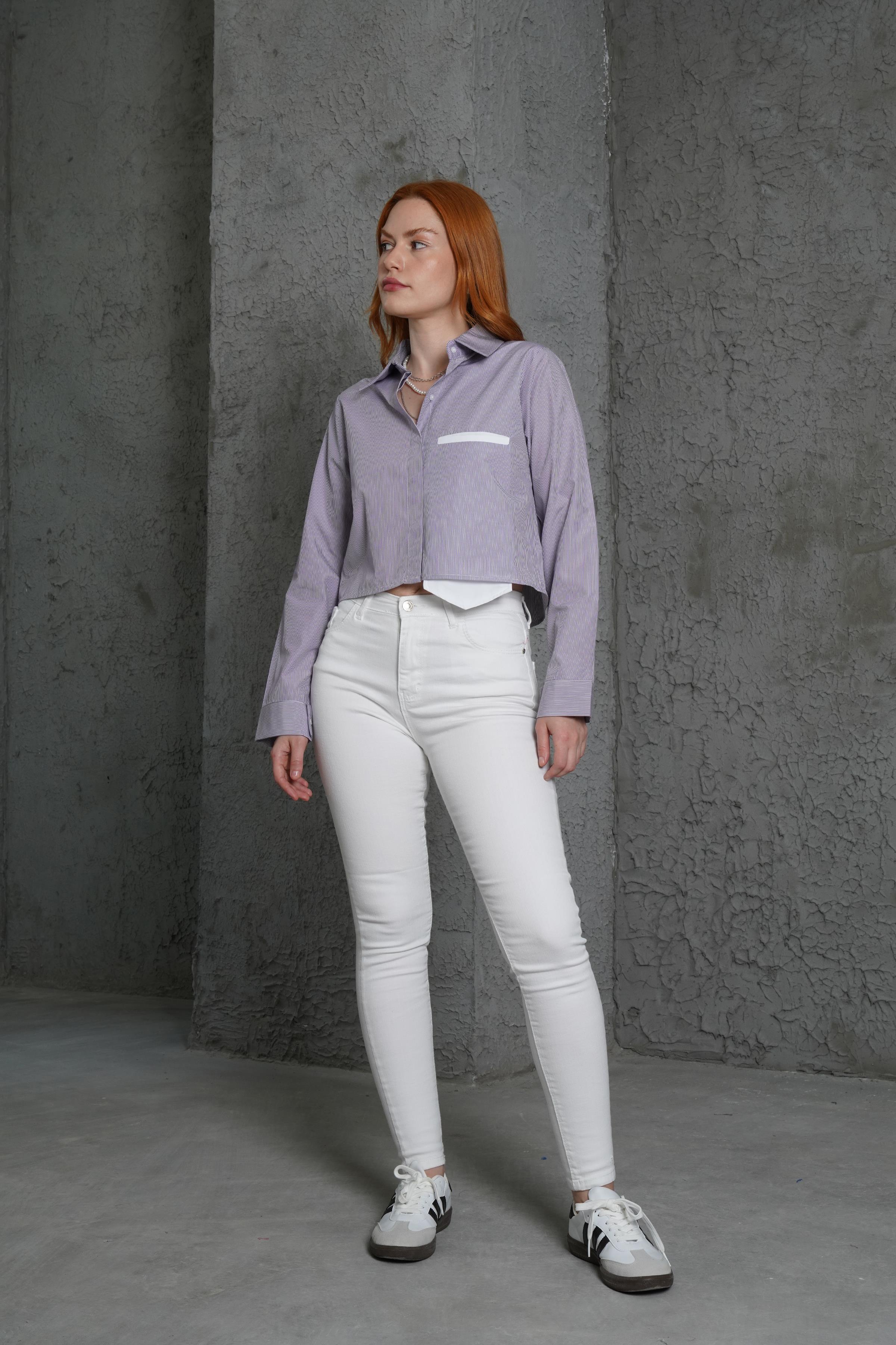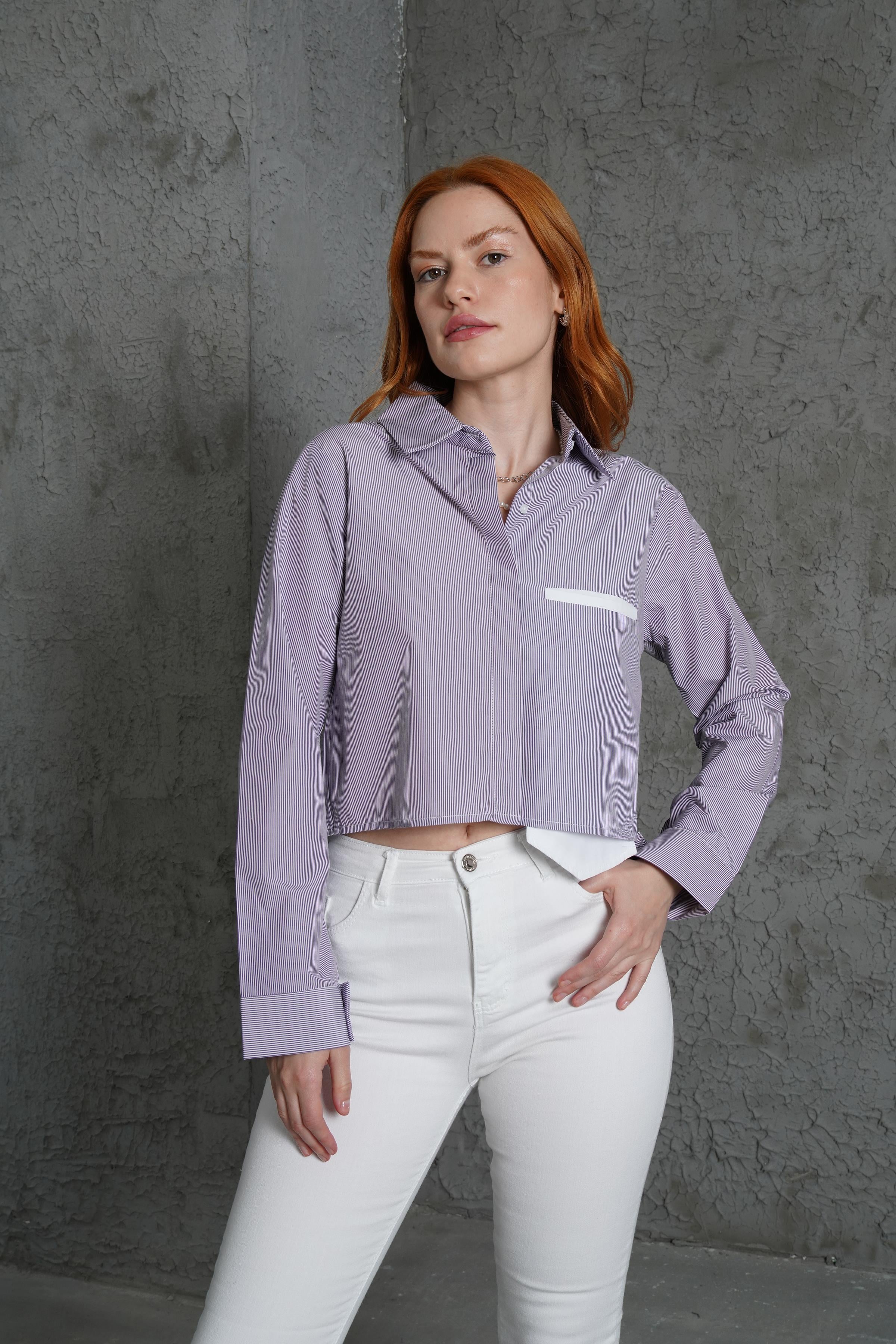 Uzun Cepli Çizgili Mor Toptan Gömlek