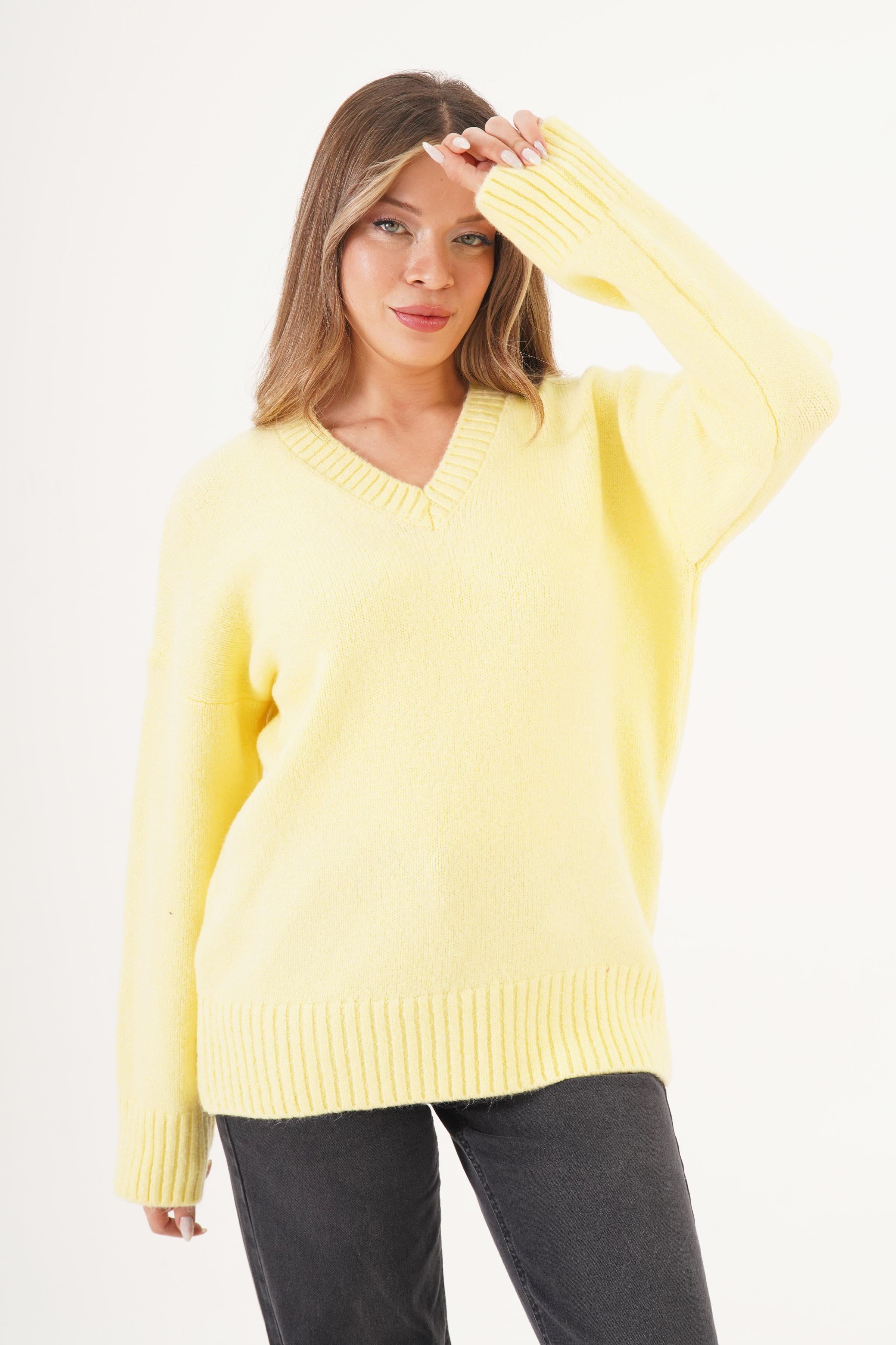 V Yaka Kalın Ribanalı Toptan Sarı Kazak