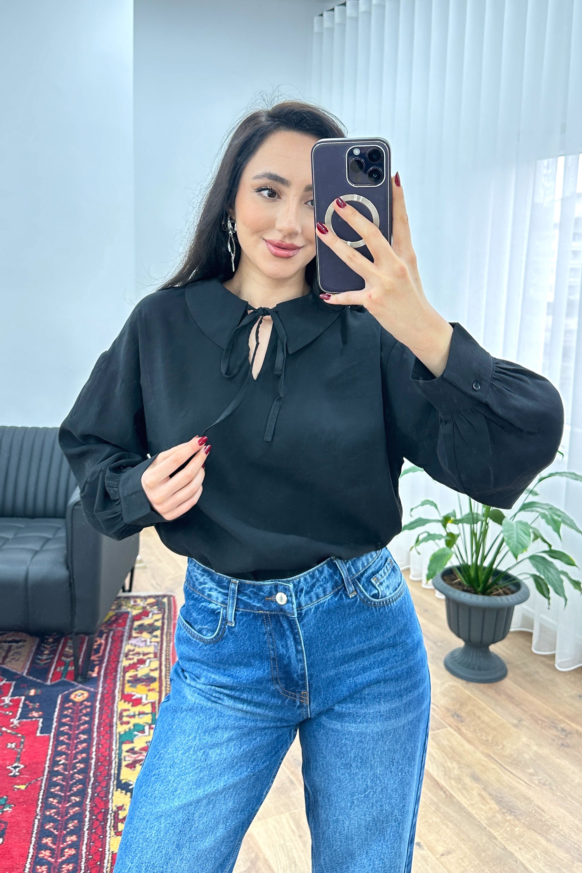 Yaka Bağlamalı Dökümlü Siyah Toptan Bluz