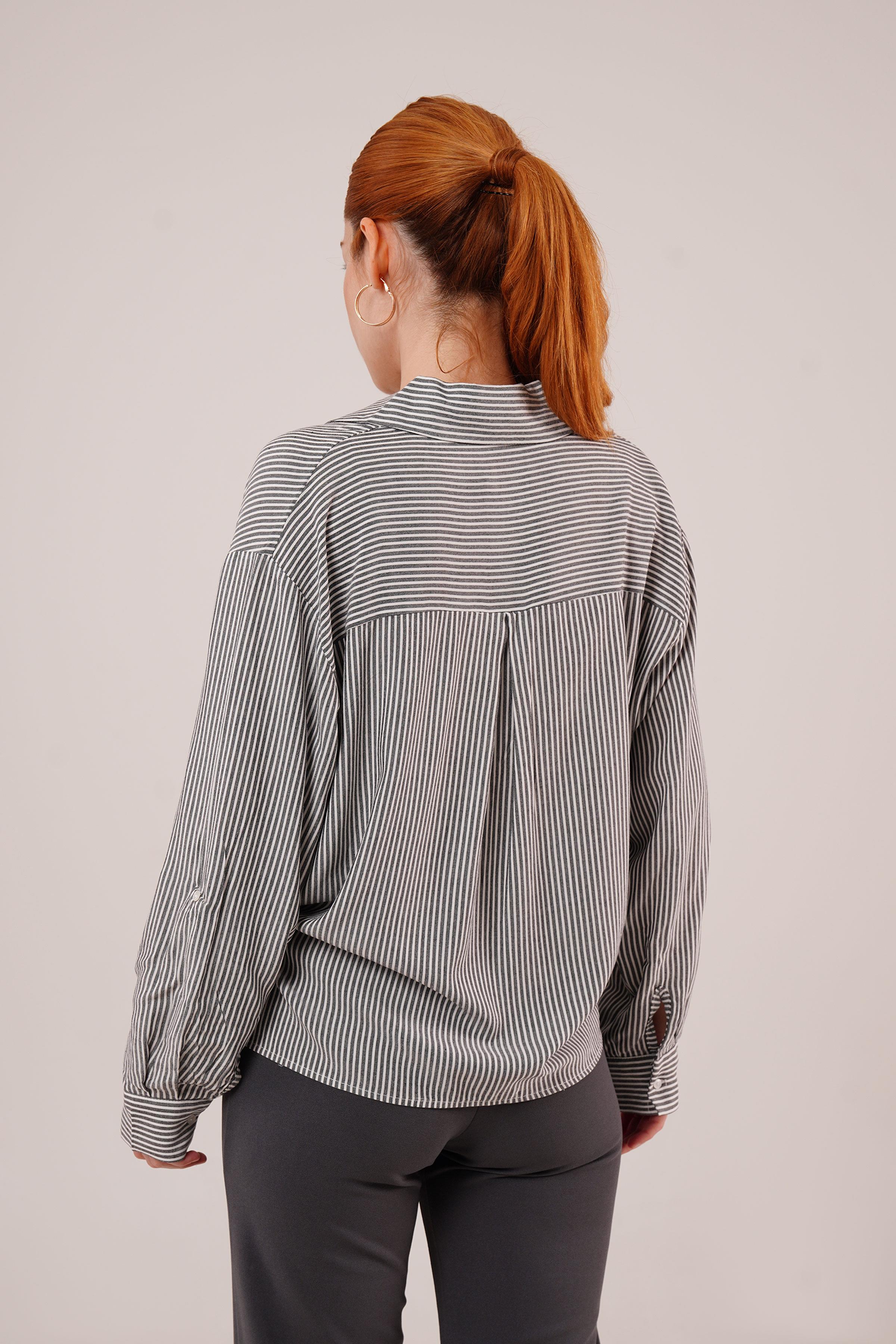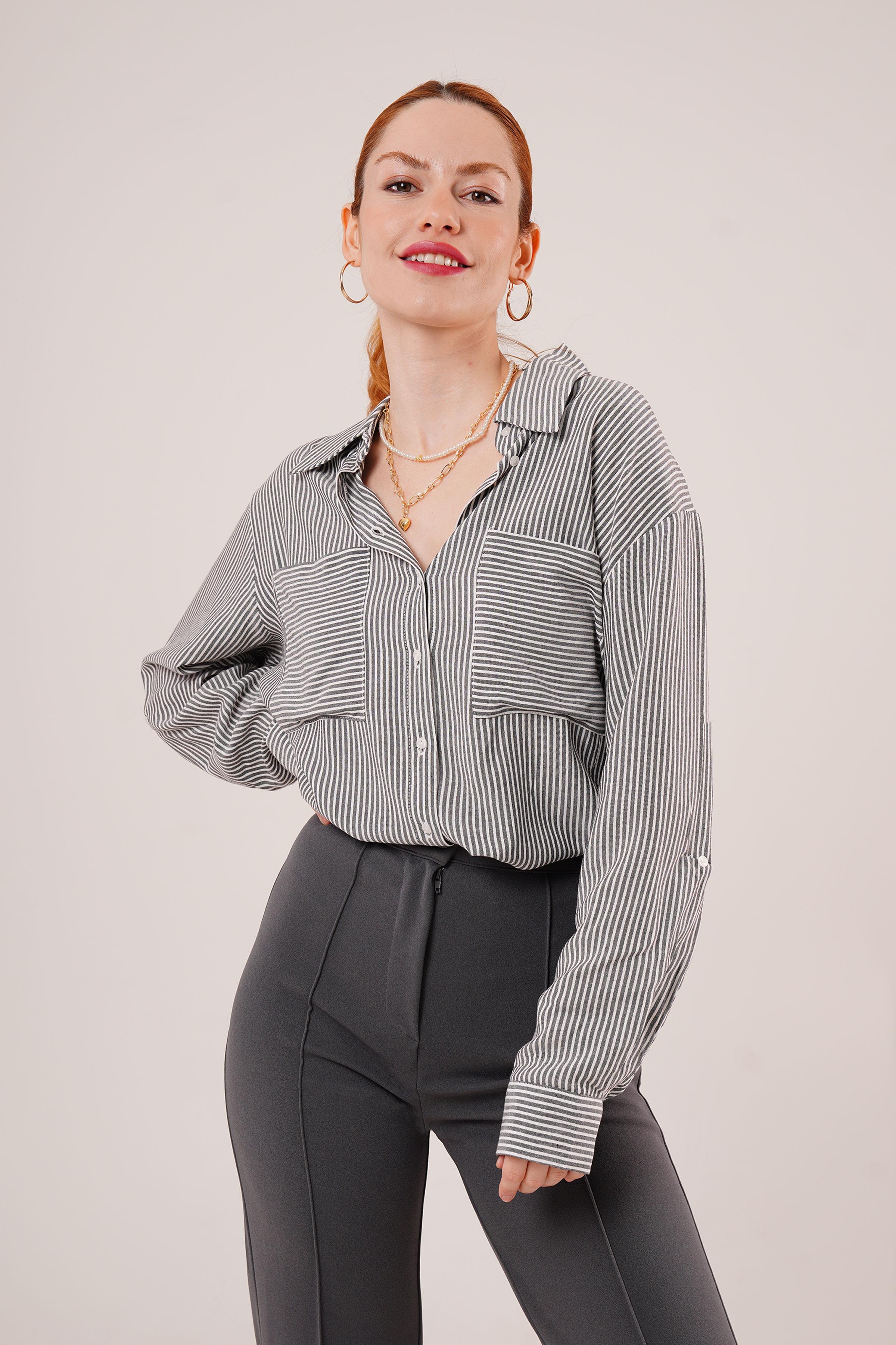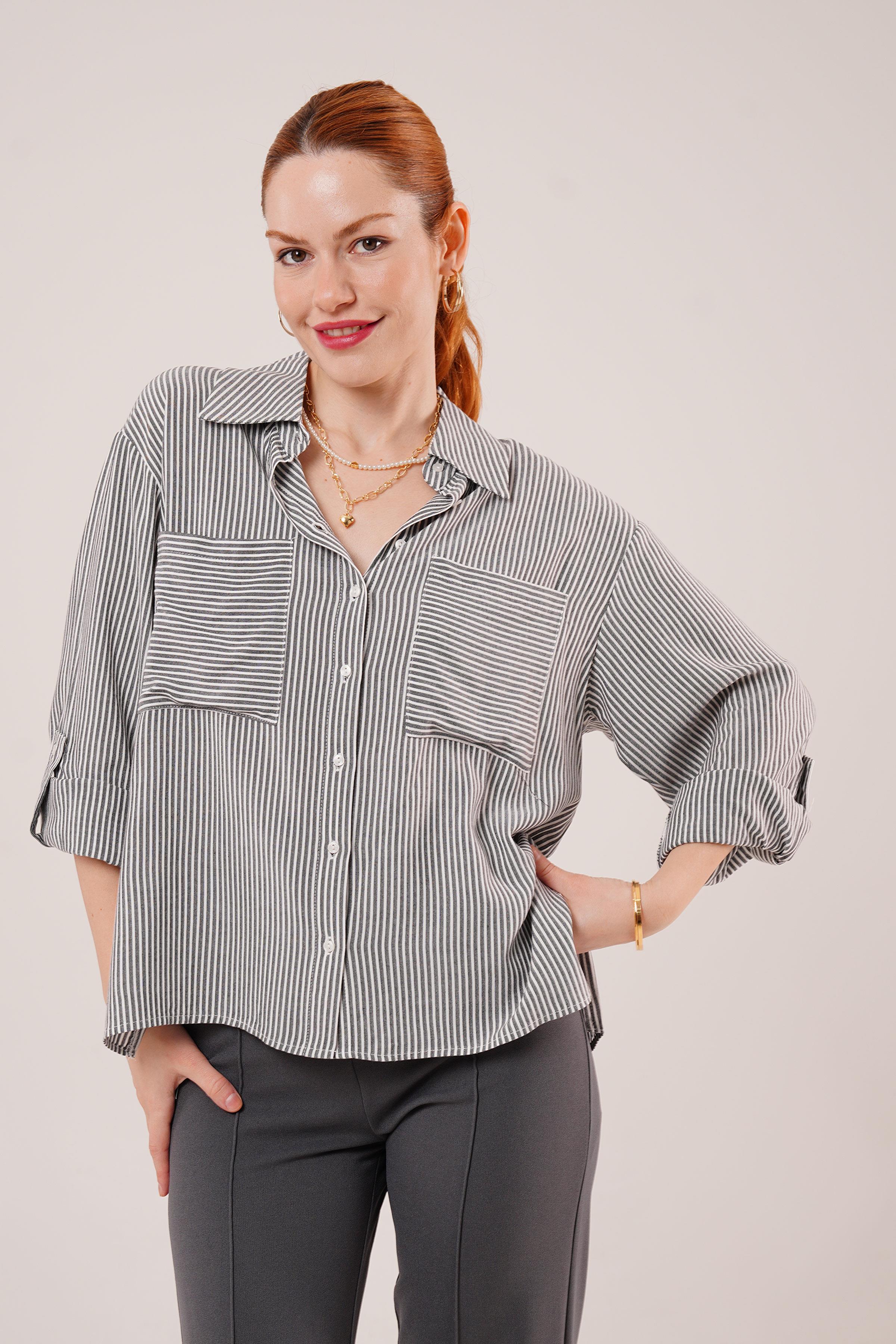 Yarasa Kol Çizgili Cep Detaylı Toptan Gri Gömlek