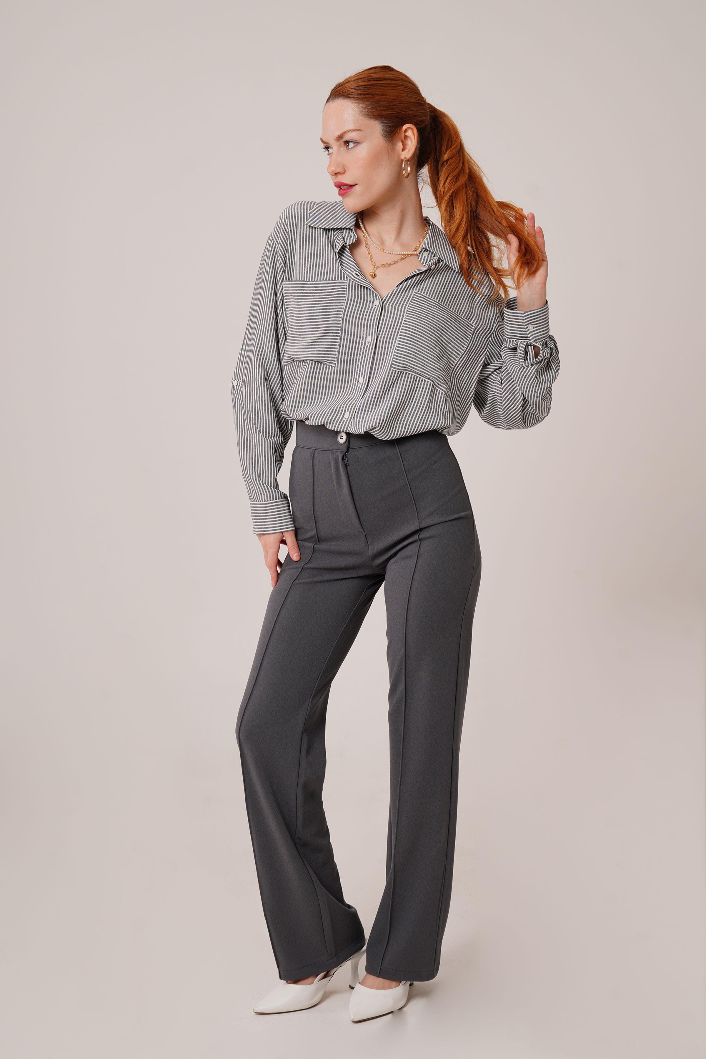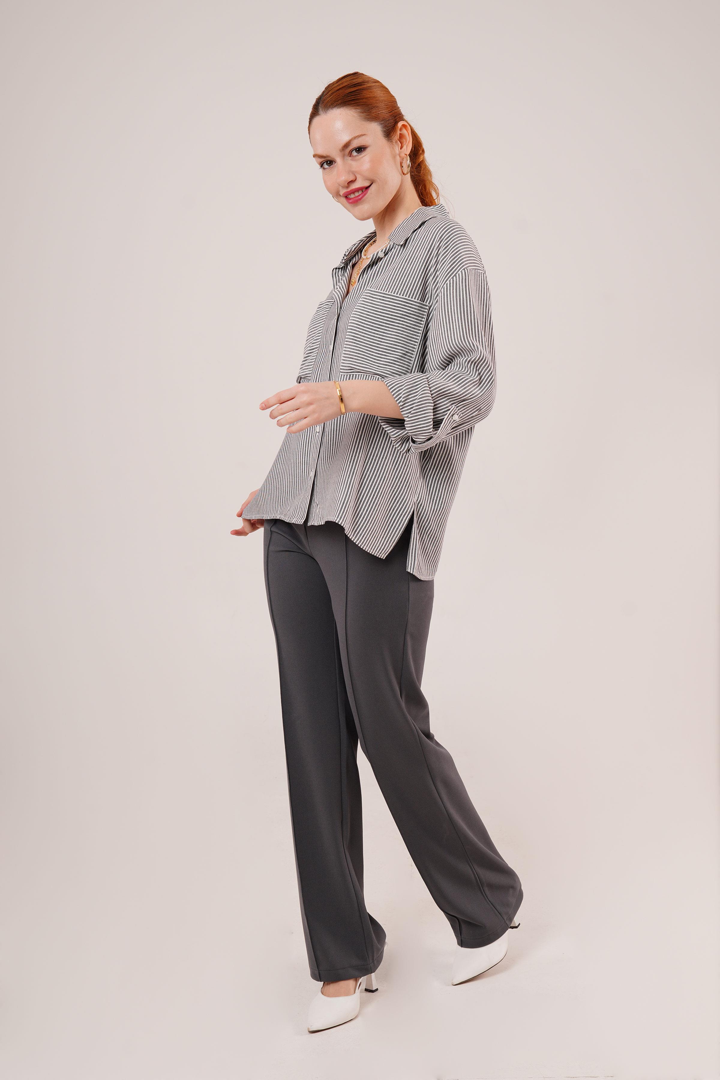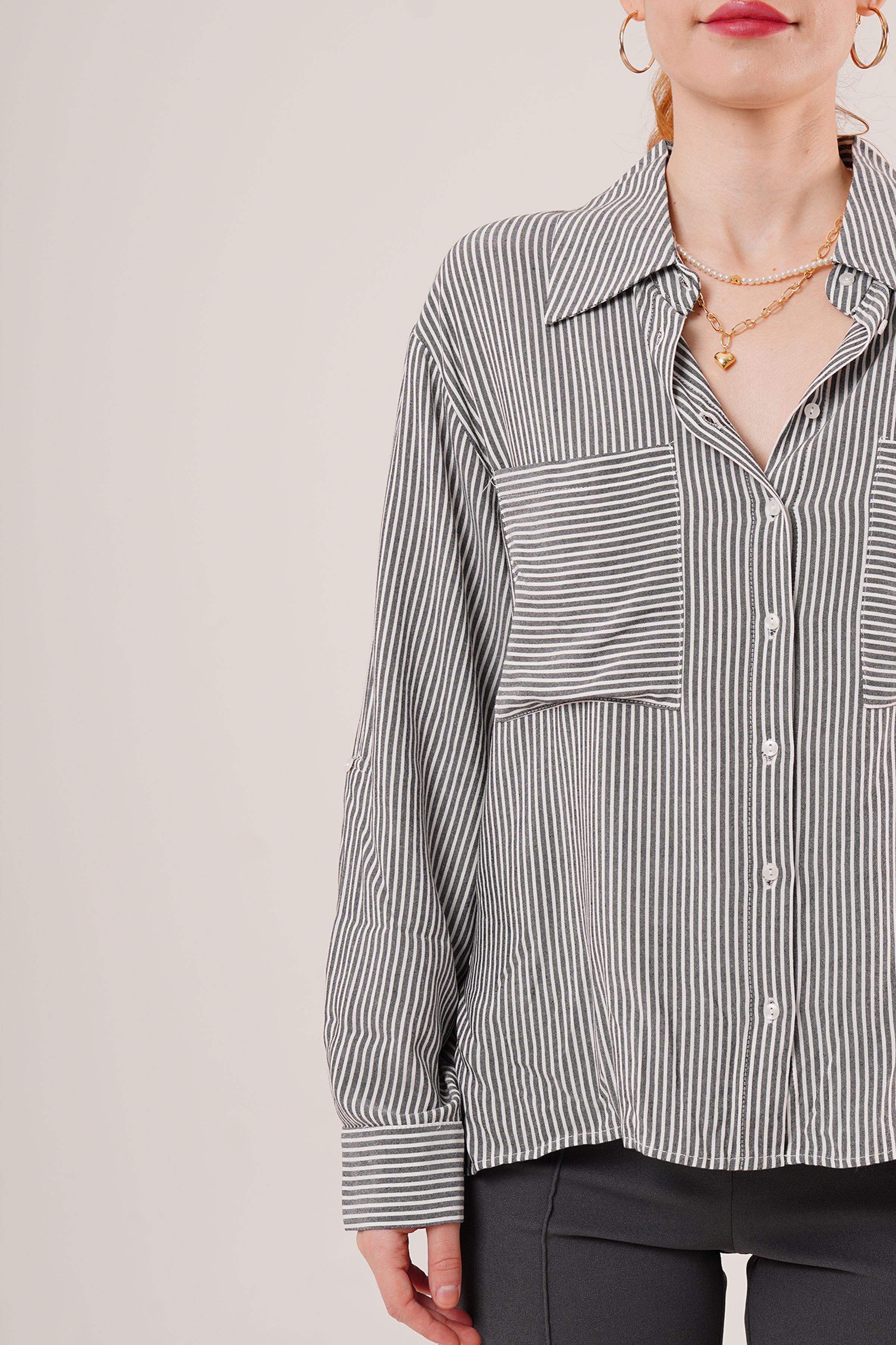 Yarasa Kol Çizgili Cep Detaylı Toptan Gri Gömlek