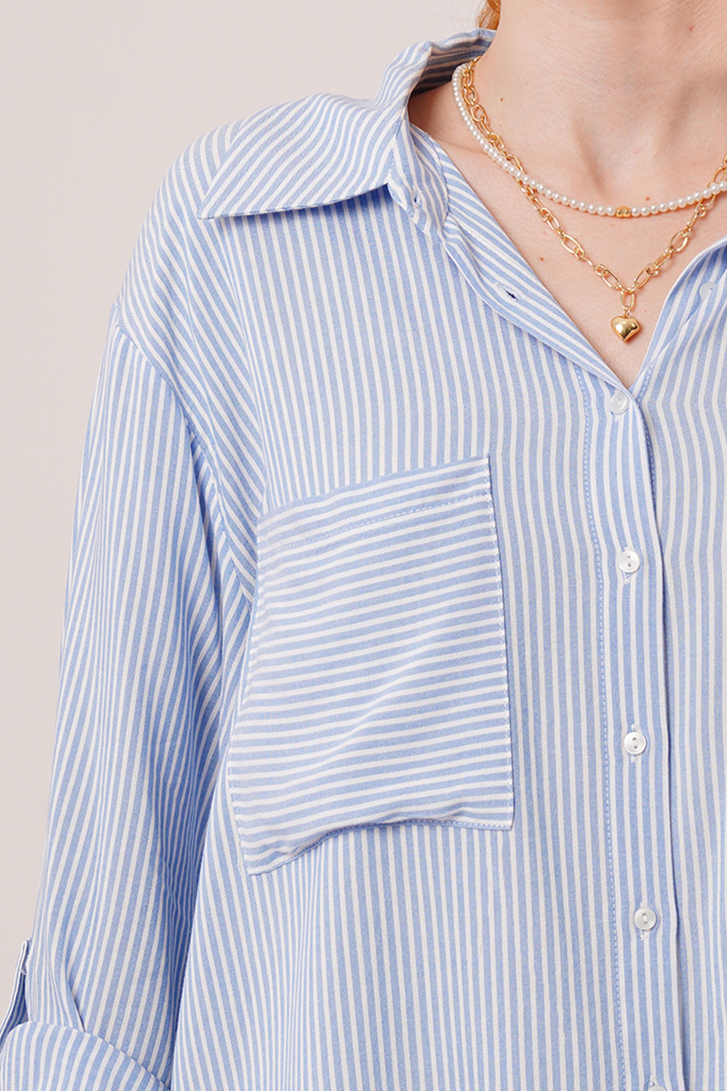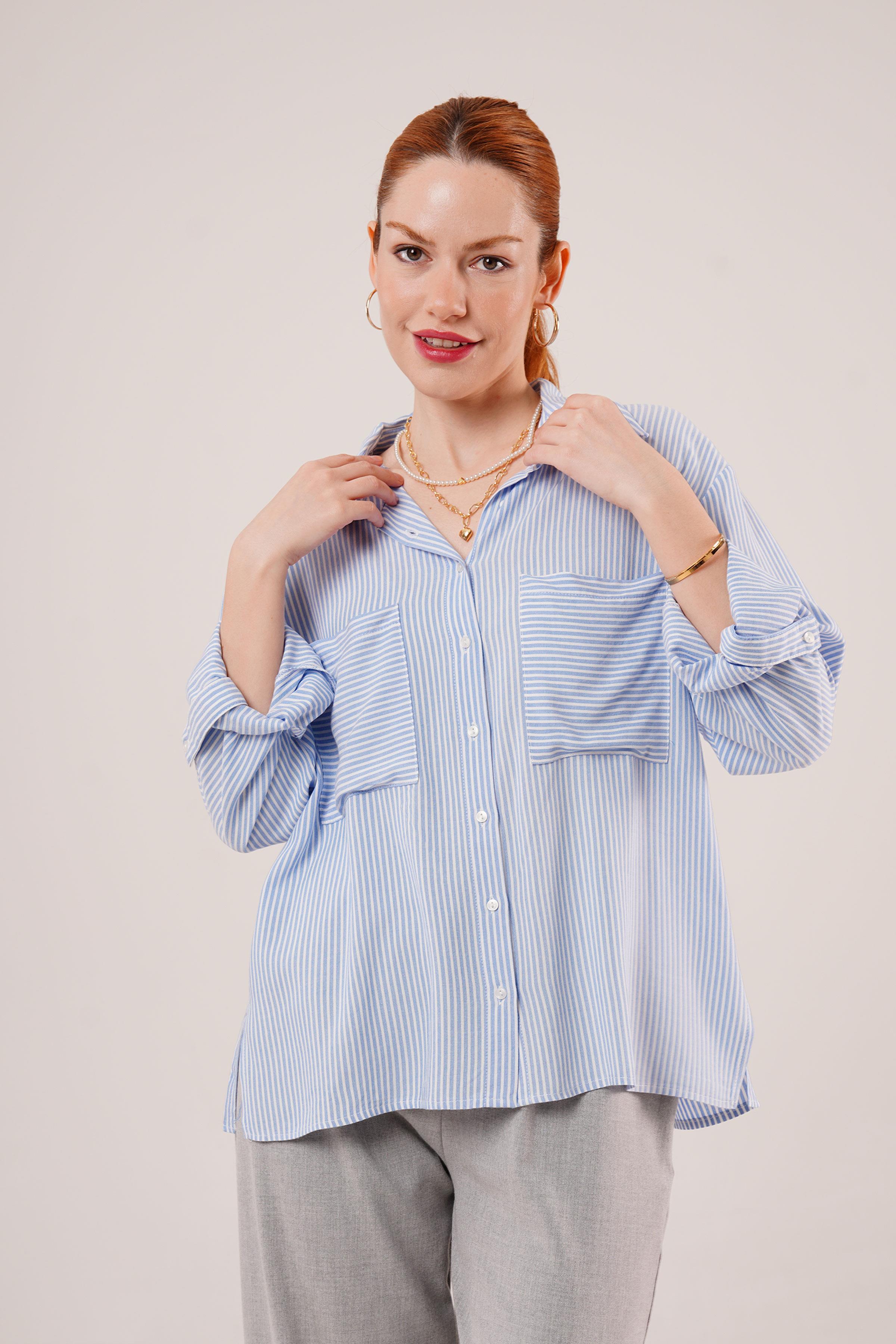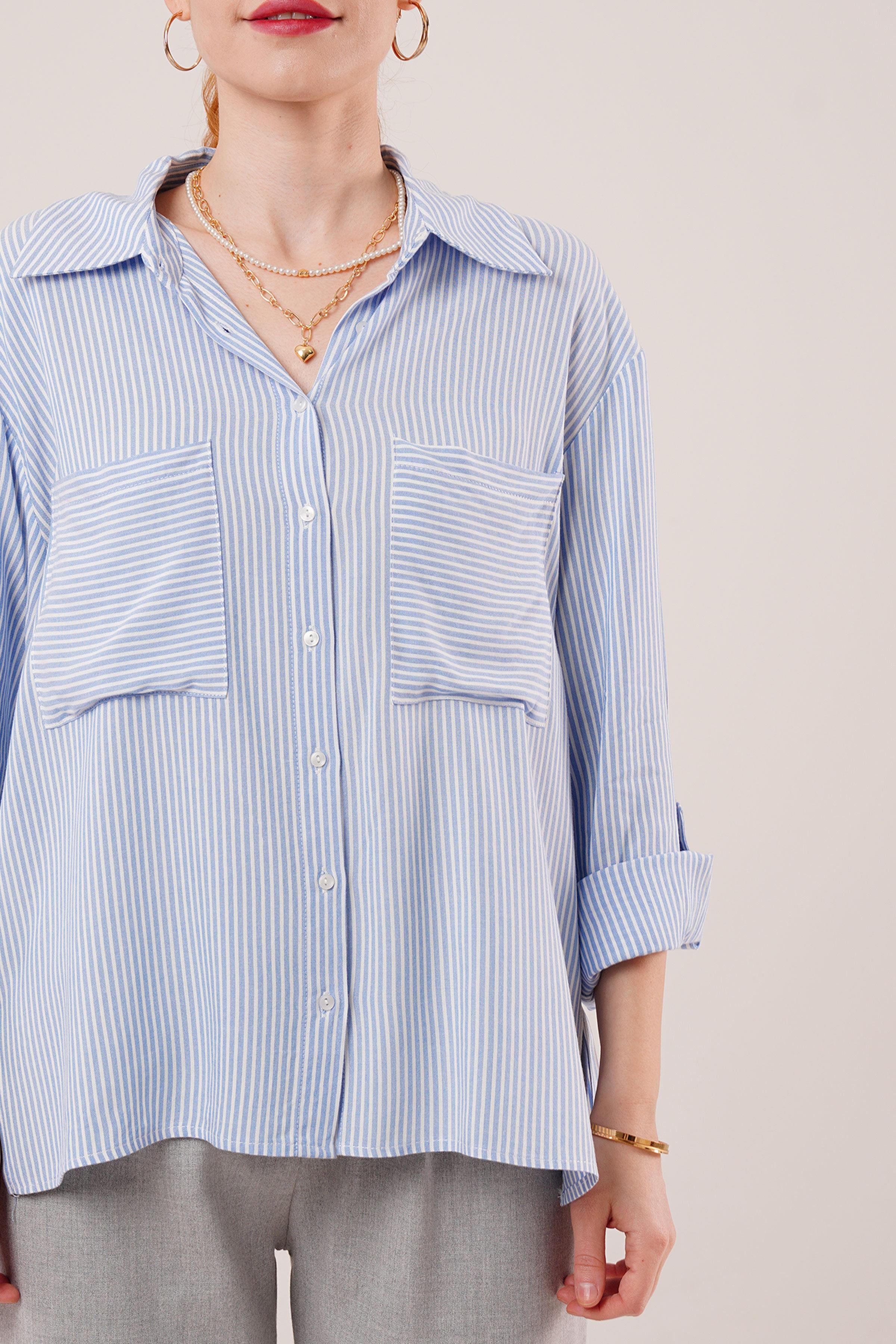 Yarasa Kol Çizgili Cep Detaylı Toptan Mavi Gömlek