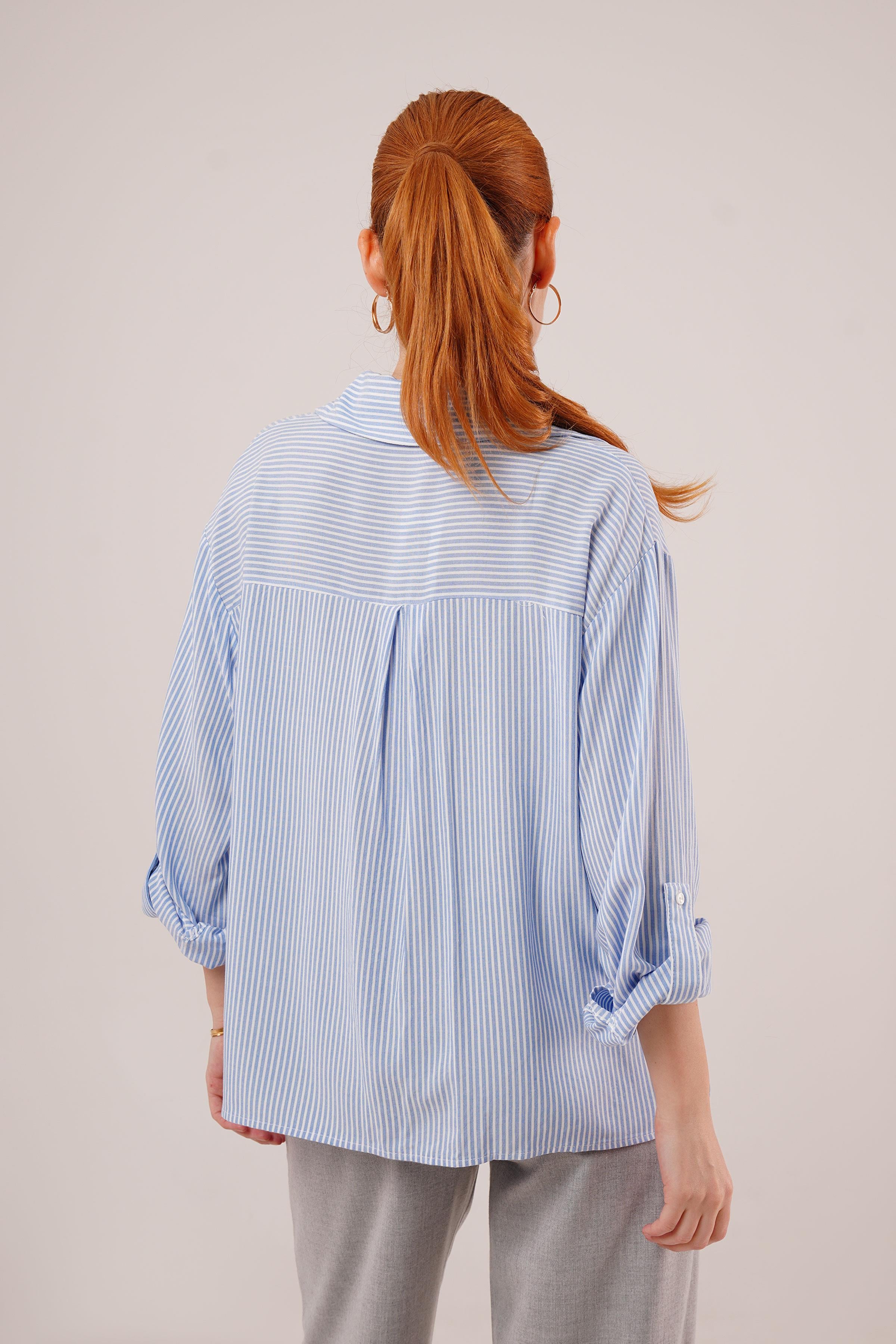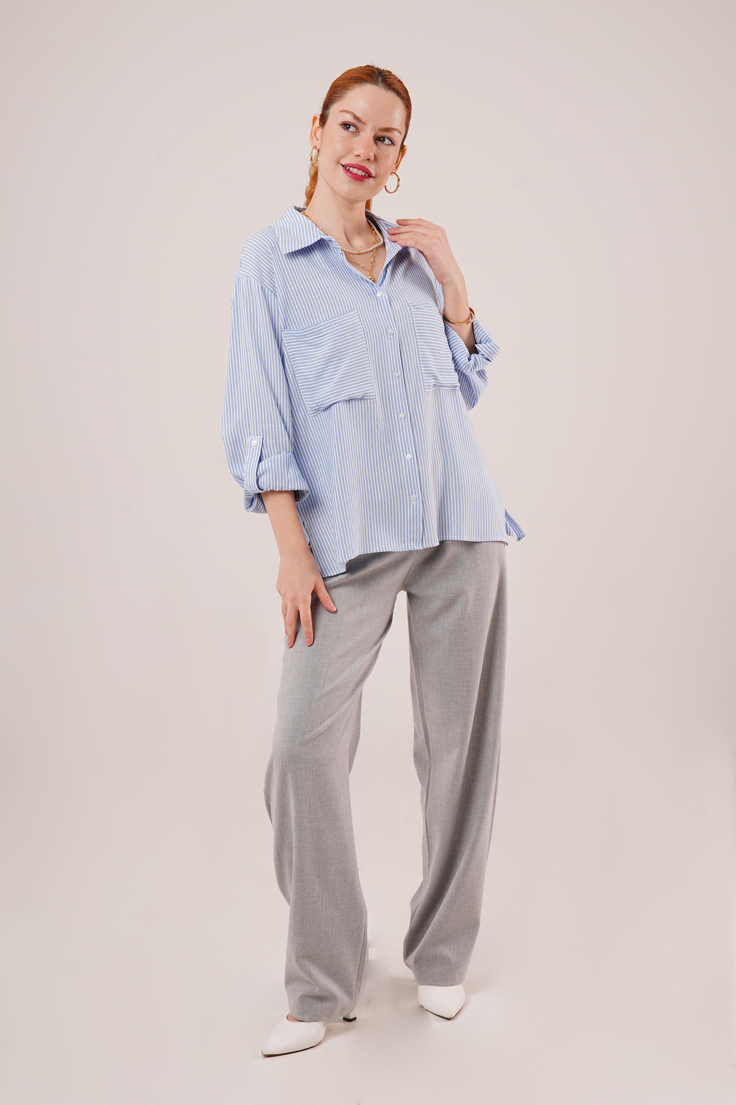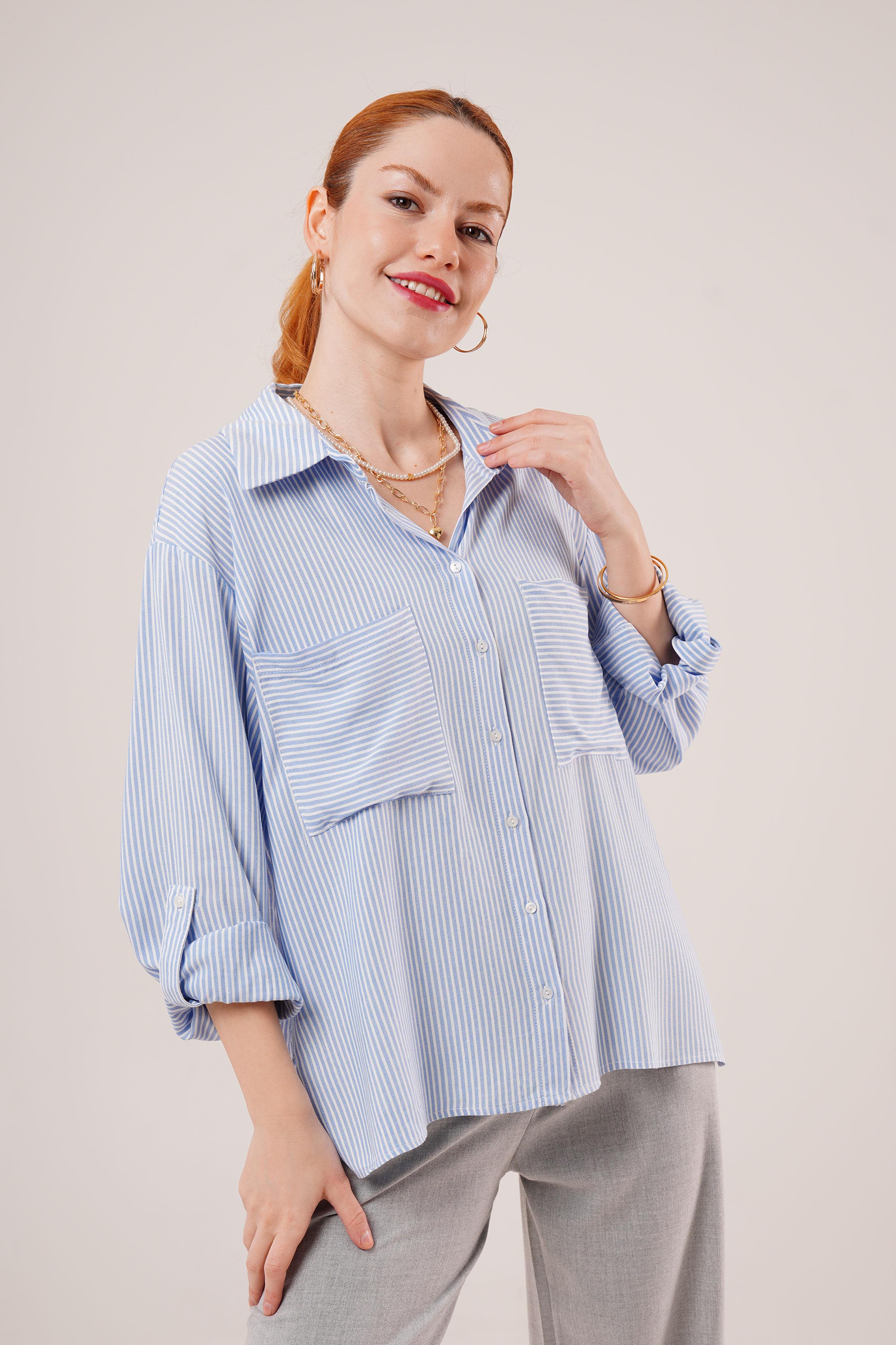Yarasa Kol Çizgili Cep Detaylı Toptan Mavi Gömlek