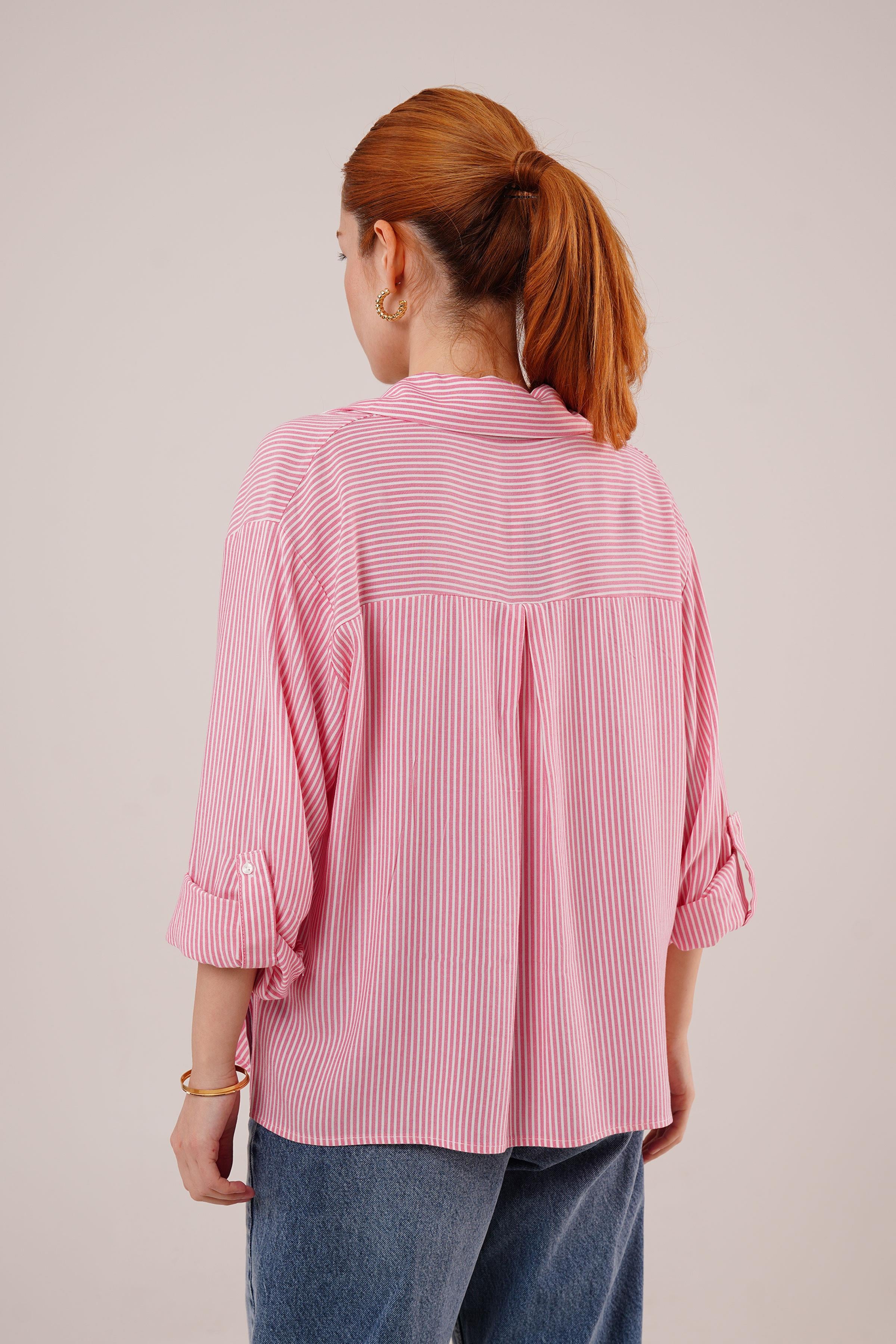Yarasa Kol Çizgili Cep Detaylı Toptan Pembe Gömlek