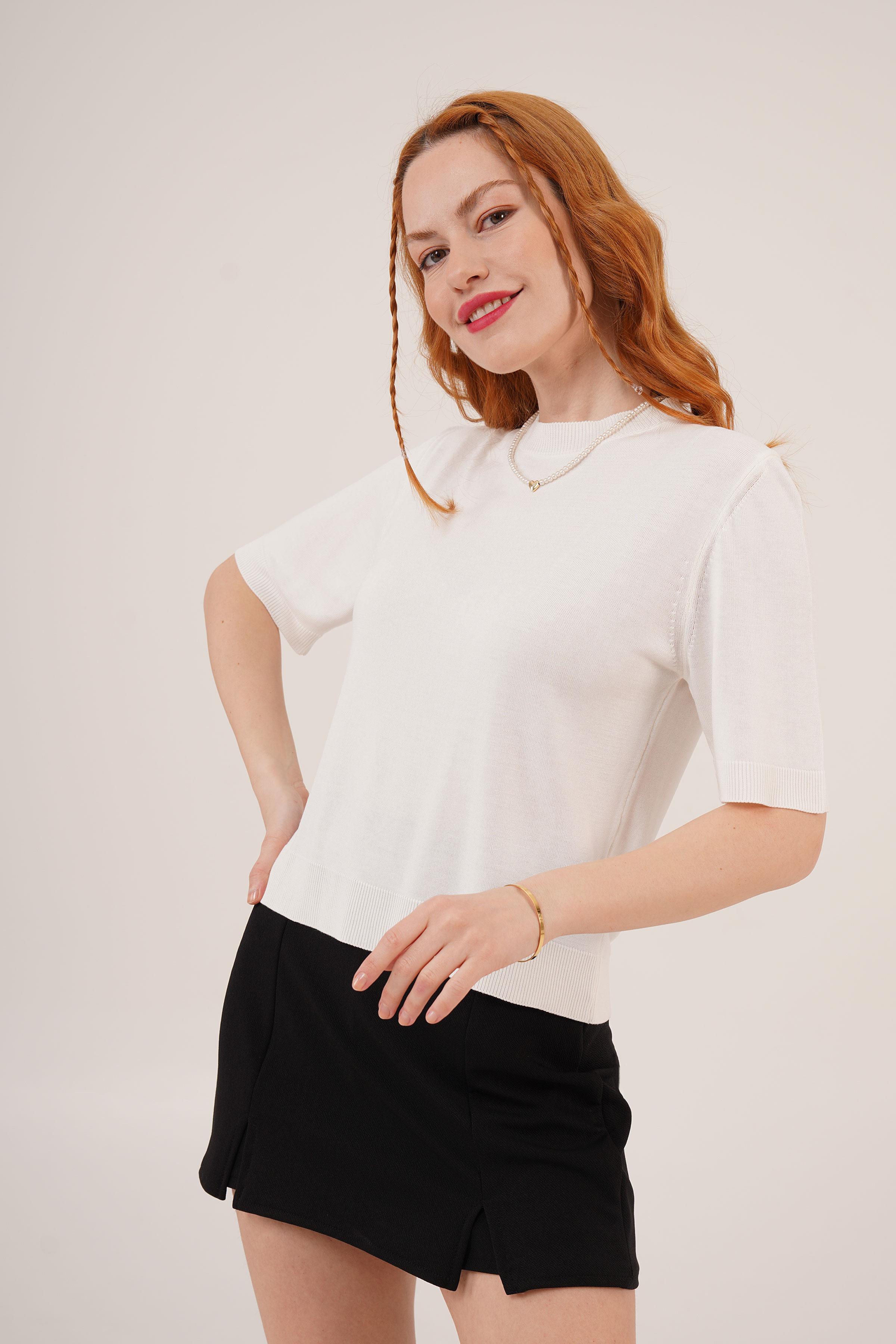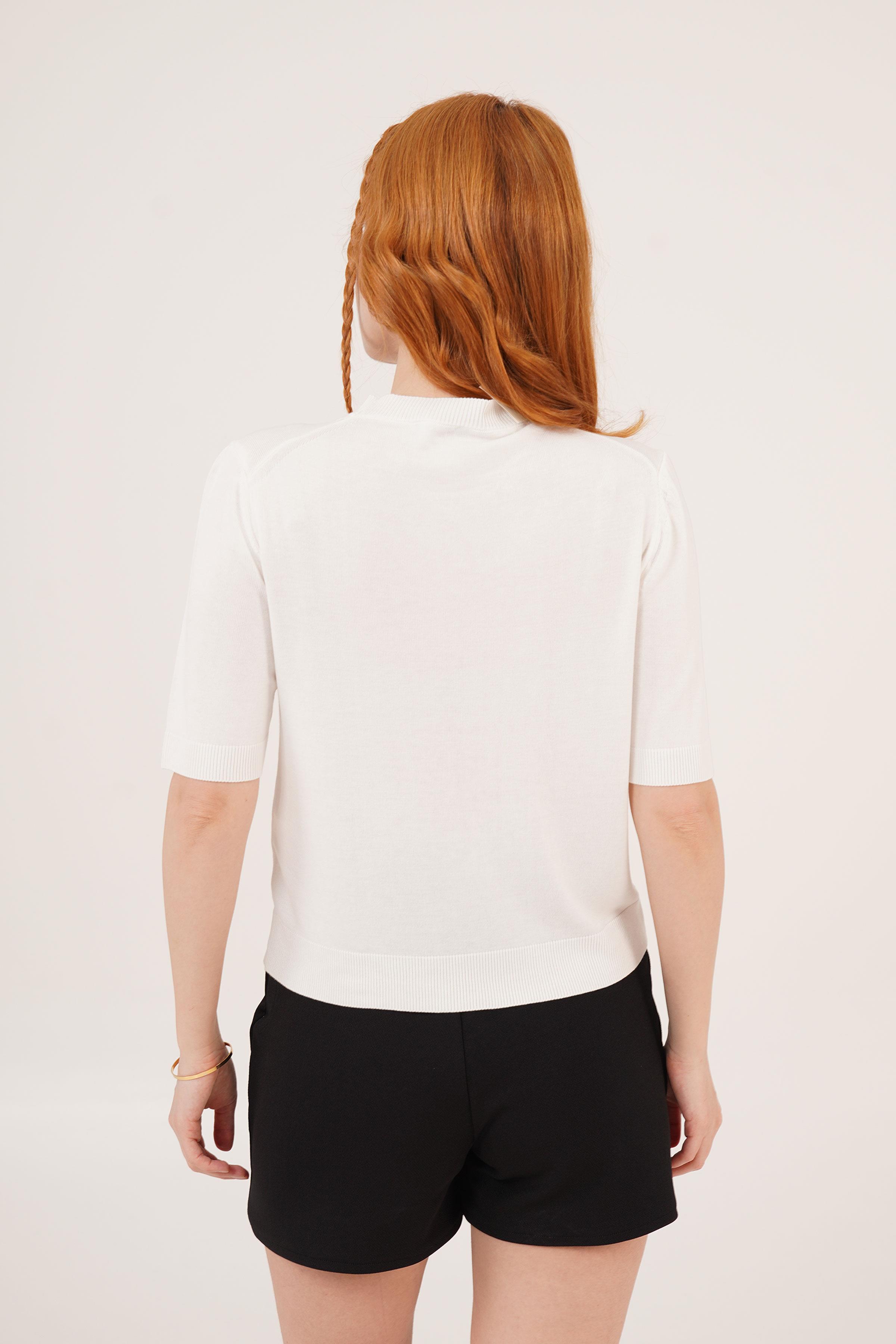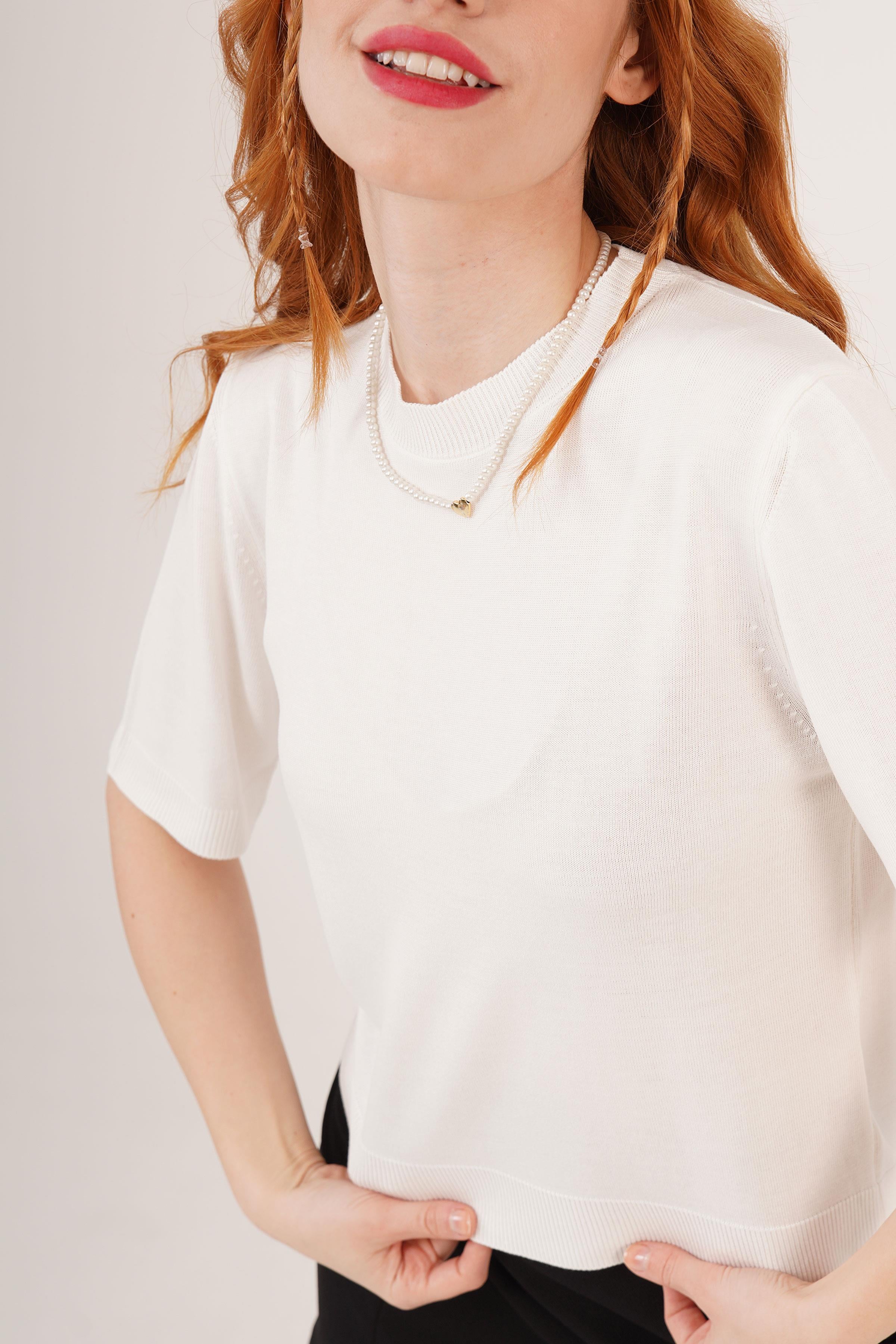 Yarım Kol Yuvarlak Yaka Likralı Toptan İnce Beyaz Triko Bluz