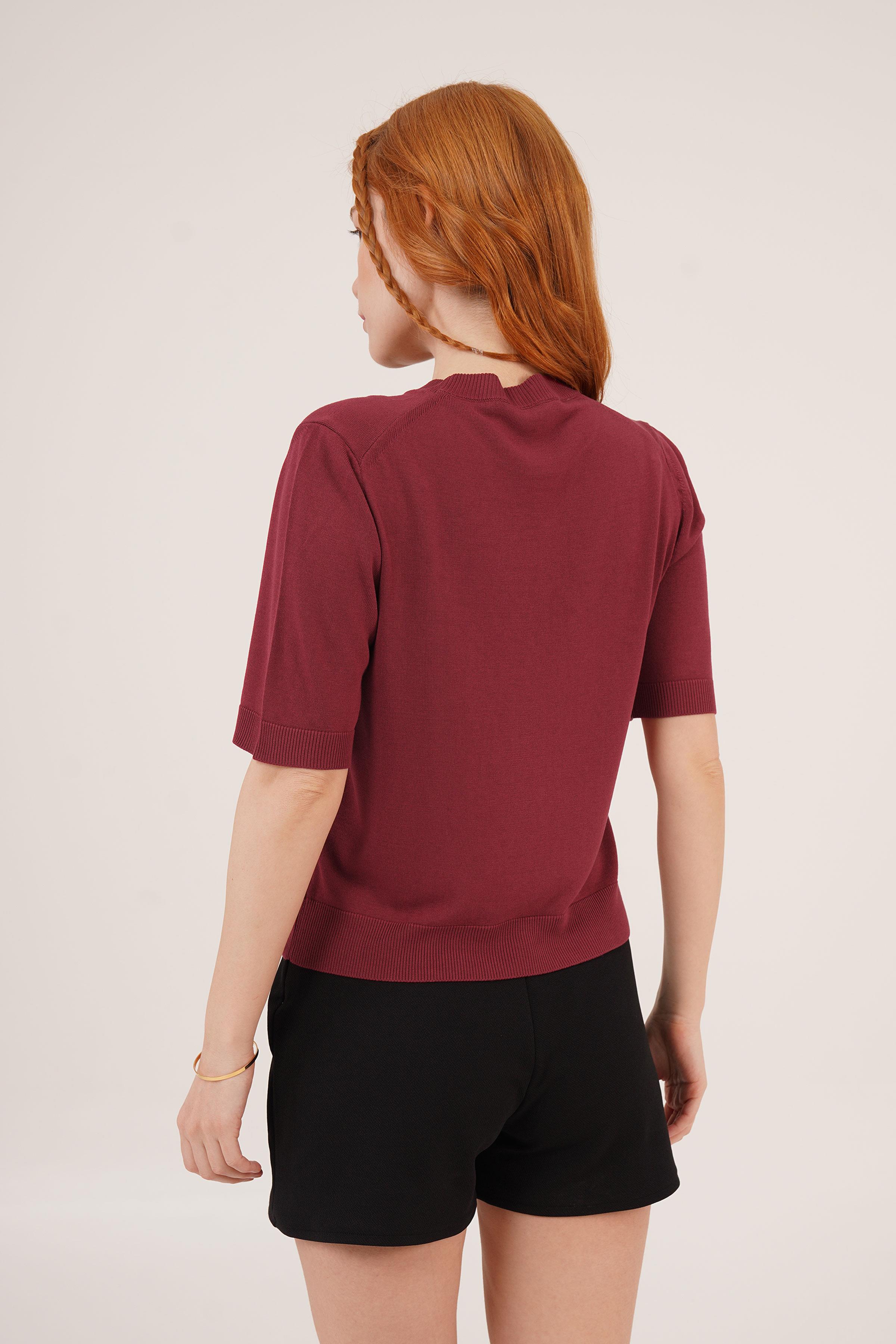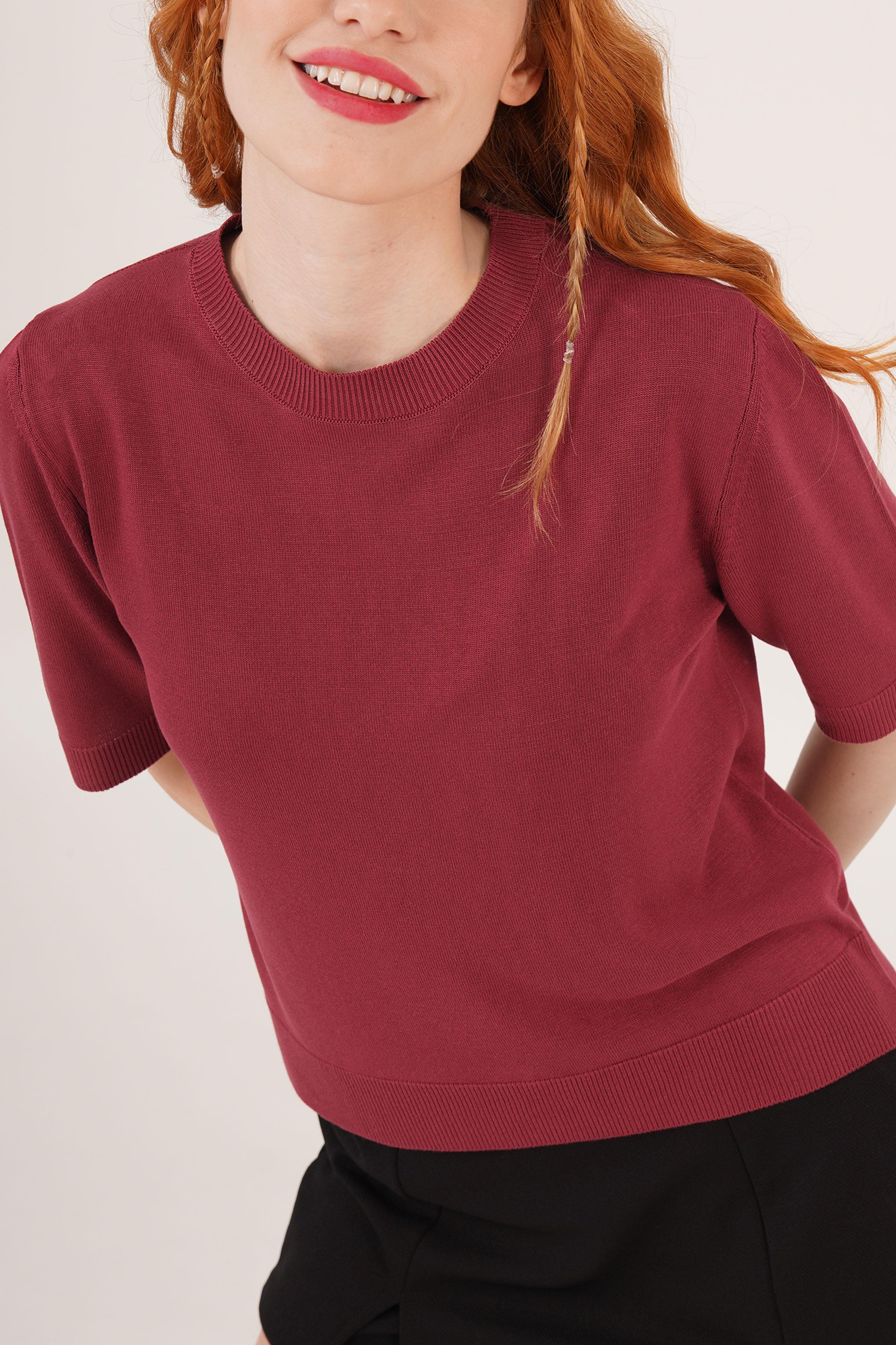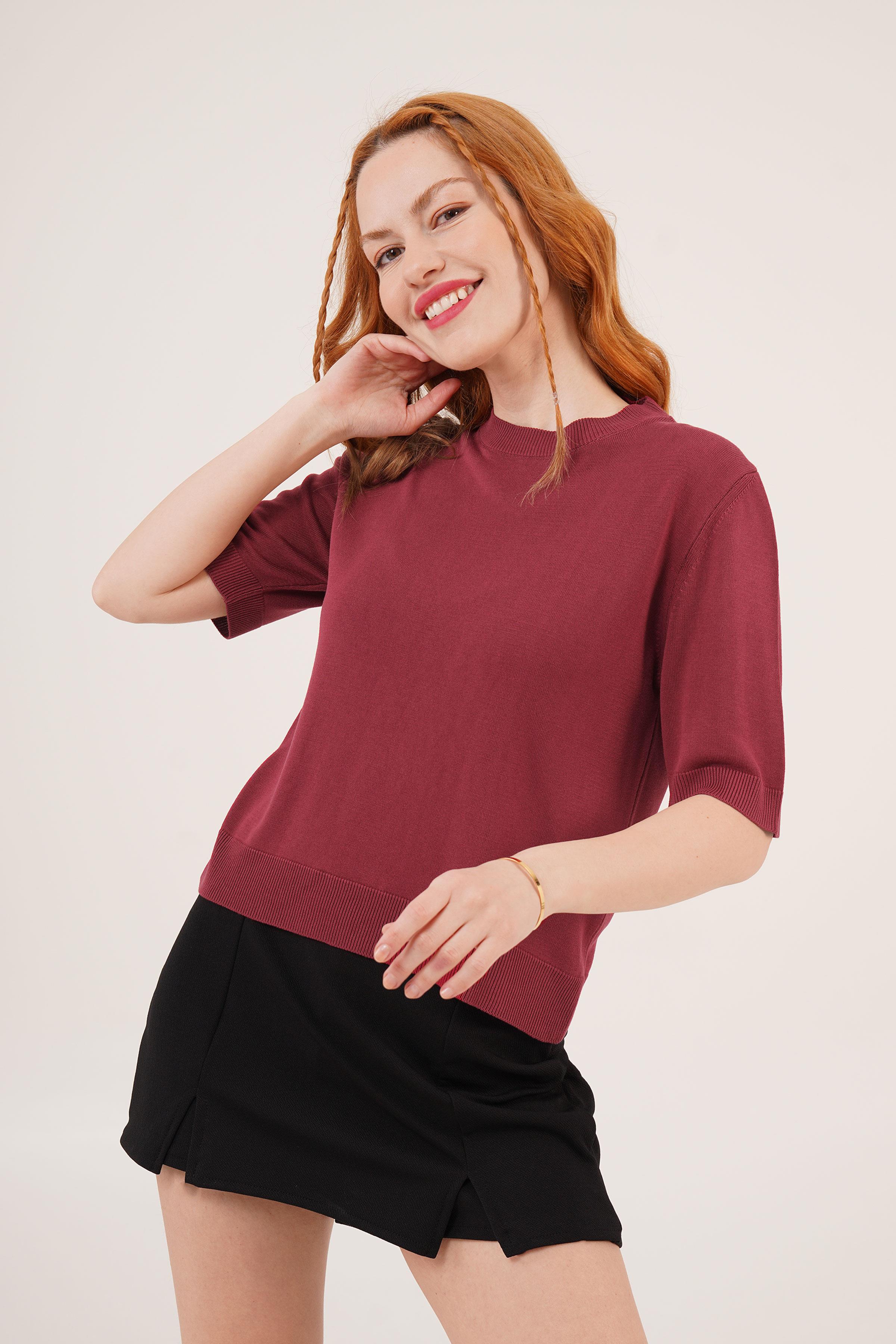Yarım Kol Yuvarlak Yaka Likralı Toptan İnce Bordo Triko Bluz