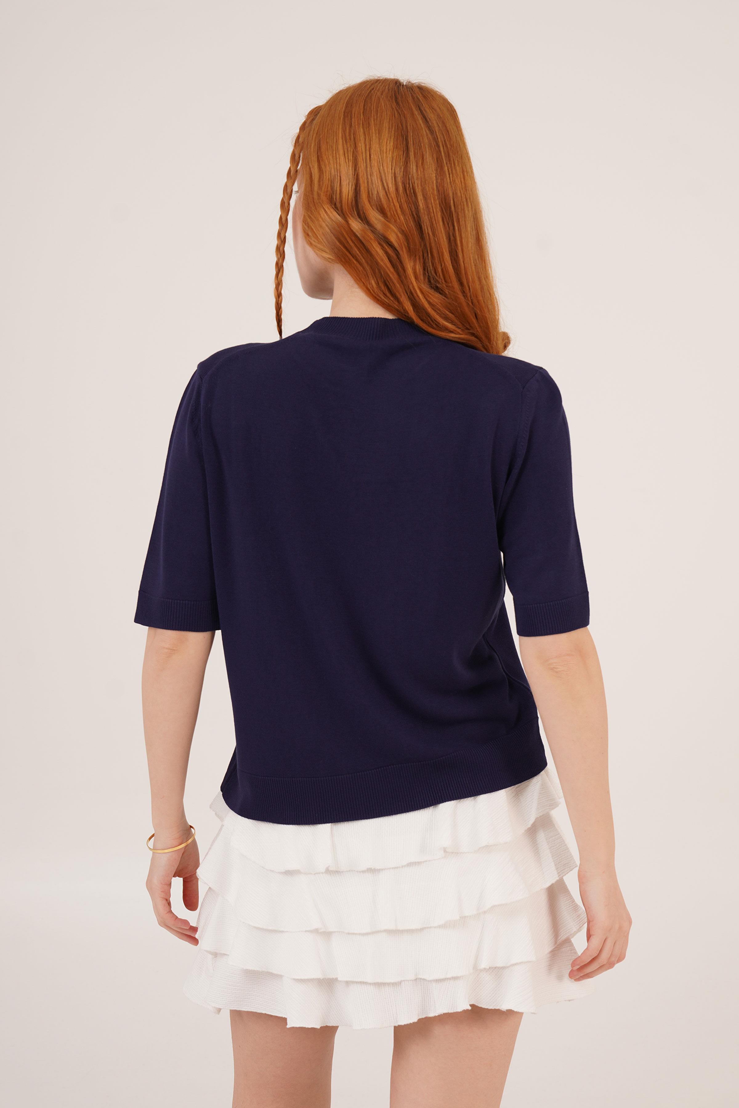Yarım Kol Yuvarlak Yaka Likralı Toptan İnce Lacivert Triko Bluz